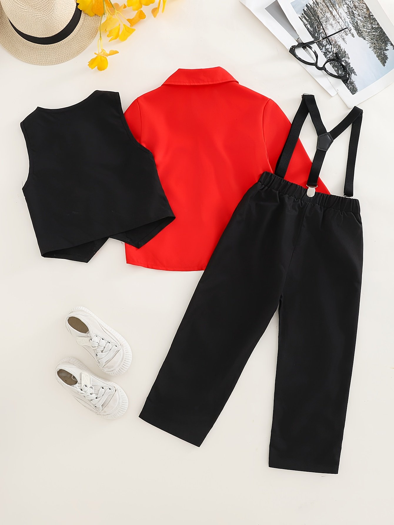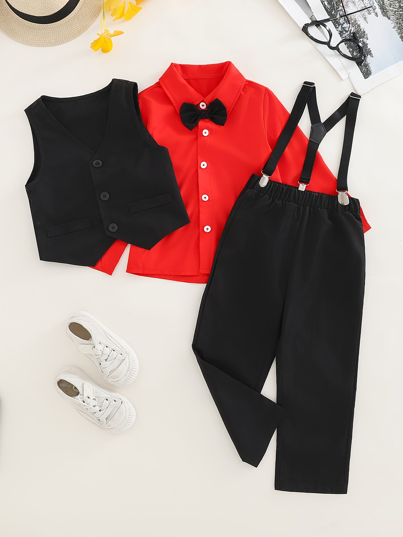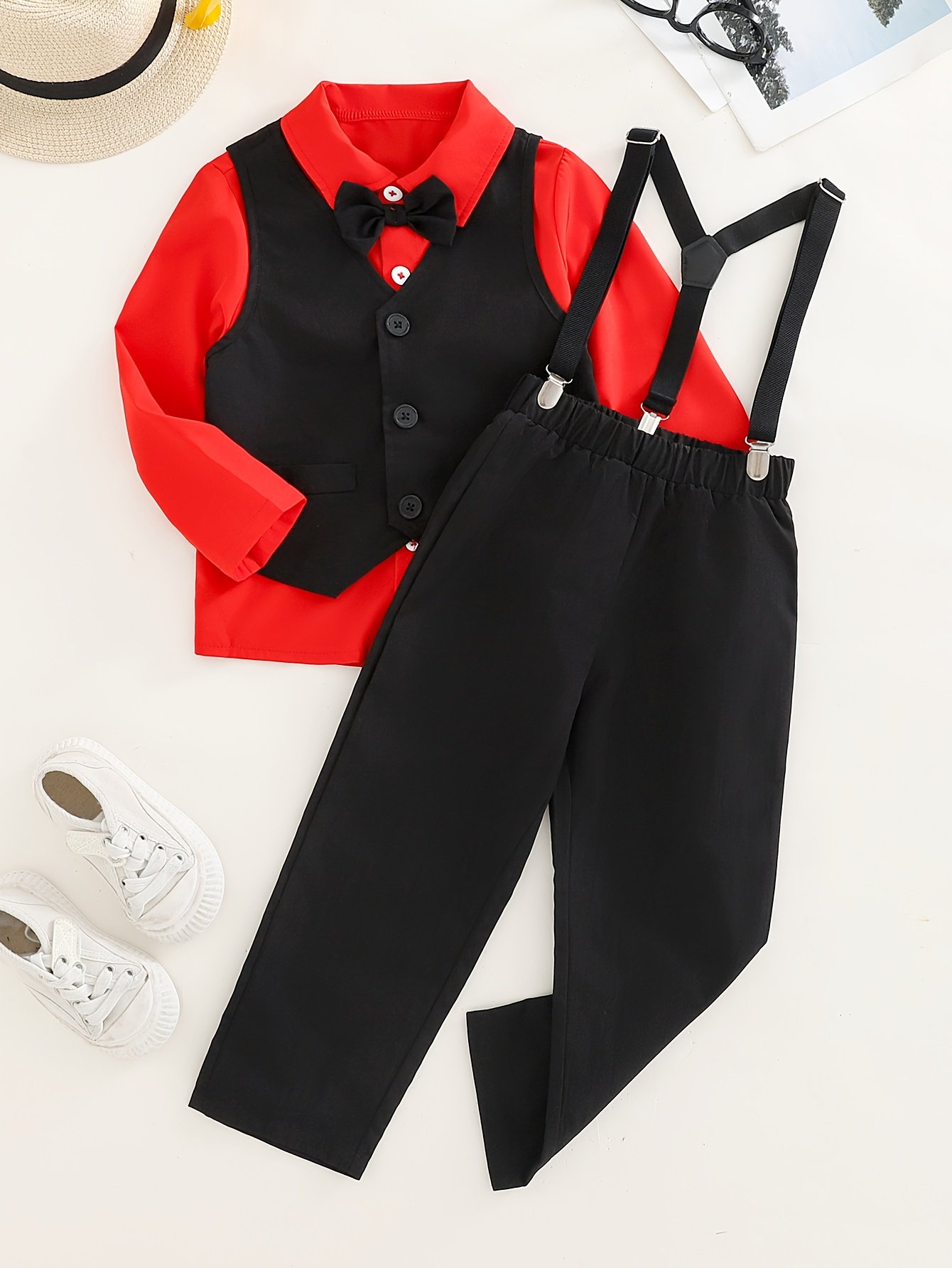 - Complete and Charming Look: The set includes an elegant long-sleeved red shirt, a classic black vest, comfortable black trousers, and a black bow tie, providing a complete and ready-to-wear outfit without the hassle of searching for matching pieces.