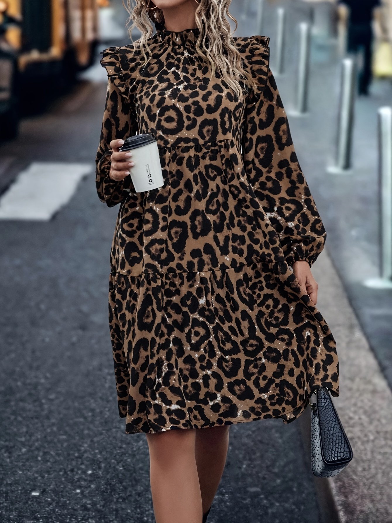 Get ready to steal the spotlight and turn heads with the elegant leopard dress, an artistic masterpiece designed to highlight your beauty and give you an unforgettable modern look. This dress combines the boldness of the timeless leopard print with the classic elegance of a high collar and long sleeves, making it the perfect choice for every woman seeking distinction and sophistication simultaneously.