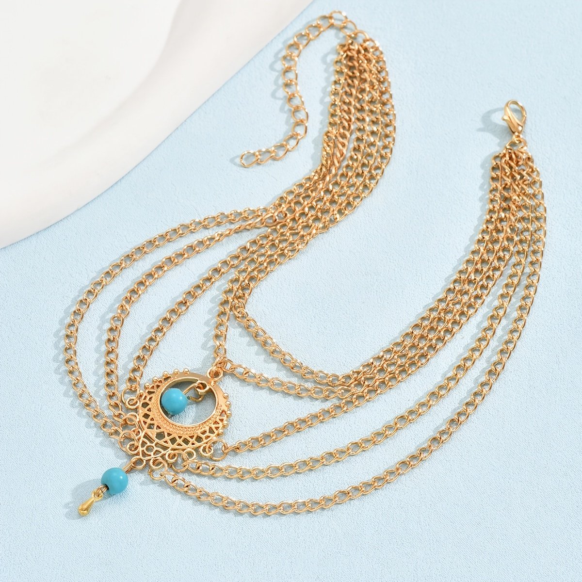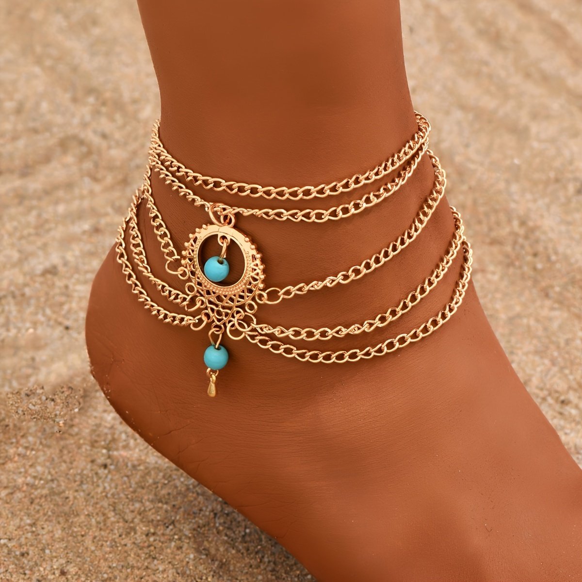- Stunning Teardrop Turquoise: The anklet is adorned with a natural turquoise stone in a unique “teardrop” cut, adding a captivating blue-green hue and symbolizing clarity and serenity to your ensemble.