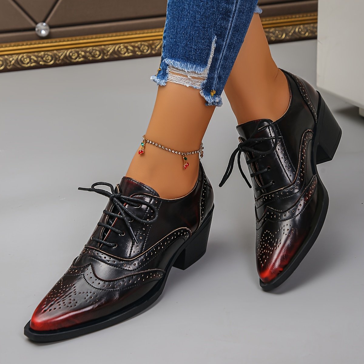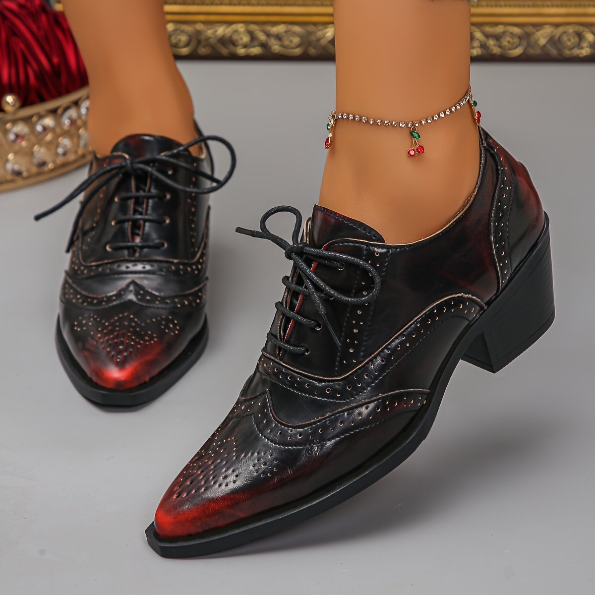 - Iconic Design with a Modern Touch: These glossy black brogue shoes are adorned with daring red accents, featuring a pointed toe and a chunky heel that elegantly combines classic and contemporary styles. The lace-up design ensures a perfect, secure fit.