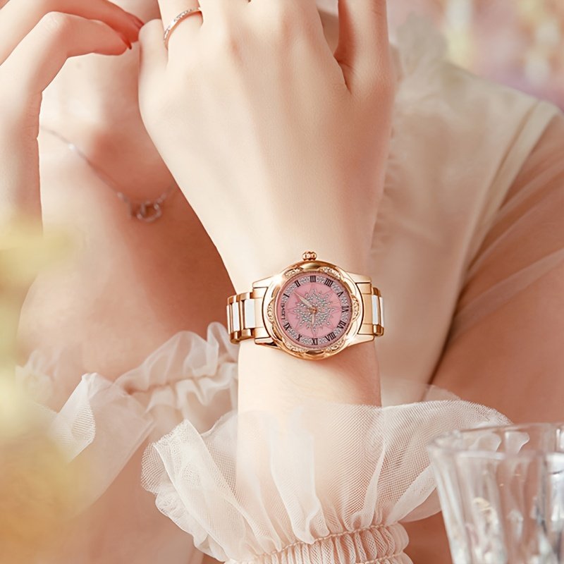 - Captivating Camellia Dial with Rhinestone Accents: The round dial features a unique camellia flower design adorned with sparkling rhinestones, adding a special glitter and irresistible charm to your wrist, embodying the peak of elegance.