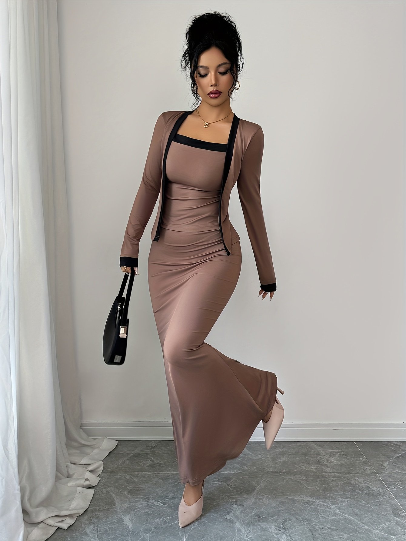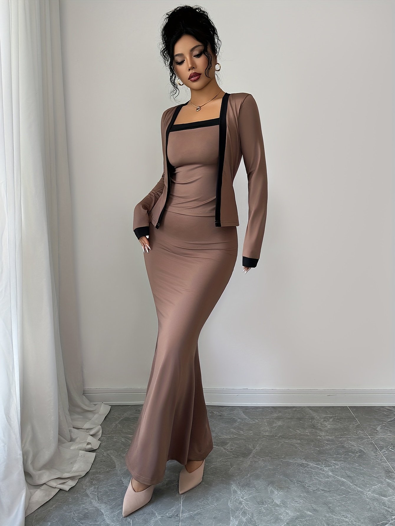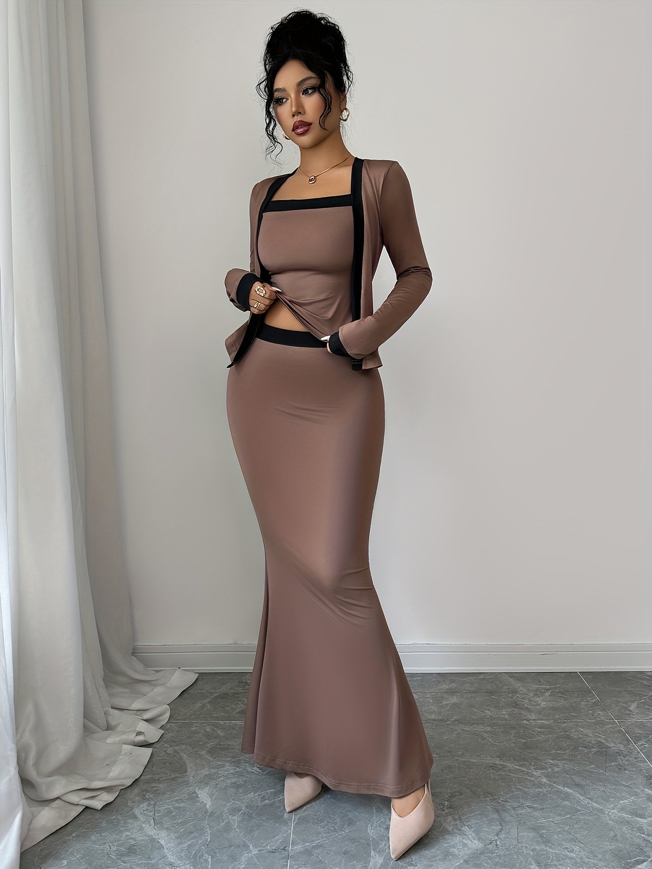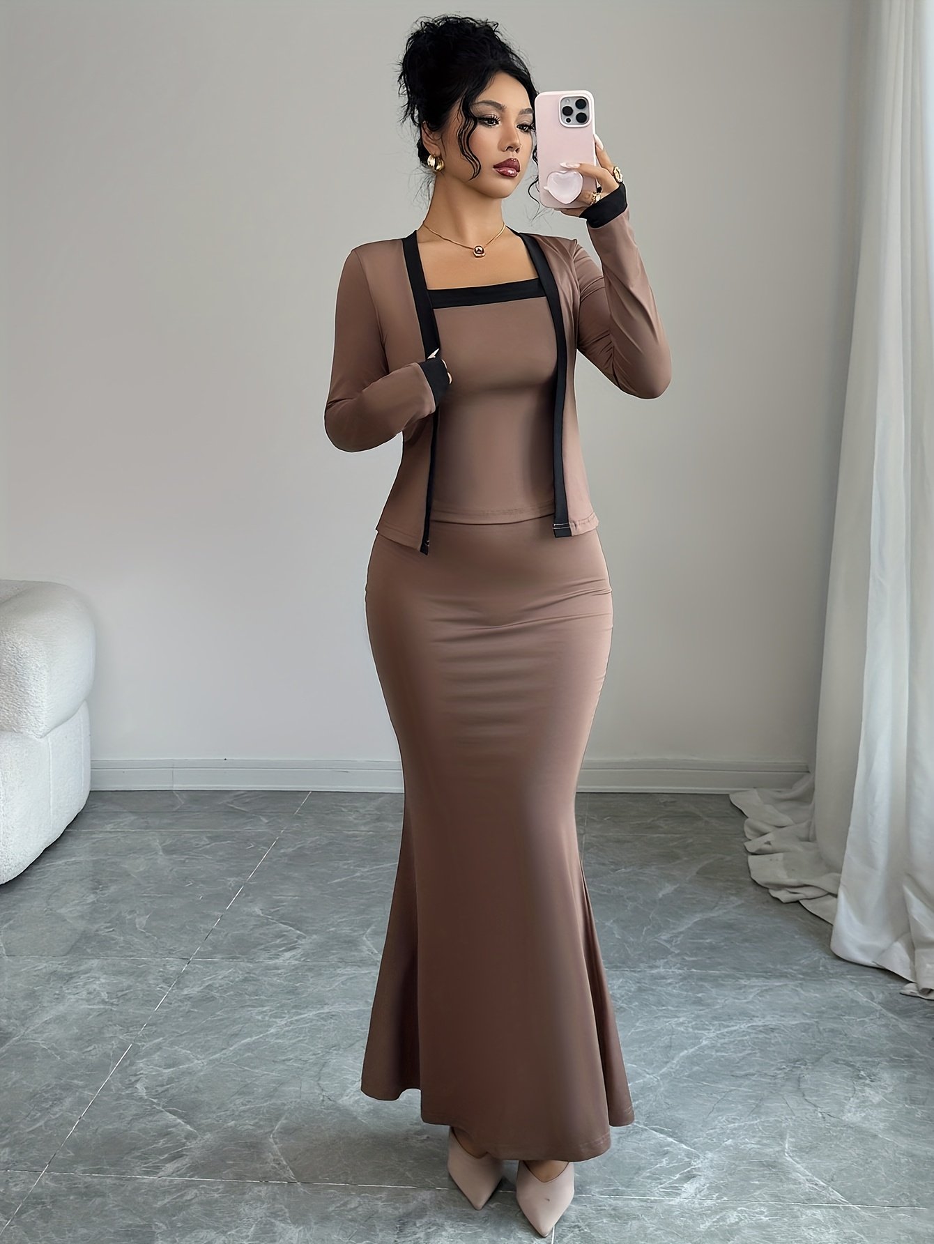 - Captivating Mermaid Design: This two-piece dress set embodies timeless elegance with its alluring mermaid design, featuring an elegant square neckline and long sleeves for a touch of sophistication, and a flowing fishtail skirt that creates a slender silhouette and a regal appearance.