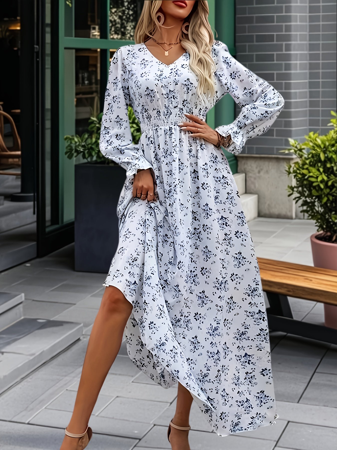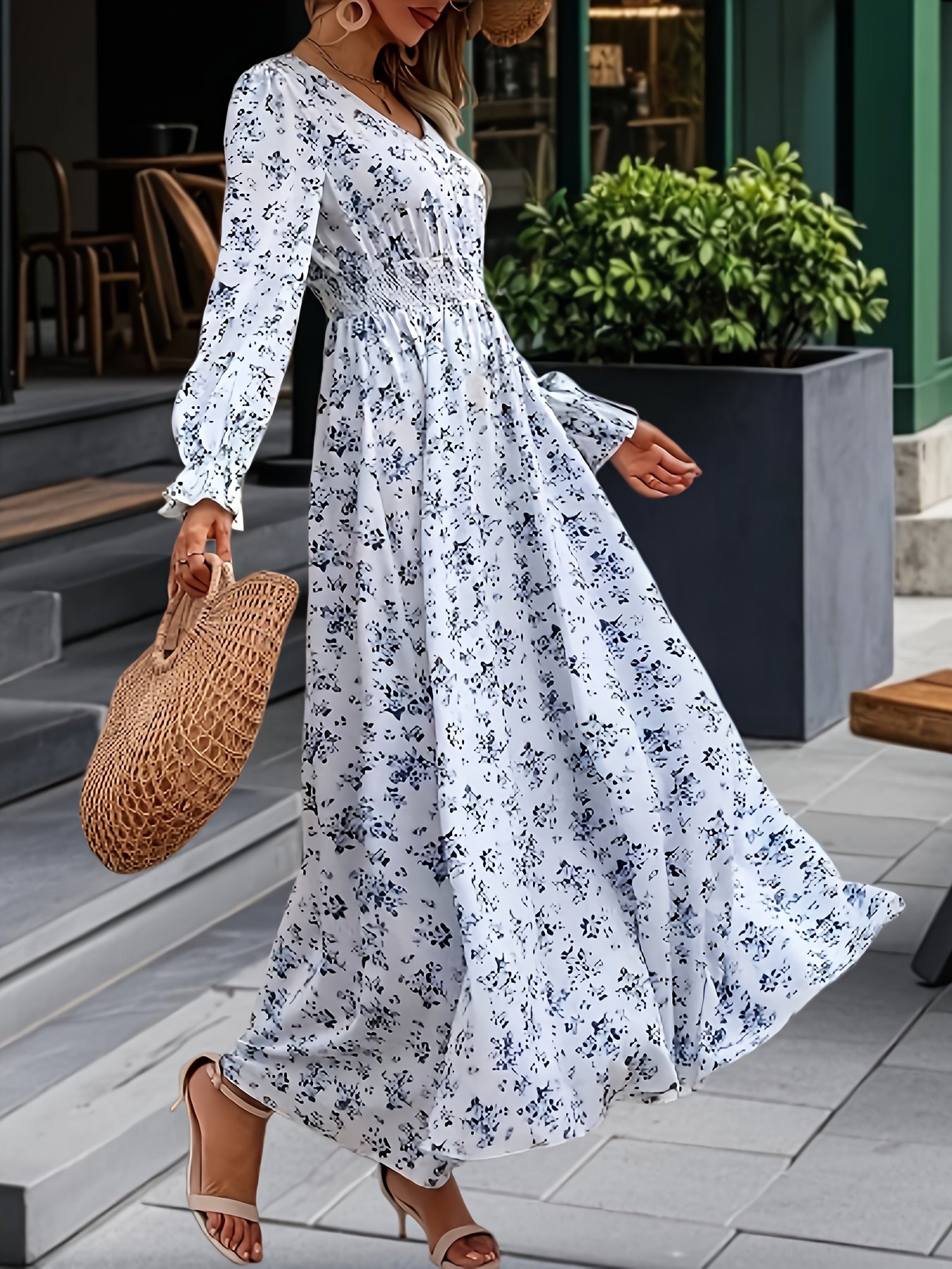 Steal the spotlight and let your elegance speak with this long floral peplum dress, designed to give you an unforgettable look. This captivating dress combines sophistication and modernity, making it an indispensable addition to your wardrobe for the spring, summer, and autumn seasons.
