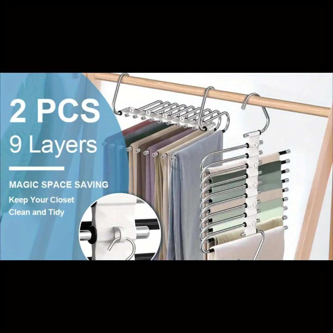 - Maximize Space with Amazing Efficiency: One hanger replaces 9 separate hangers! Increase your closet space by up to 80%, allowing you to store more pants, jeans, athletic wear, and more, in the smallest possible space.