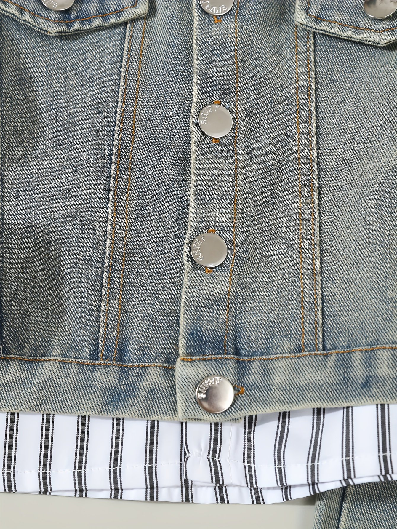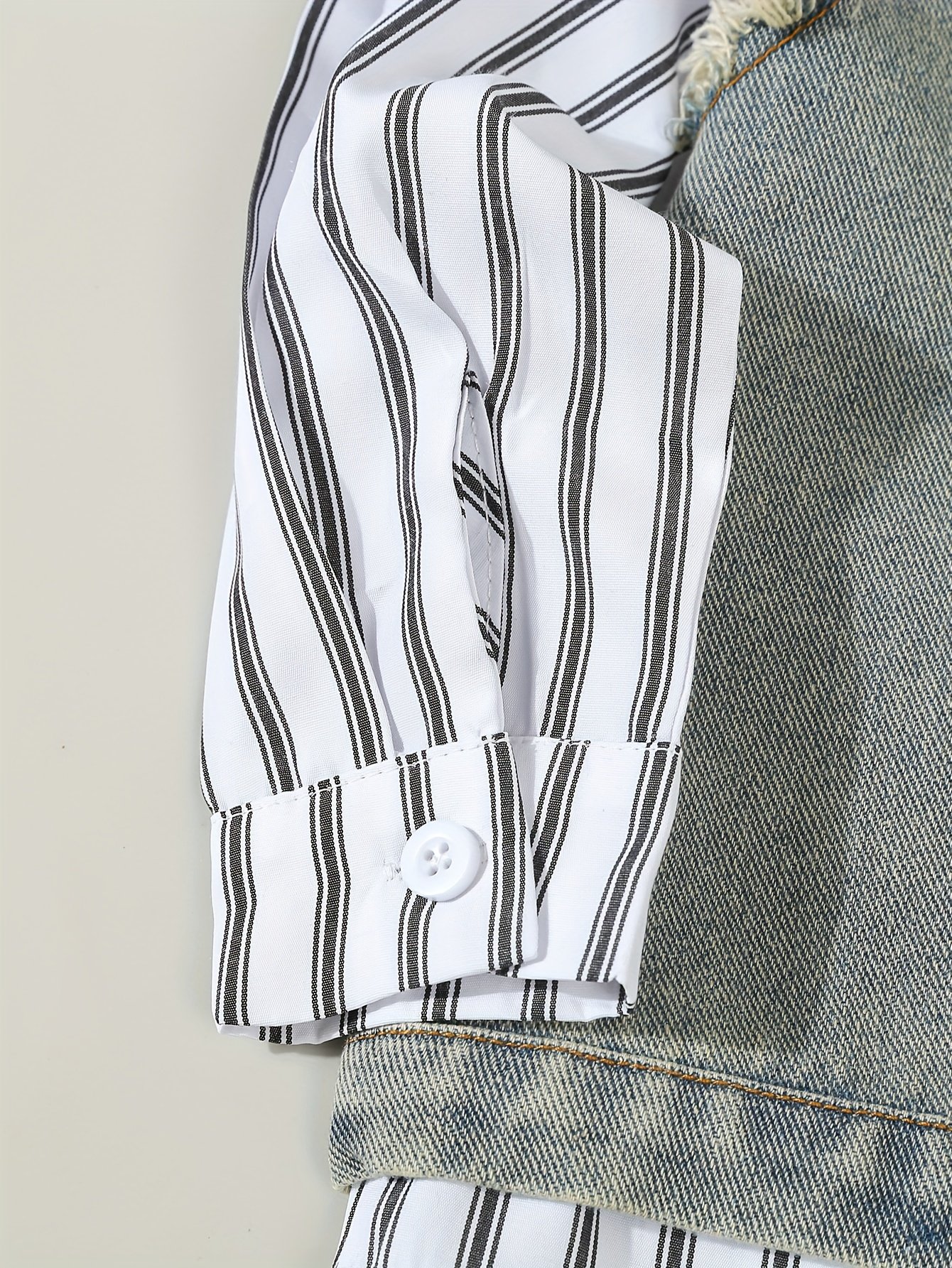 - Complete Set for All Occasions: Consists of a trendy denim jacket, an attractive striped shirt, and comfortable long pants, making it the perfect choice for a stylish casual look or for more special occasions.