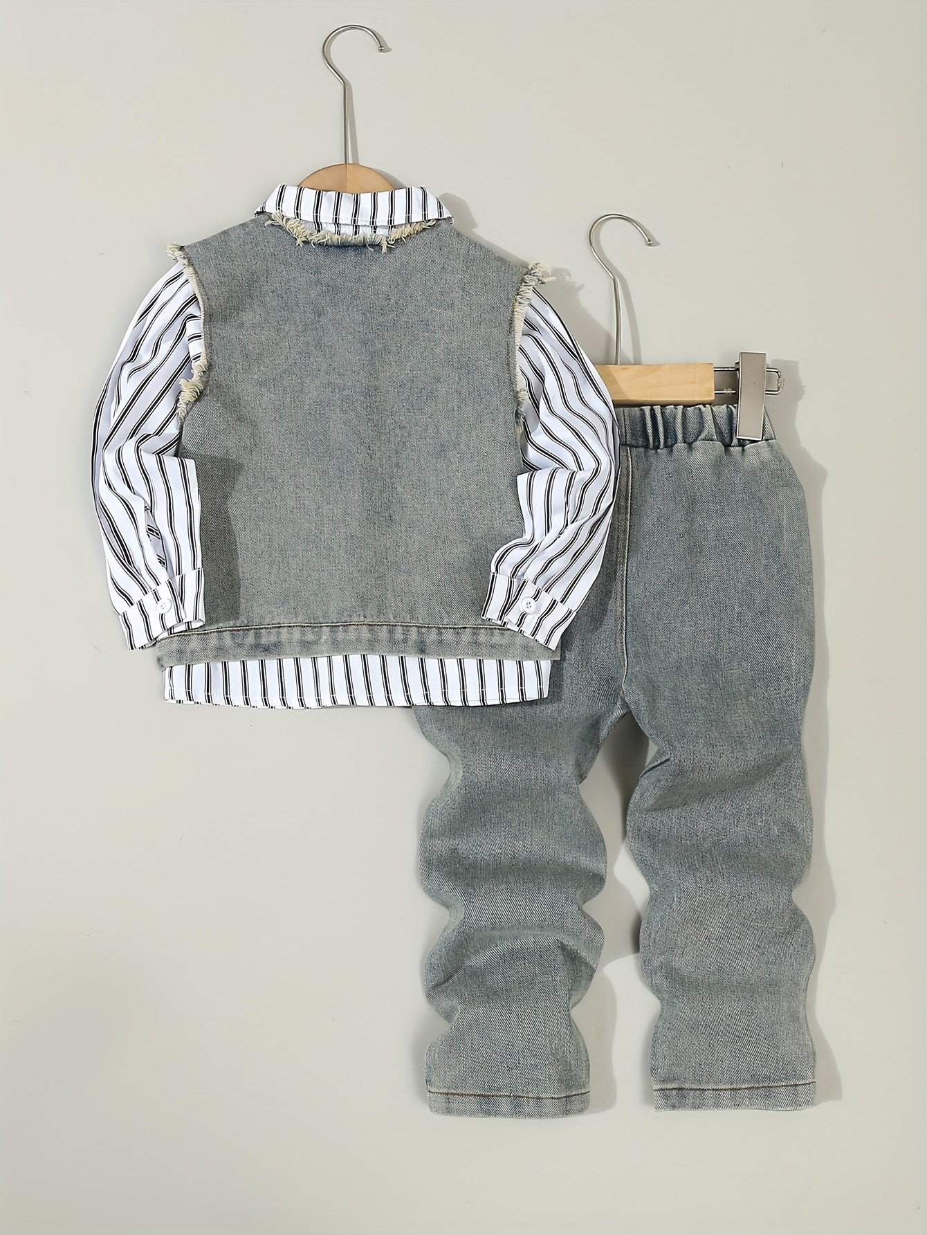 Give your little one an unforgettable look that combines modern elegance with an attractive retro touch with this luxurious three-piece denim set. Specifically designed for boys, this set offers a complete outfit including a stylish denim jacket, a trendy striped shirt, and comfortable long denim pants, perfect for all his outdoor and daily adventures. Let your child shine with confidence and comfort every step of the way!