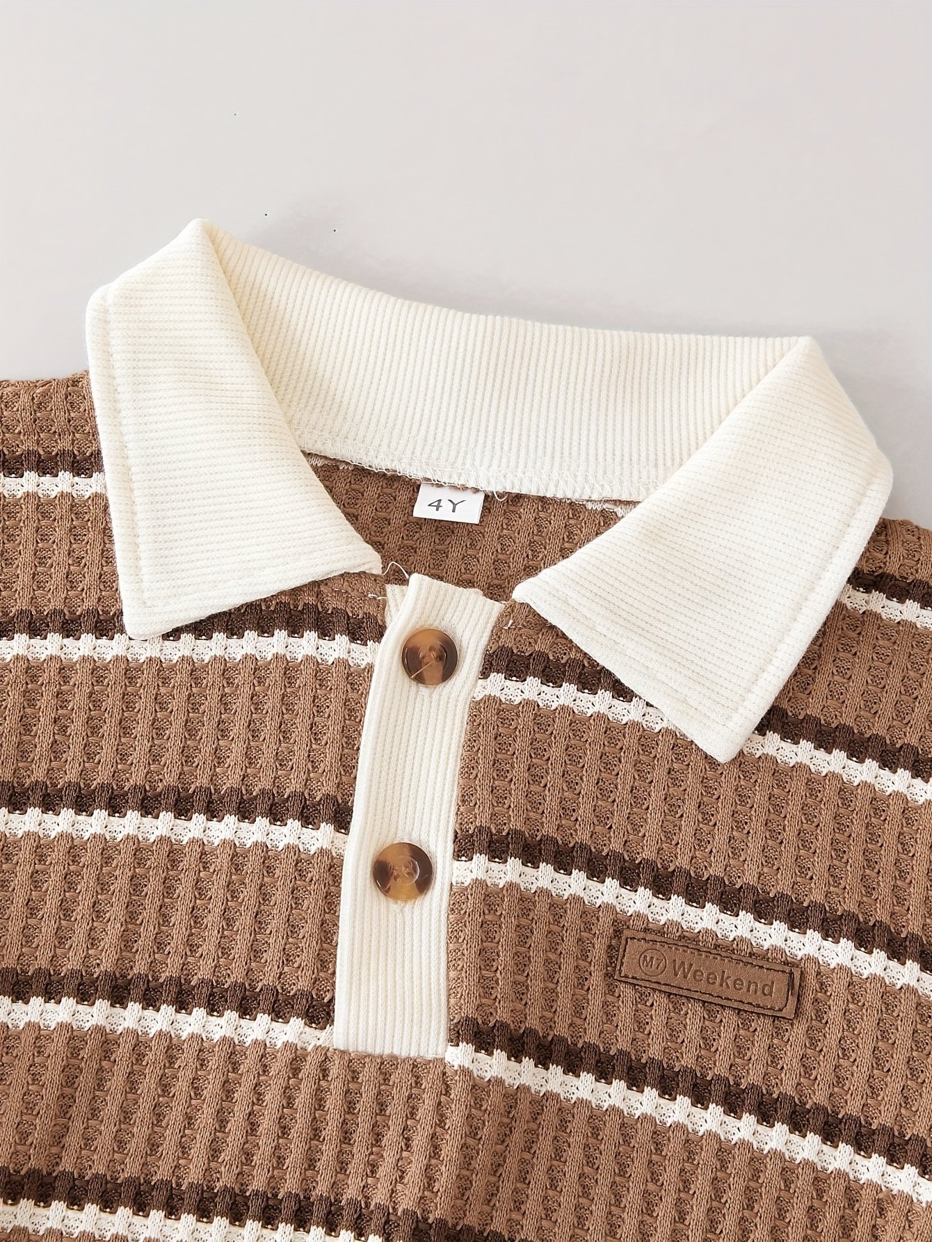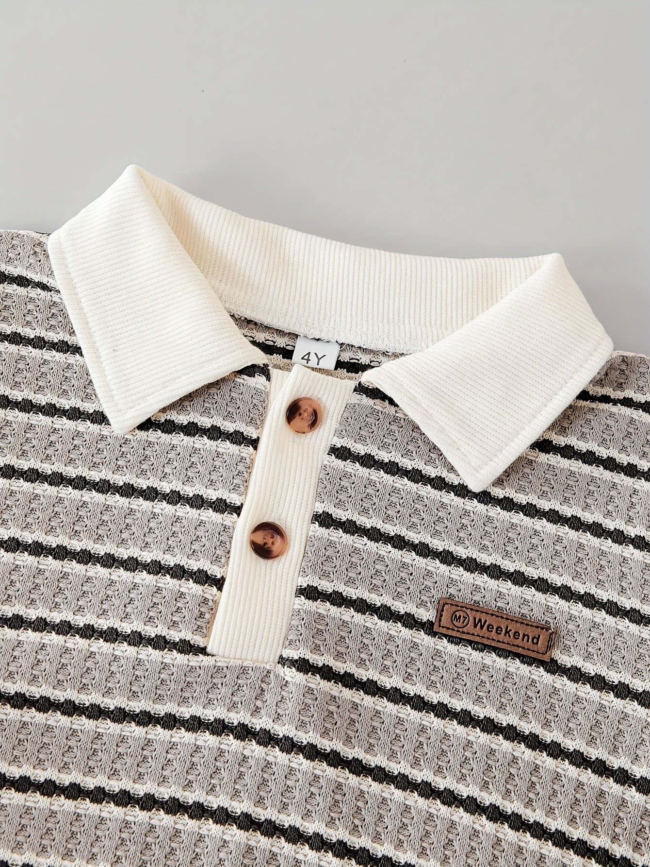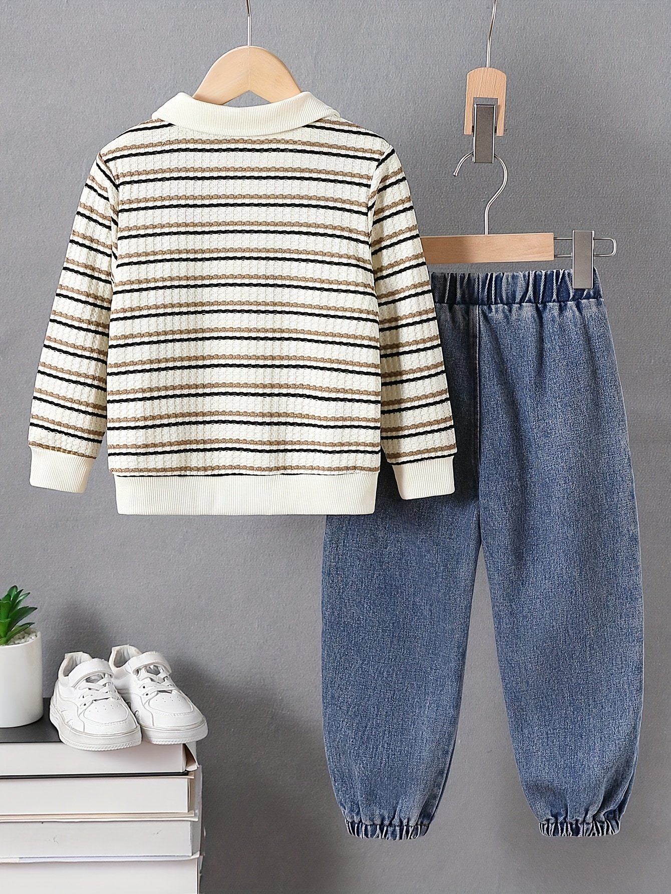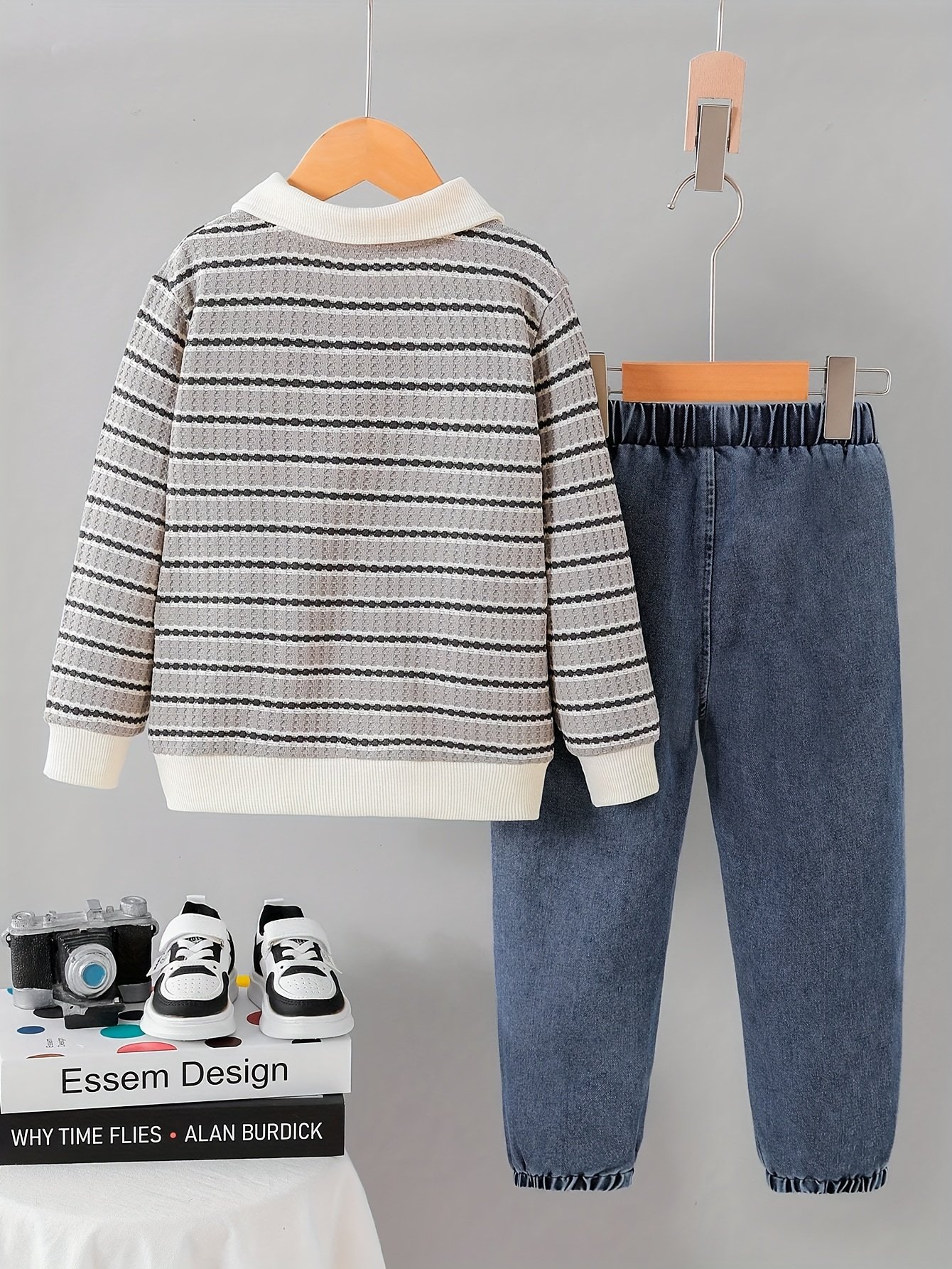 - Modern and Attractive Design: A striped shirt with elegant details like a turn-down collar and half-buttons, paired with distinctively designed jeans gives your child a modern and bold look that suits their vibrant personality.