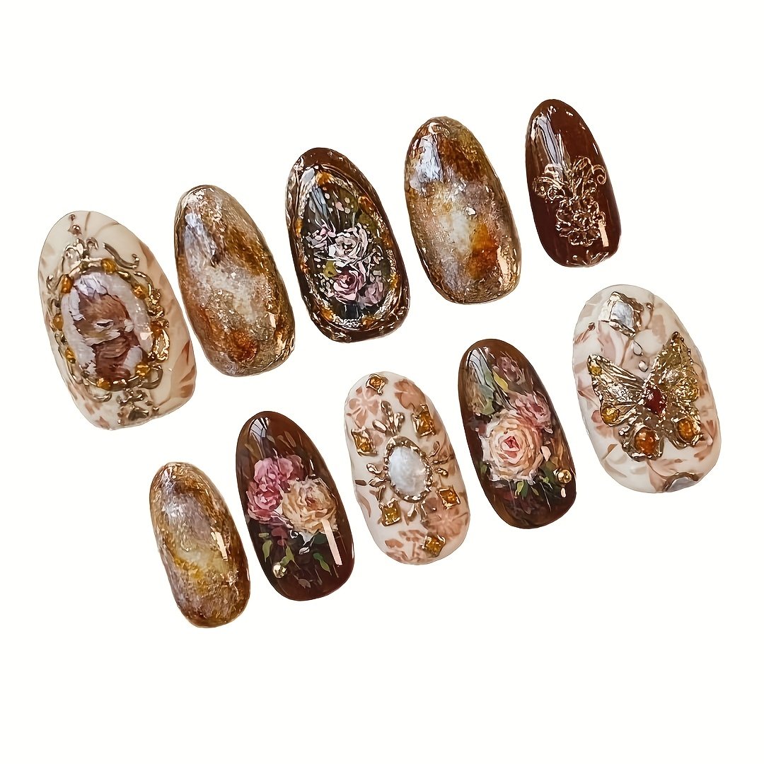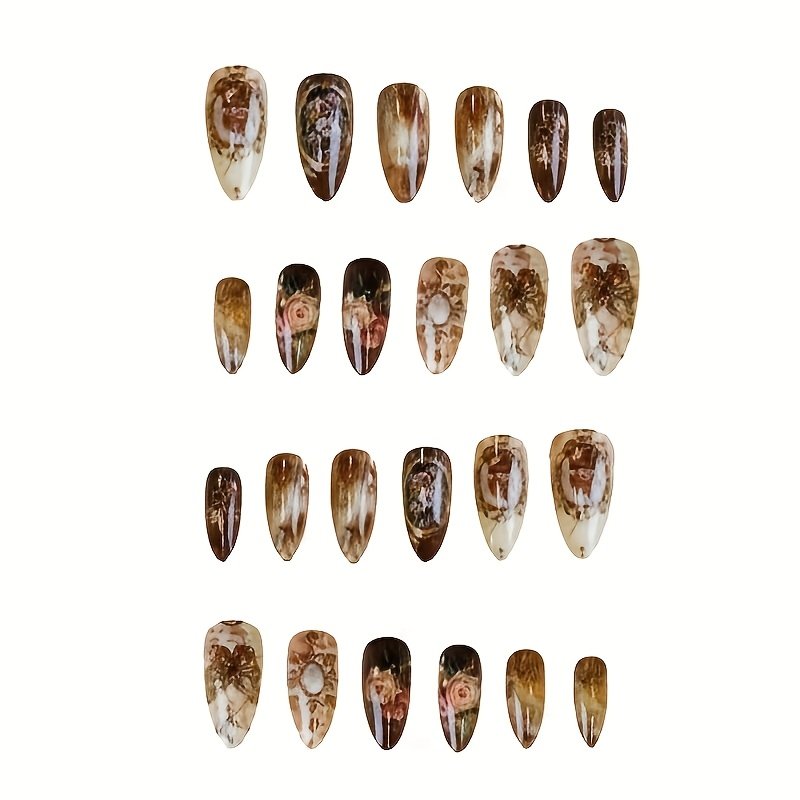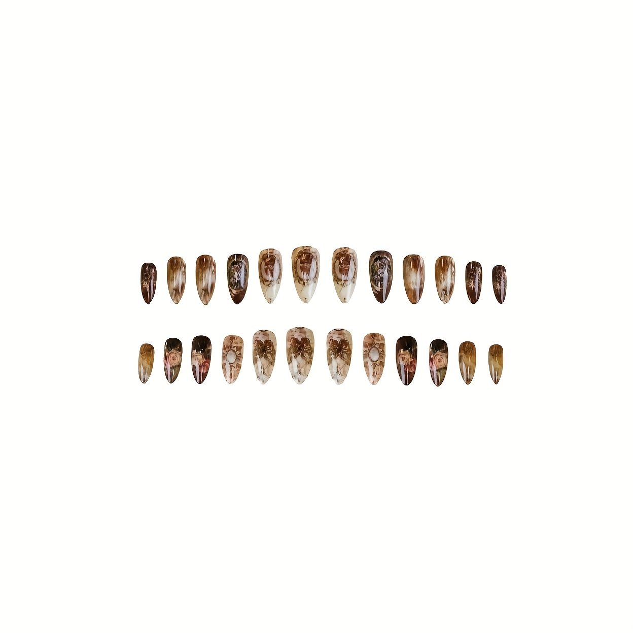 Dazzle everyone with a touch of sophistication and natural beauty with our new collection of artificial nails. These nails are meticulously designed to give you a complete look that combines modern elegance with the charm of nature, perfect for all your spring and summer occasions. Let your nails tell a story of beauty and romance with warm Maillard color gradients and captivating rose and butterfly designs.