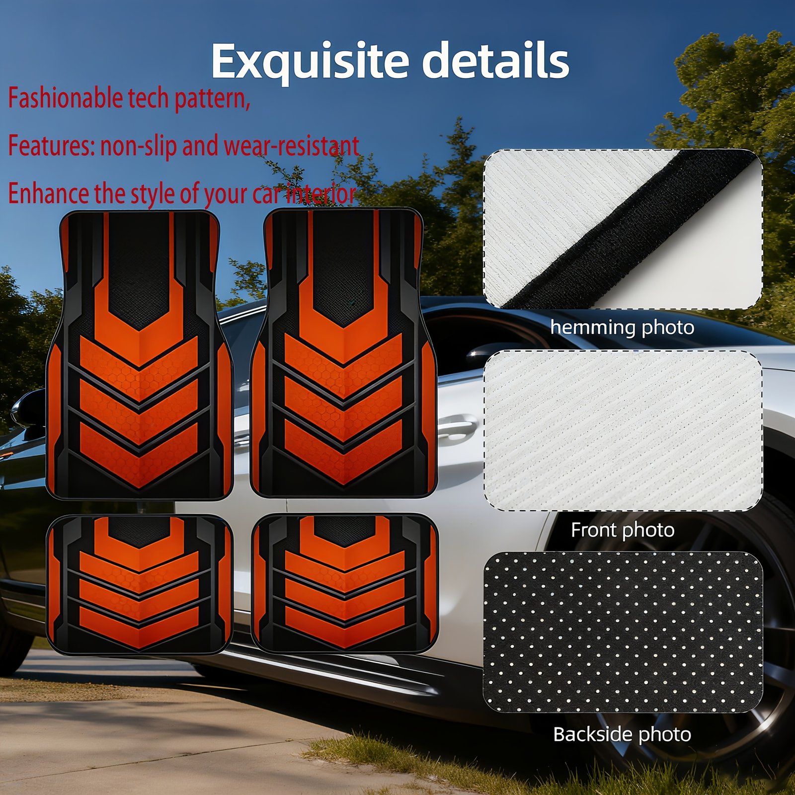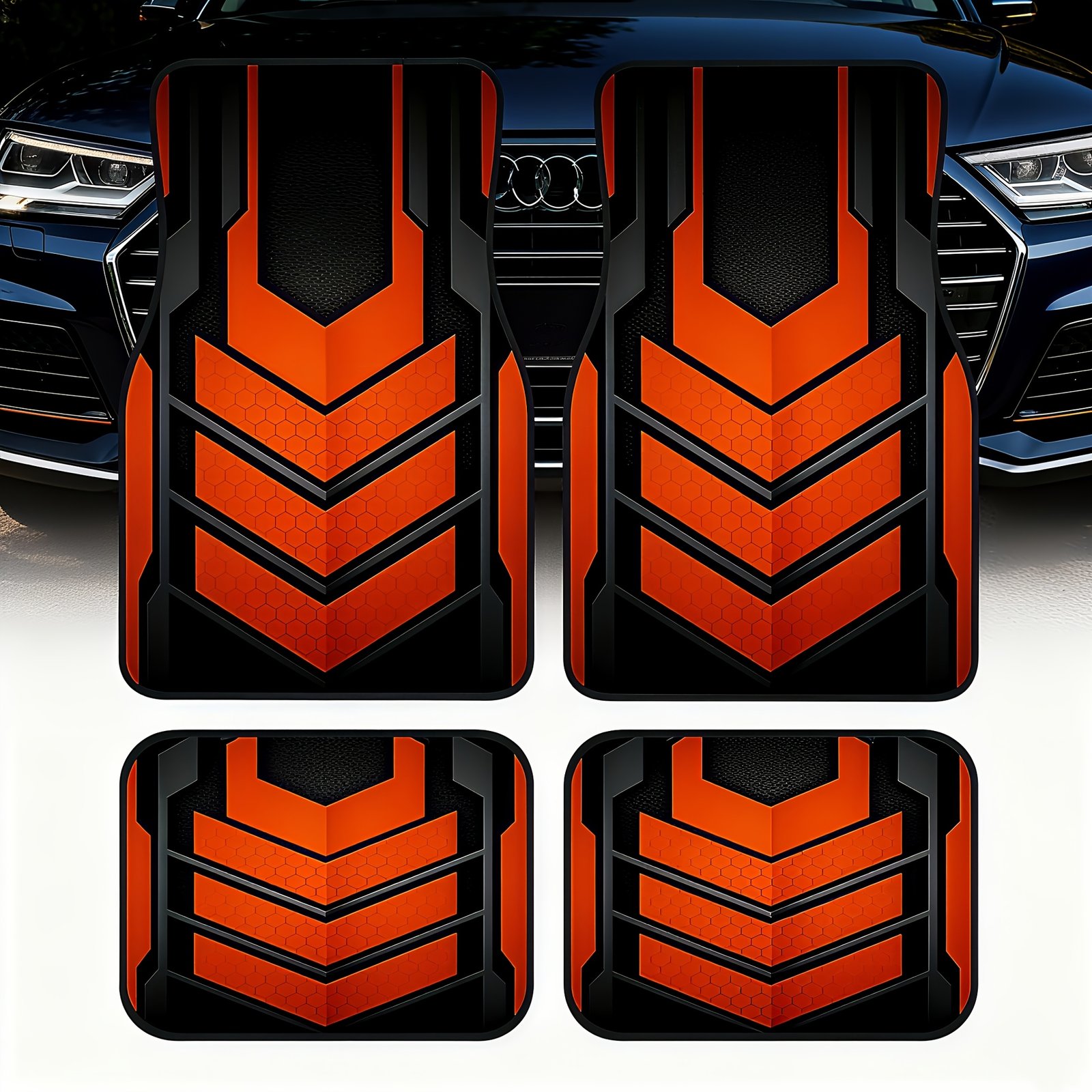 Are you ready to transform your car’s interior into a practical work of art? We present the Orange and Black Mica Design Floor Mat set, specially designed for enthusiasts of excellence and performance. Forget dull traditional mats; this 4-piece set is not just a protector for your car’s floor, but a bold statement that reflects your personality and adds a modern, futuristic touch to every journey. Protect your car and give it an unforgettable look with mats that combine strength and elegance!