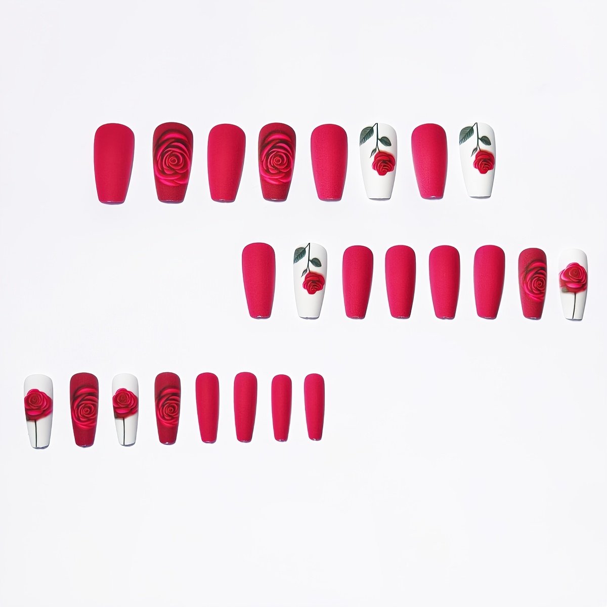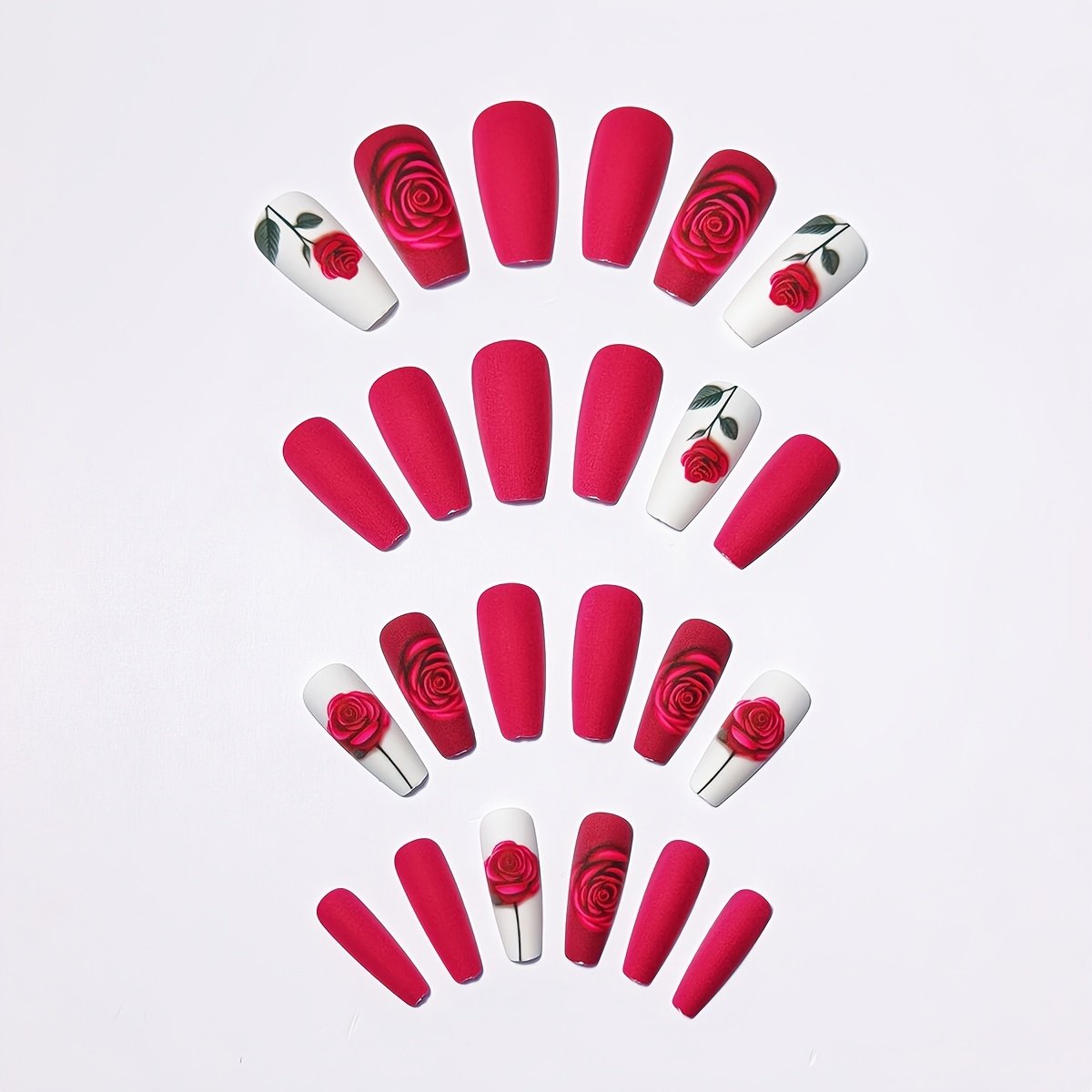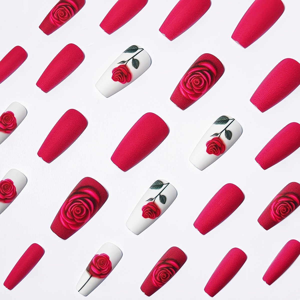 - Captivating Romantic Design: Elegant nails in a rich and attractive red color, adorned with delicate heart and flower patterns that add an unparalleled romantic touch and make your nails a work of art.