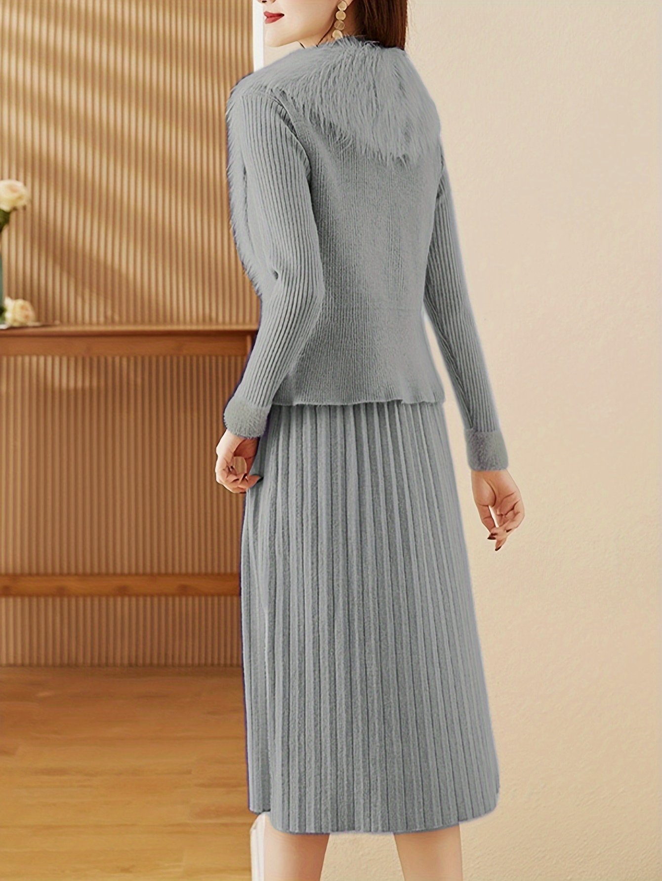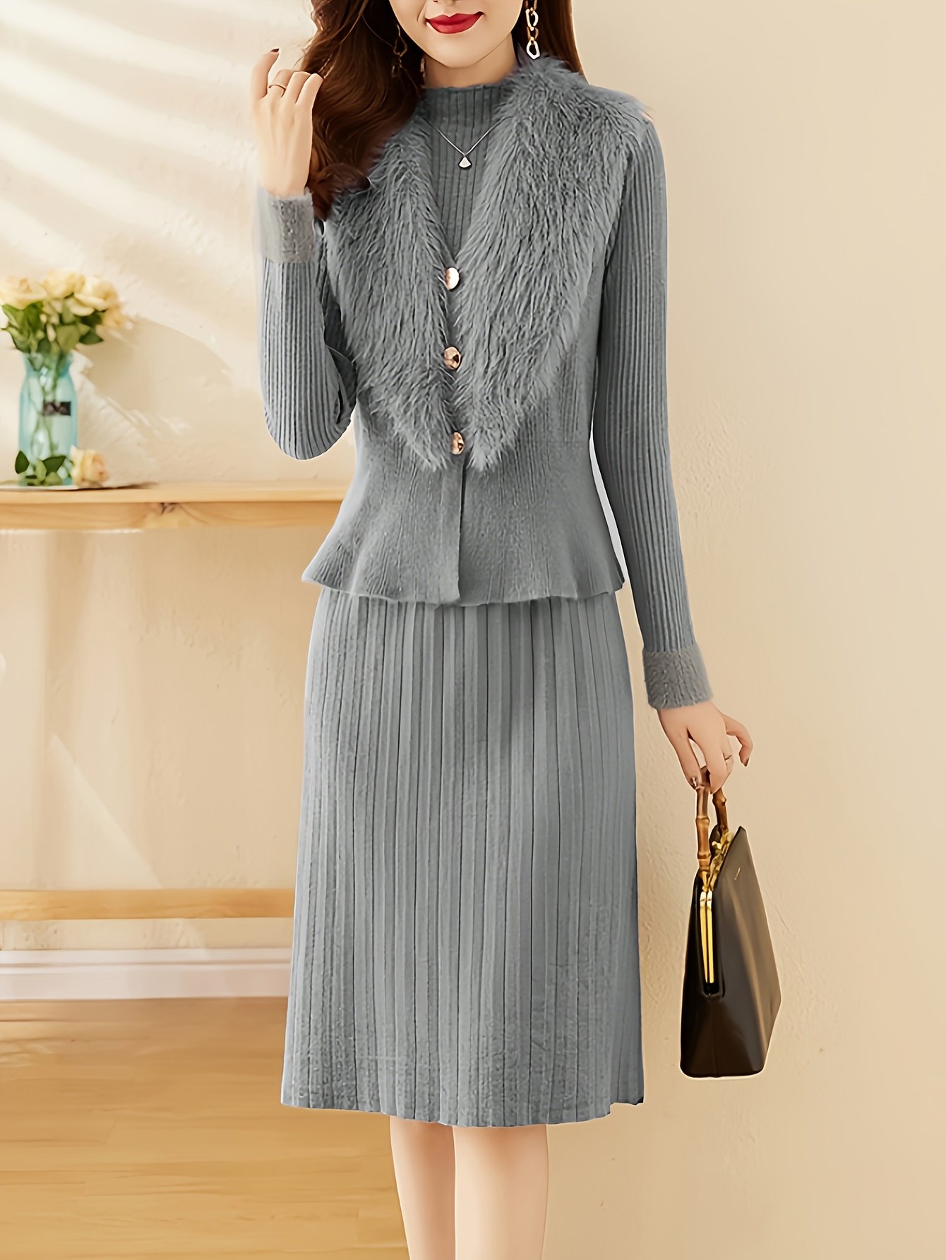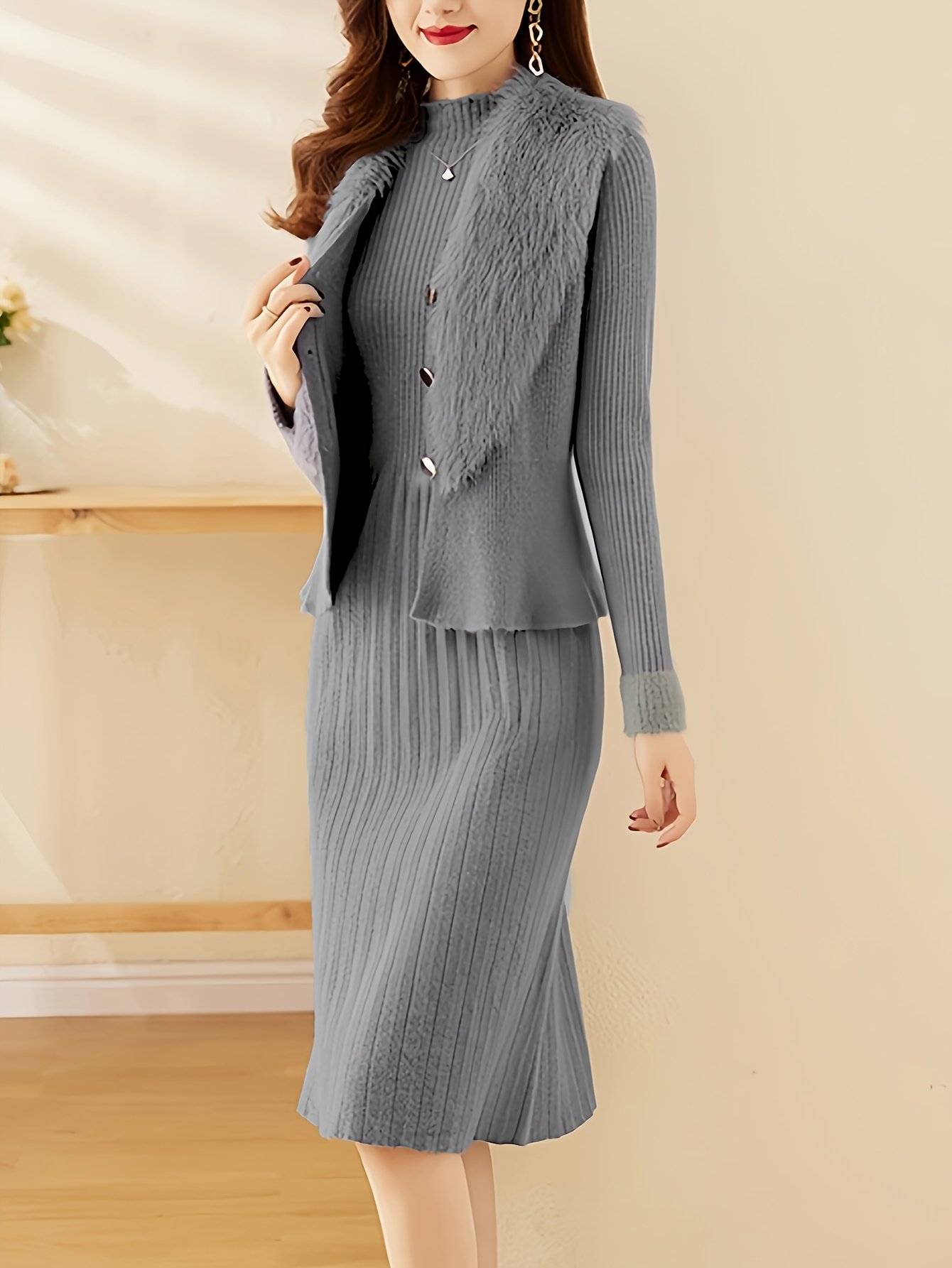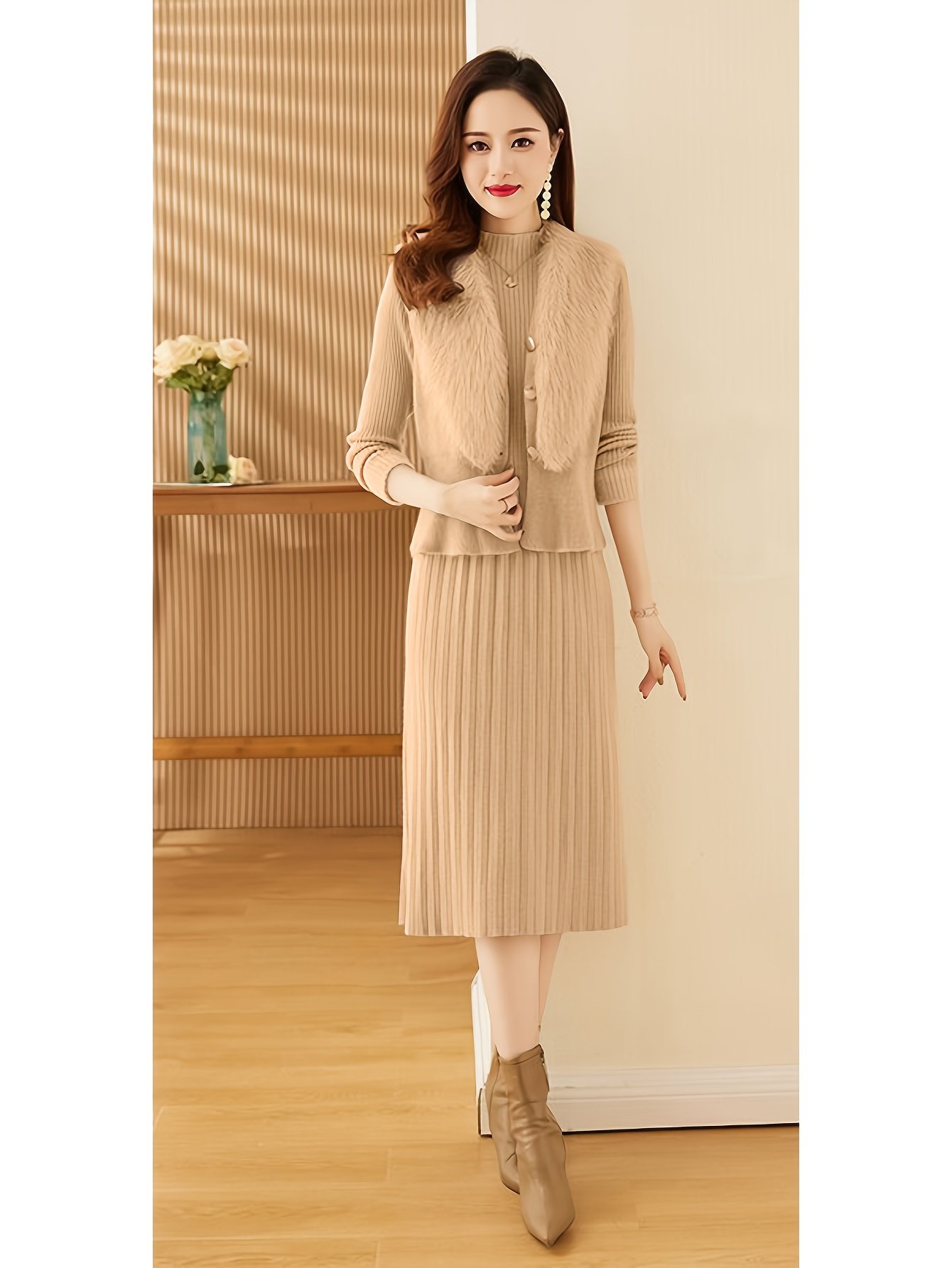 - Modern and Elegant Design: A two-piece set combining a classic round-neck dress and an elegant sleeveless vest, both in a solid color, adding a touch of sophistication and allowing for easy coordination with your favorite accessories.
