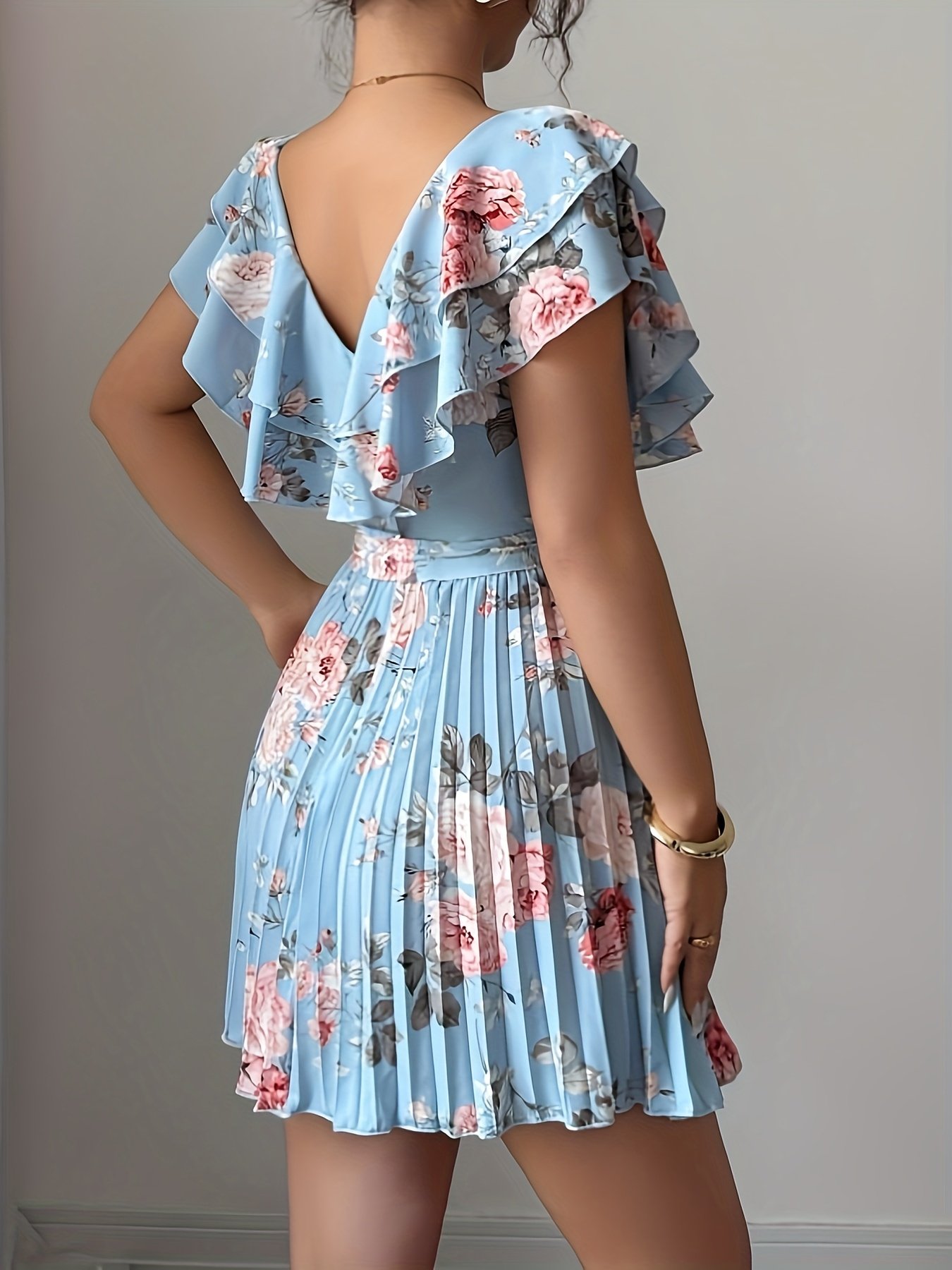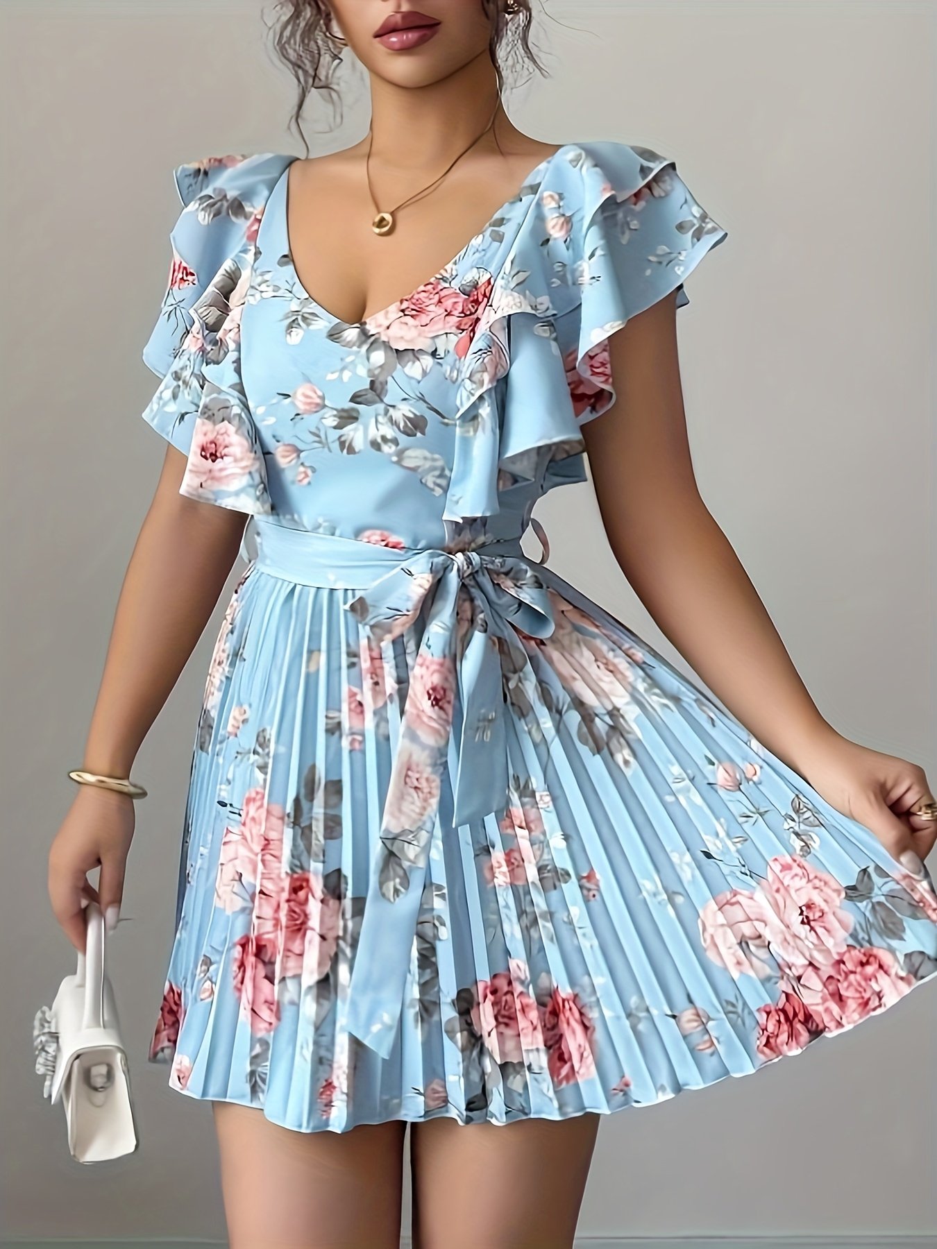 - Ruffled Sleeves and Elegant Waist Details: Short sleeves adorned with delicate ruffles add a lively and modern touch, while pleated details at the waist accentuate your elegance and create a beautiful yet comfortable silhouette.