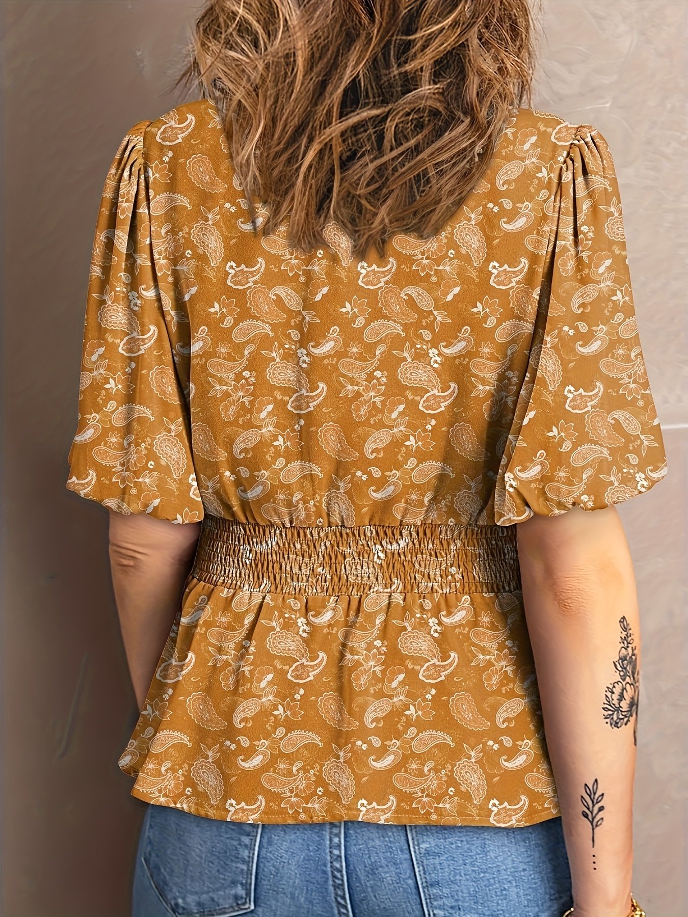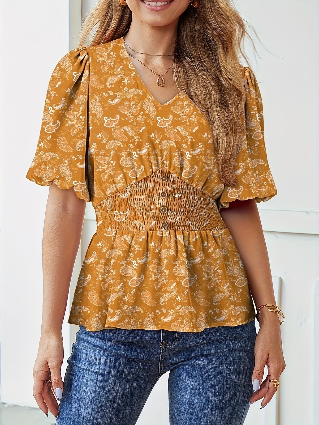 Embrace spring and summer with a look that combines absolute elegance and perfect comfort. We present to you the ideal shirt that will add a touch of dazzling beauty to your wardrobe this season. The unique design of this shirt combines attractive floral prints with an elegant V-neckline that highlights the beauty of your neck. It features comfortable half-sleeves, delicate pleats that add volume and sophisticated feminine movement, in addition to elegant decorative buttons that complete its luxurious look. For added comfort and a perfect fit, it comes with an elastic waistband that gracefully accentuates your figure. Made from high-quality polyester fabric that provides a feeling of lightness and softness, making it an ideal choice for warm summer days.