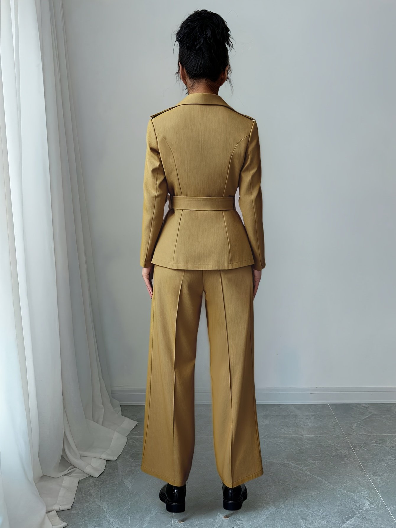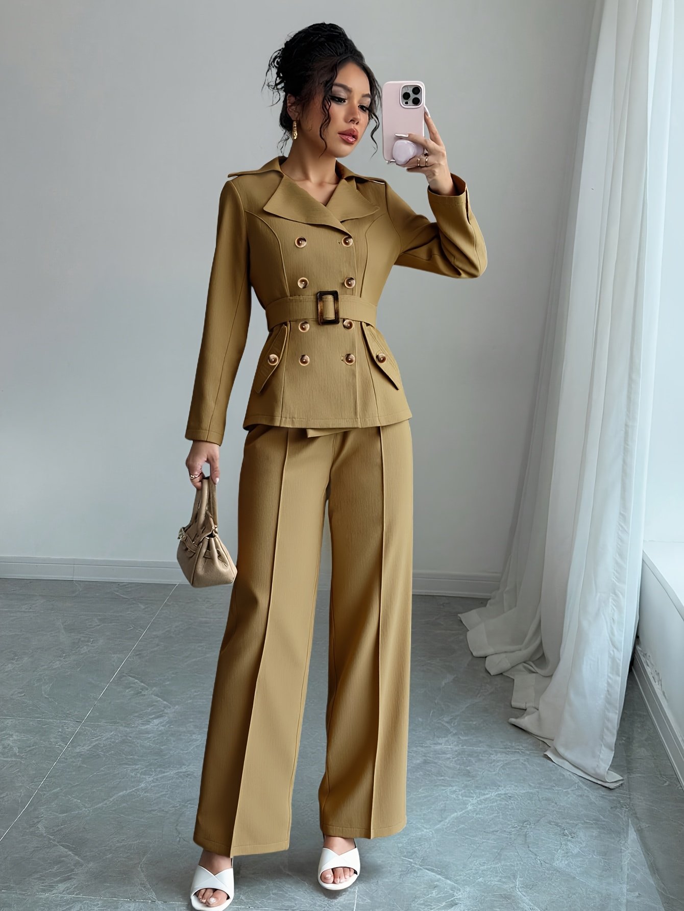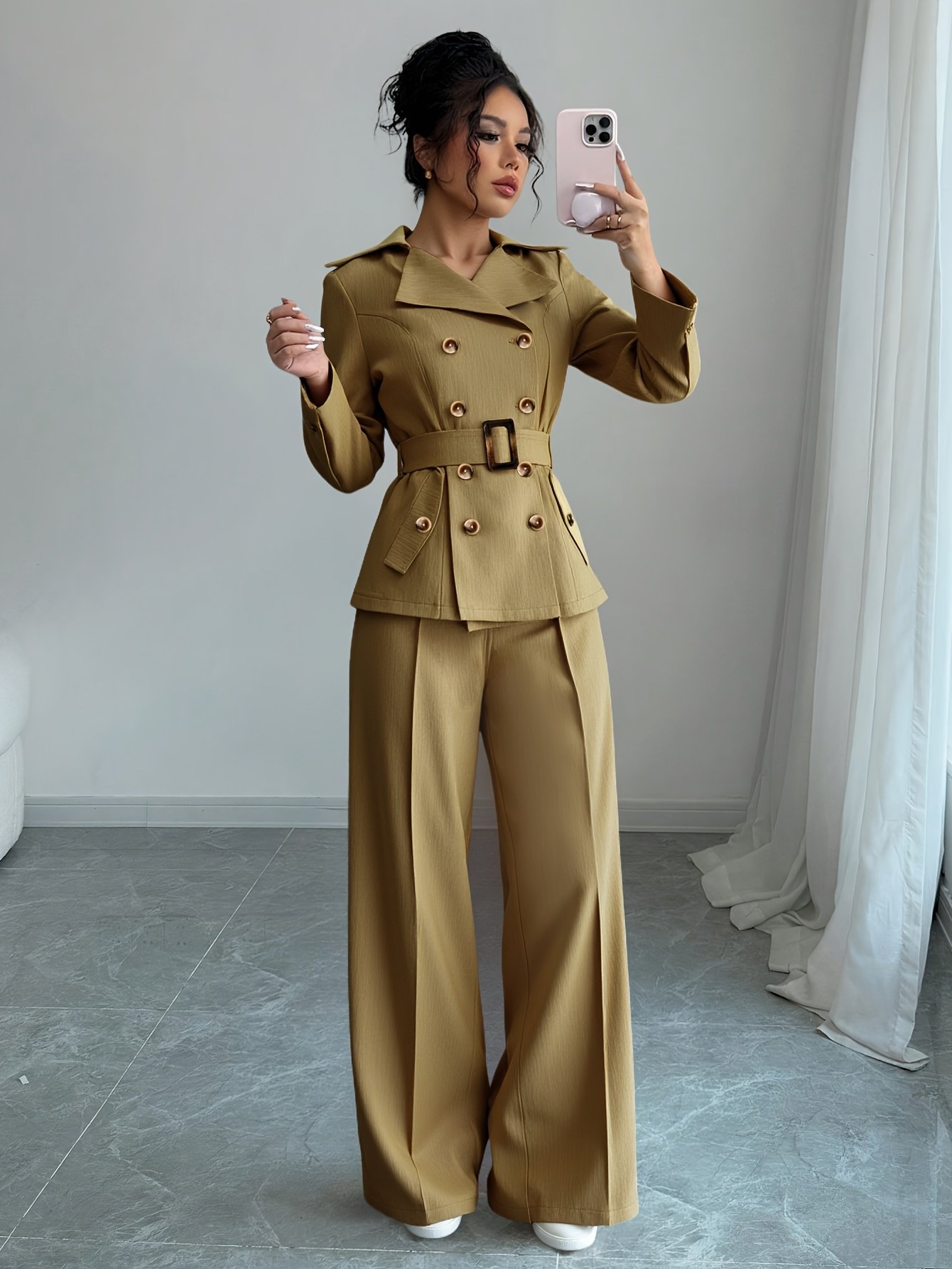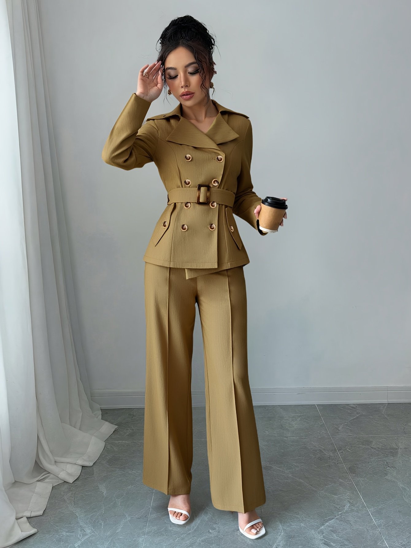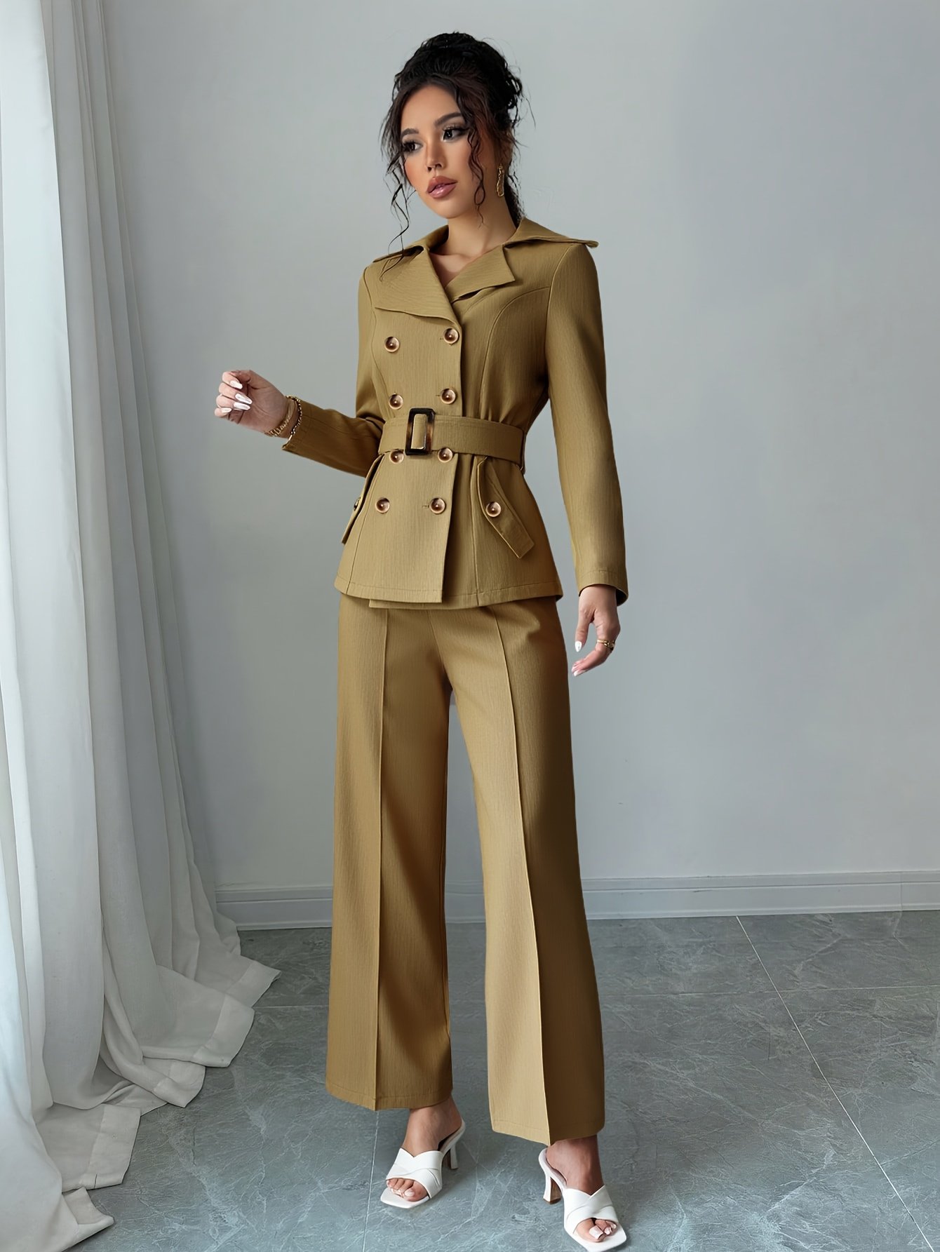 - Unique and Integrated Design: The set includes an elegant double-breasted blazer inspired by the luxury of trench coats, paired with wide-leg, high-waisted trousers that give you a graceful silhouette and a chic, cohesive look.