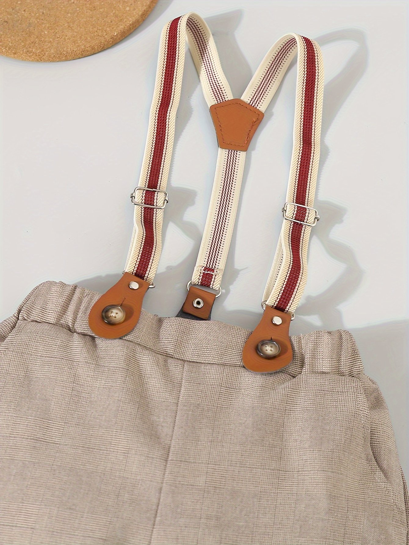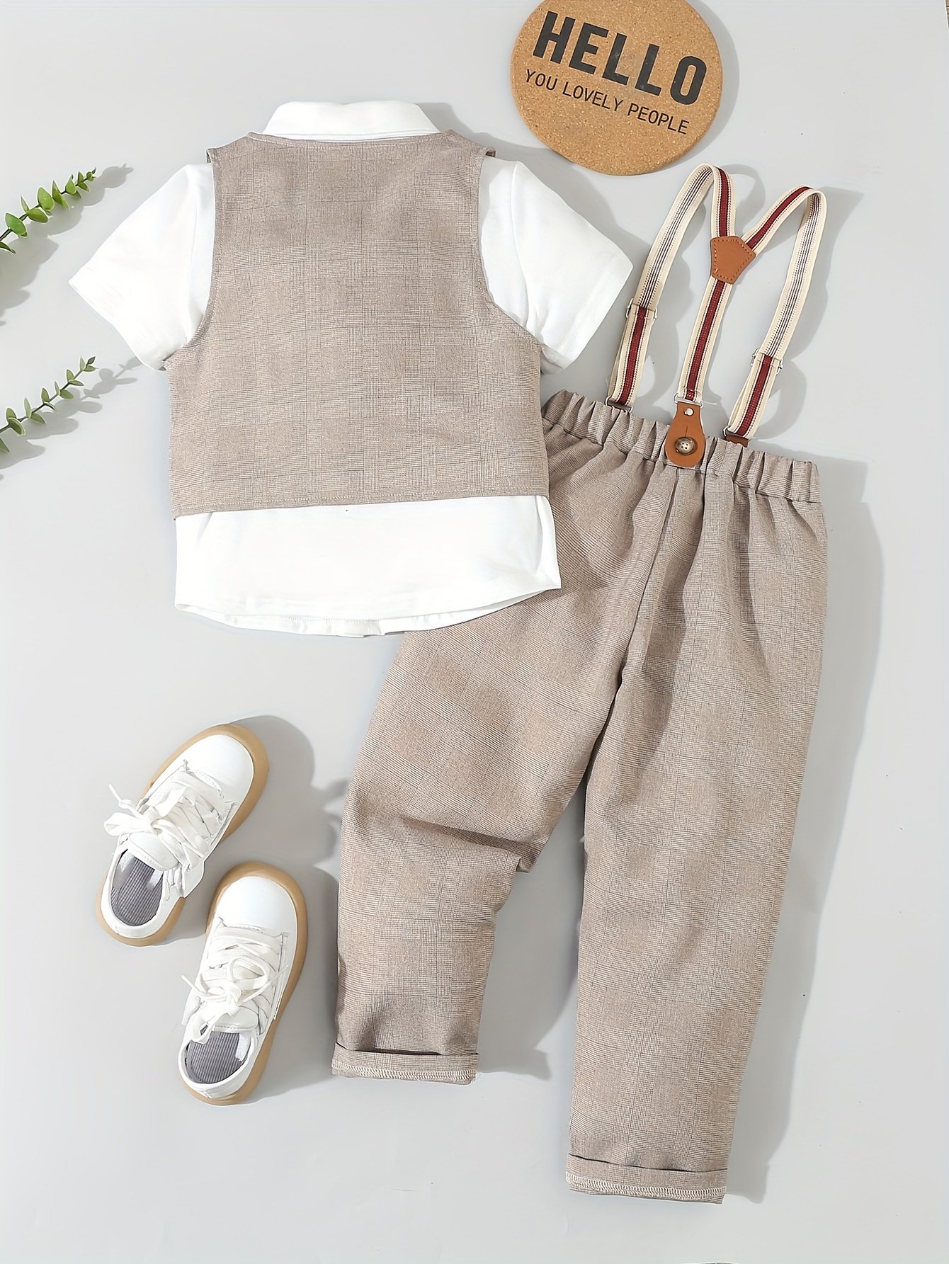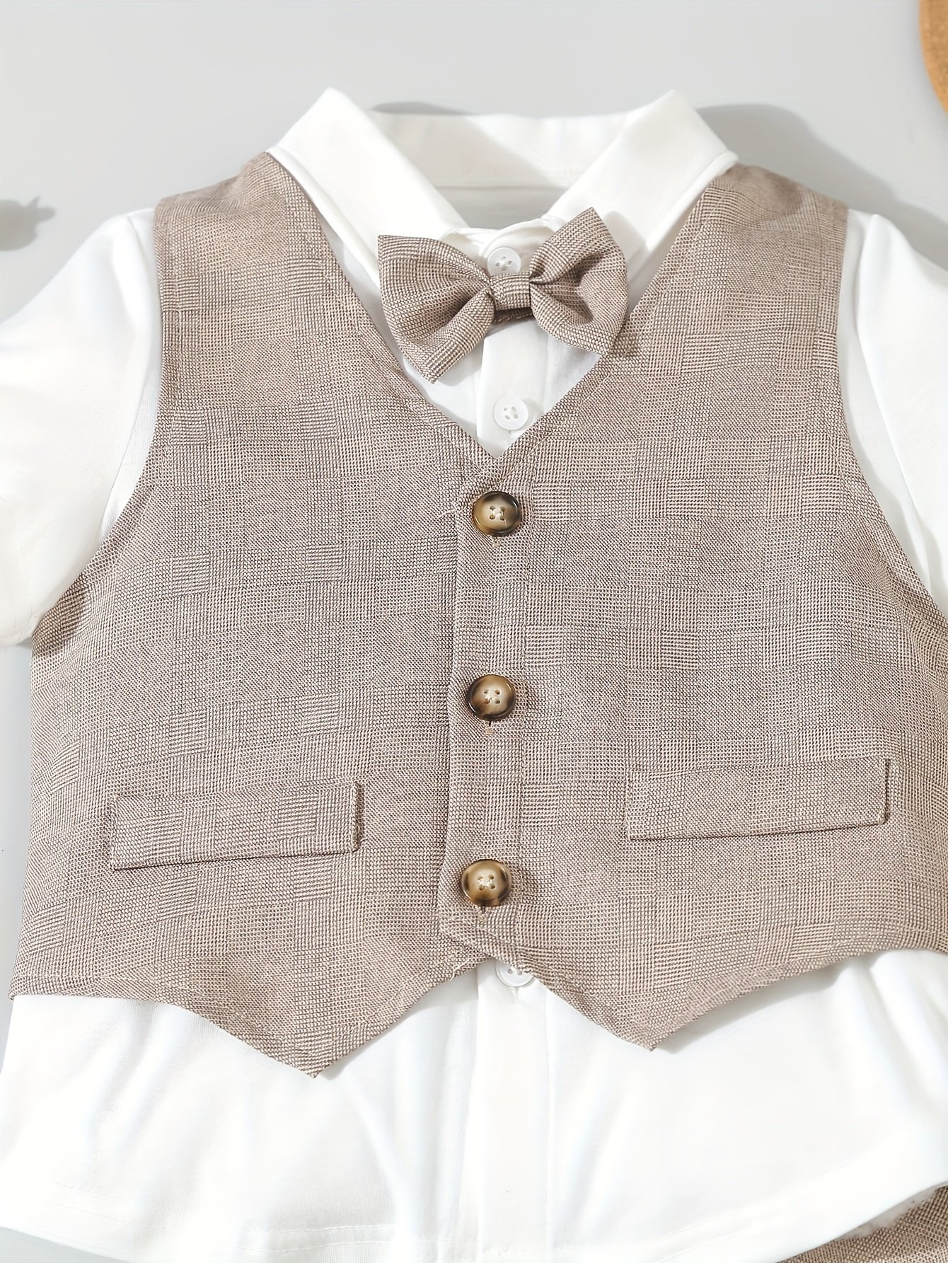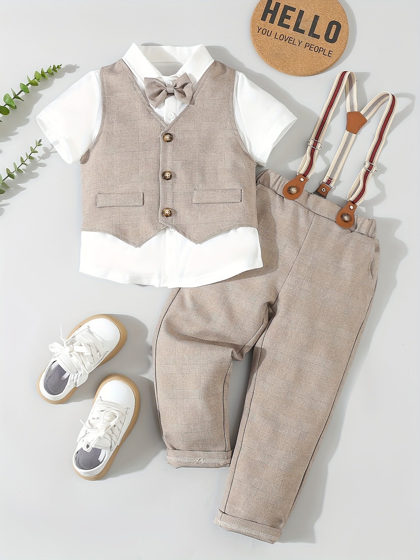 • Complete Gentleman Look: The set consists of 4 essential pieces: an elegant short-sleeved shirt, an attractive bow tie, a stylish vest, specially designed trousers, and suspenders to add a distinctive classic touch.