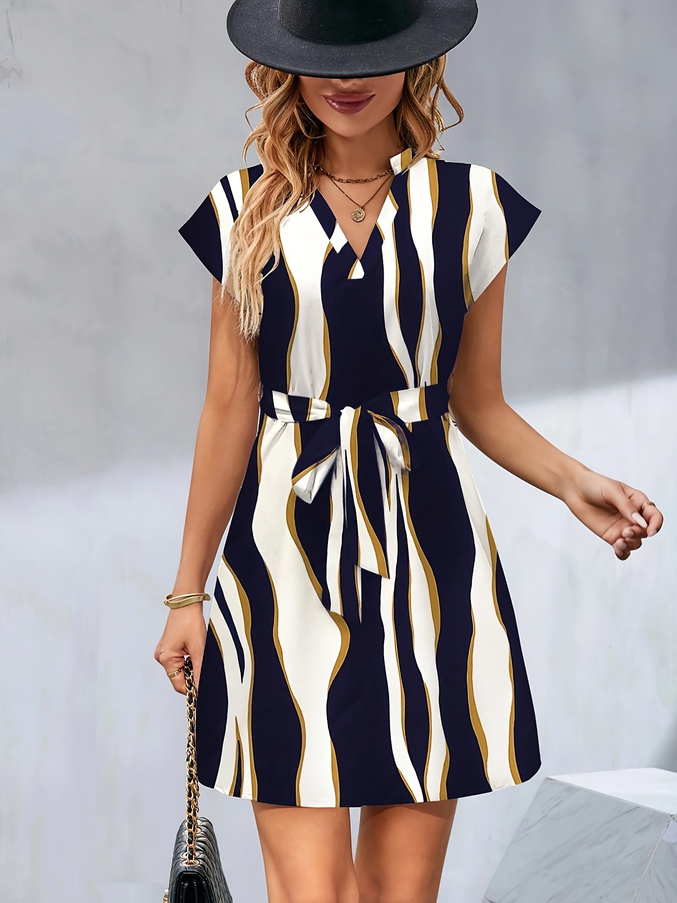 - Modern Geometric Print and Waist Tie Belt: Features a distinctive geometric pattern that gives it a unique and contemporary character, complemented by a stylish waist belt that accentuates your figure and allows you to easily adjust the fit as desired.