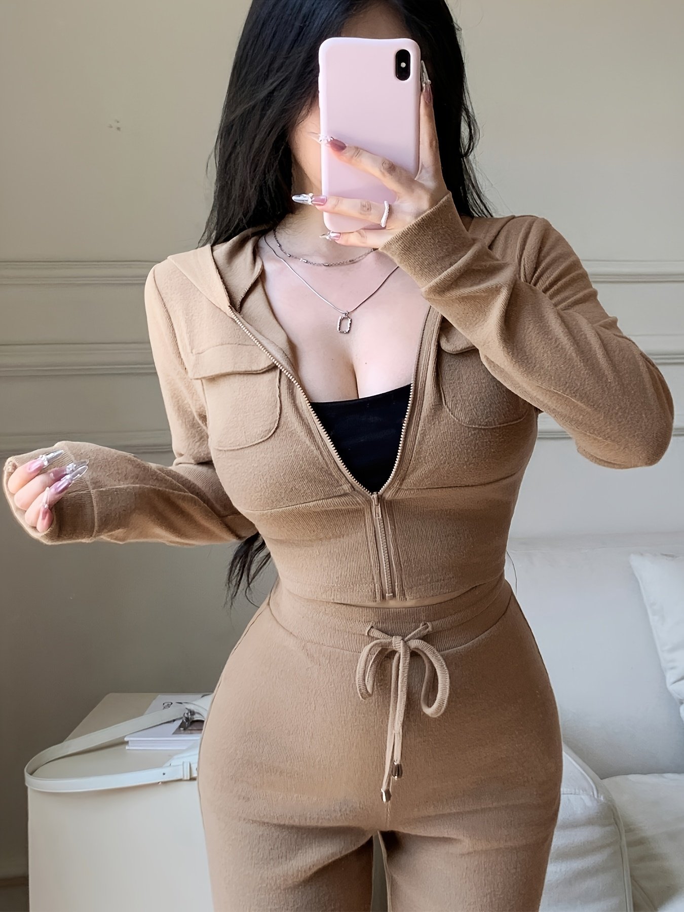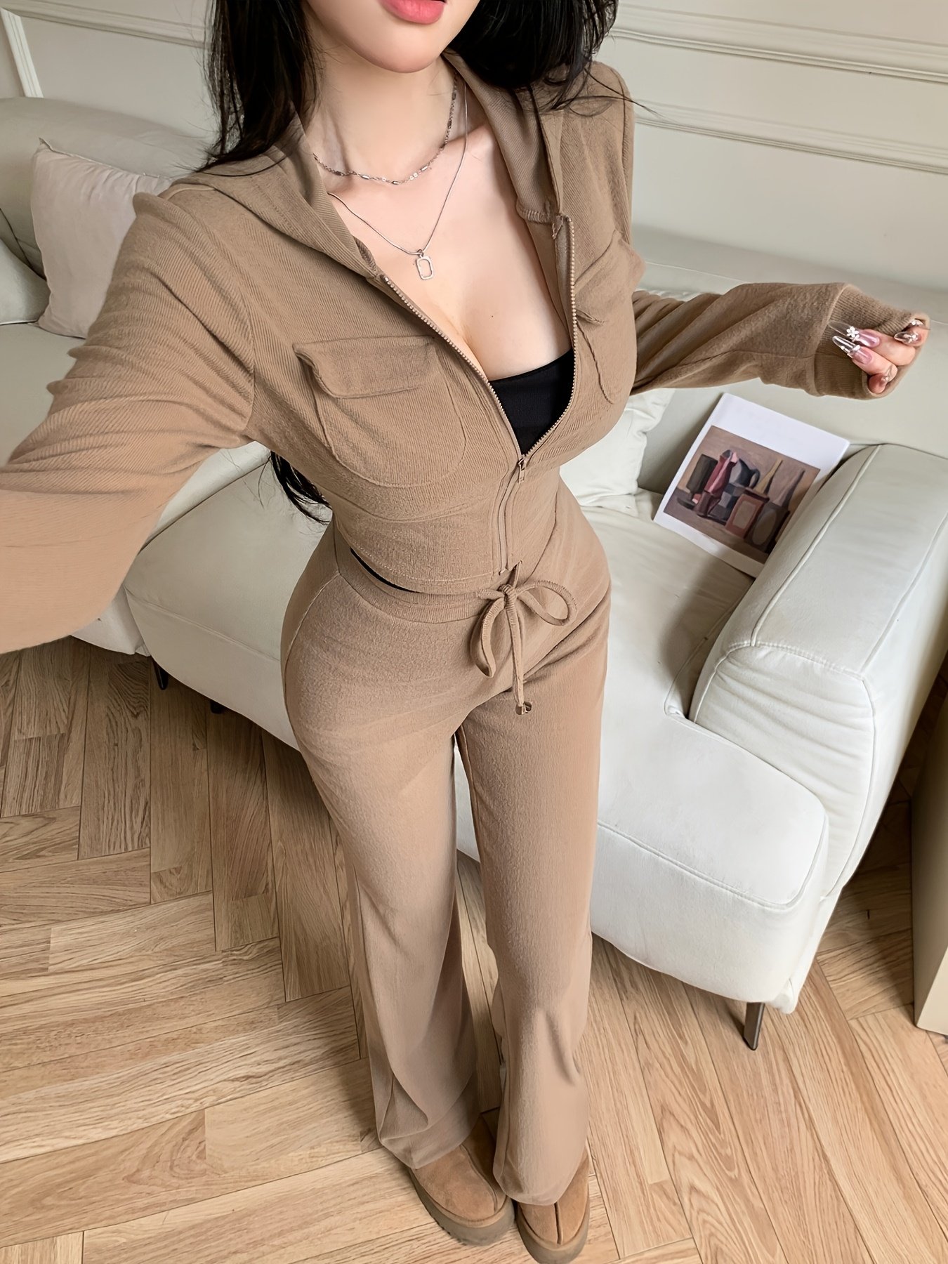 - Modern and Comfortable Design: The set consists of a short jacket with a hood for added warmth and style, and wide-leg, high-waisted pants that offer unparalleled comfort and freedom of movement.
