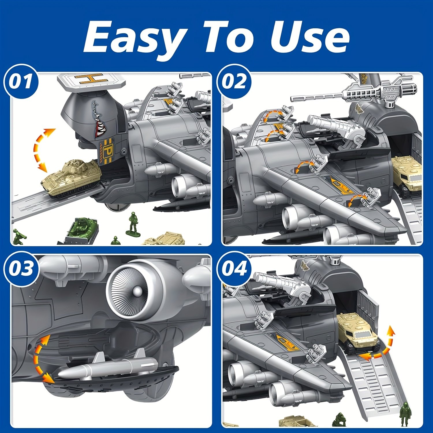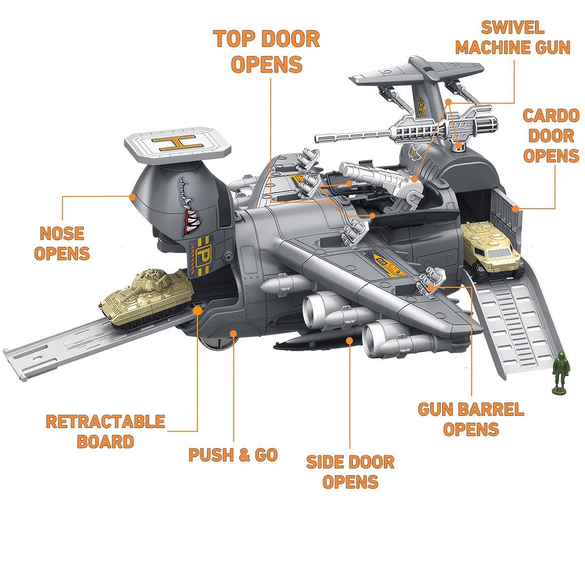 • Complete Play Experience: A giant transport plane comes loaded with a group of brave soldiers, three fast mini-cars, and an additional vehicle to form a complete adventure fleet ready to launch at any moment.