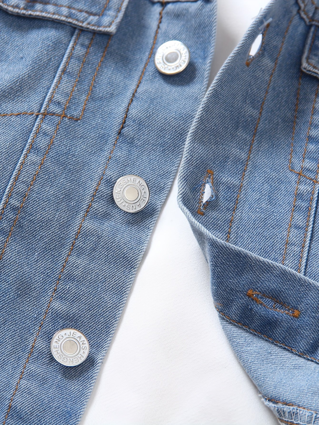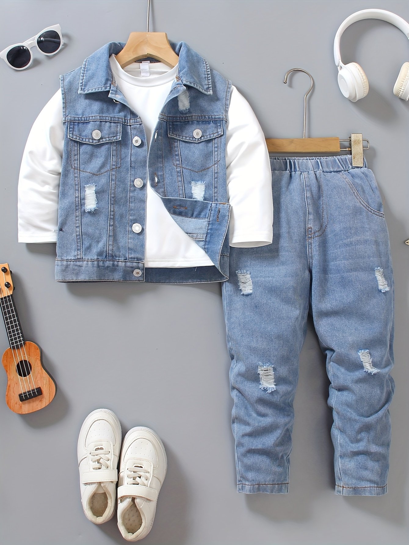 • Integrated and Modern Look: The set includes a round-neck, long-sleeved shirt, along with a bold and distinctive sleeveless denim vest, and matching denim pants. It can be worn completely for a coordinated look or mixed and matched with other clothes to create multiple new outfits.