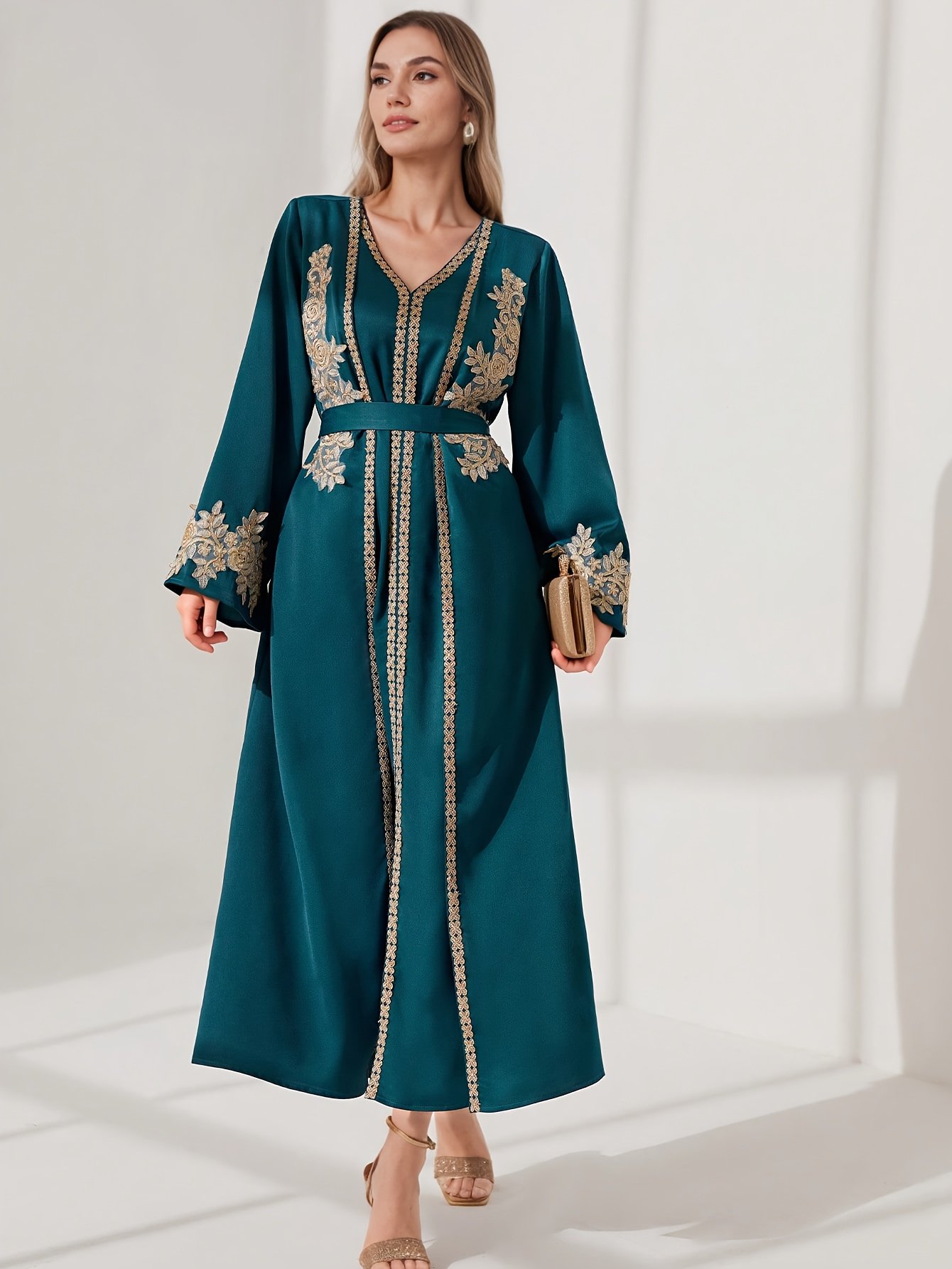 - Unique Royal Design: The dress features a captivating turquoise color with an elegant V-neckline that adds a refined feminine touch, and luxurious gold embroidery adorns the dress to give you unparalleled sparkle.