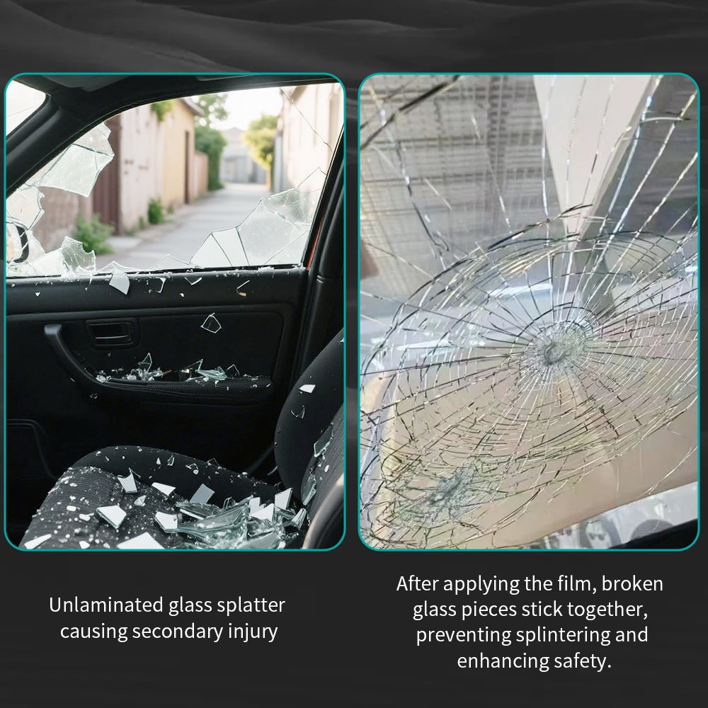 - Anti-Shatter & Fragmentation: In the event of accidents or impacts, the film holds glass fragments together, preventing them from scattering. This protects occupants from serious injuries and maintains the integrity of the vehicle’s interior.