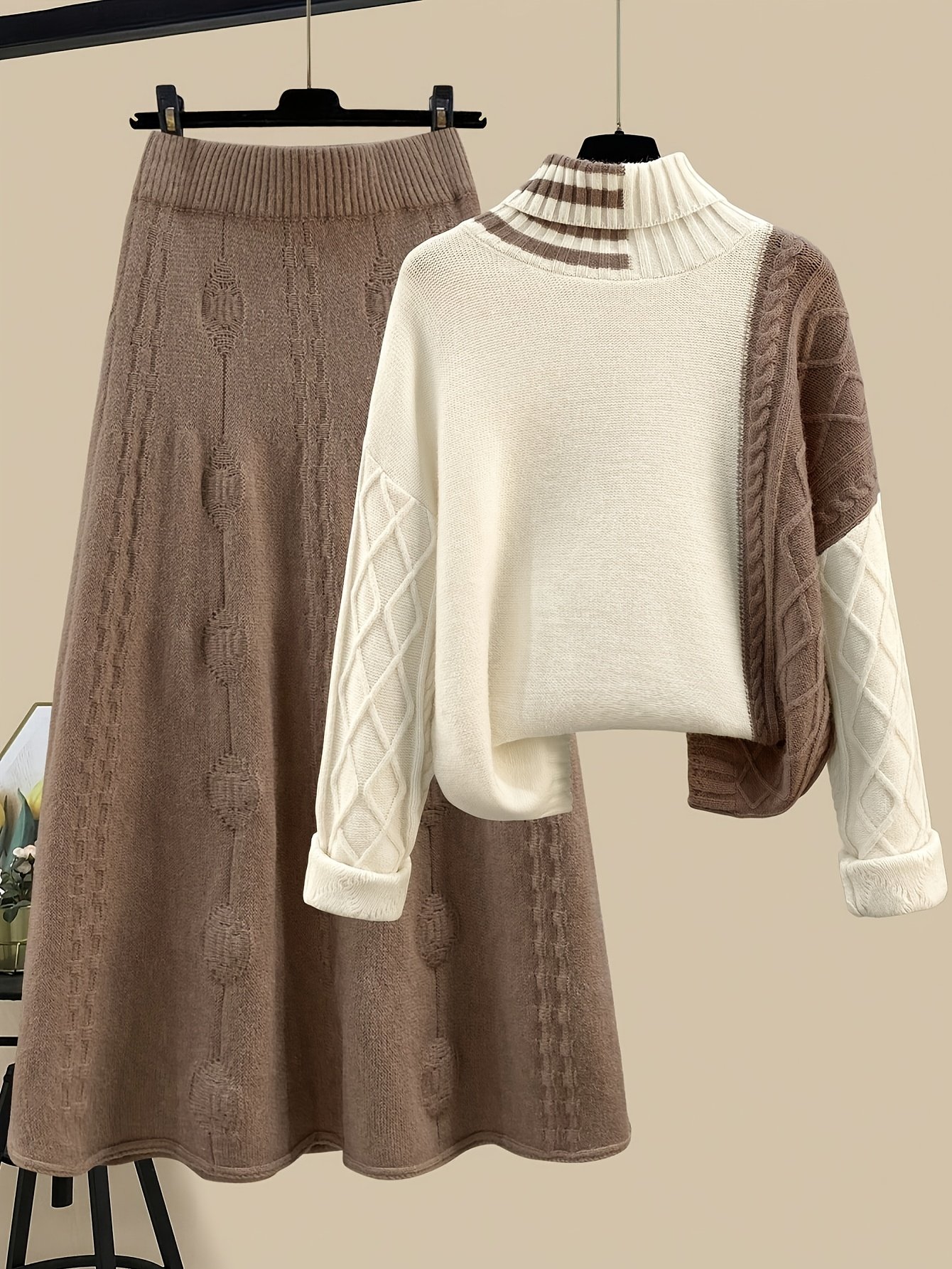 - Unique and Modern Design: An elegant set consisting of a distinctive high-neck sweater and a matching skirt, featuring a ribbed cable knit fabric that adds a luxurious and classic touch, to give you an attractive and complete look that expresses your sophisticated elegance in cold seasons.