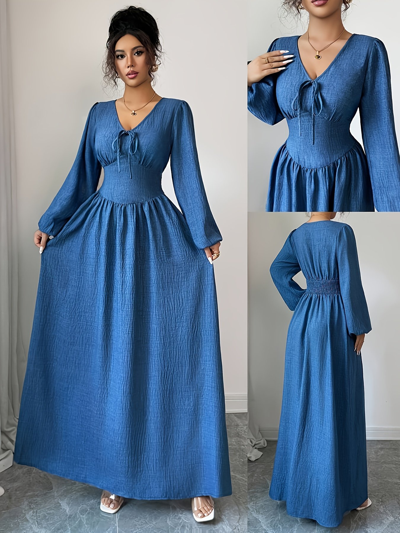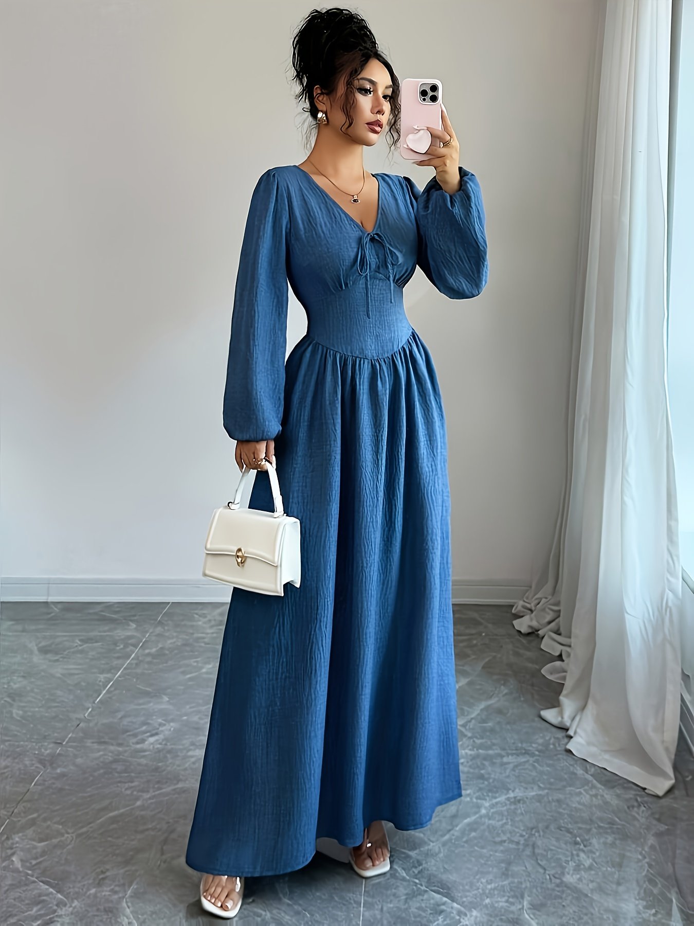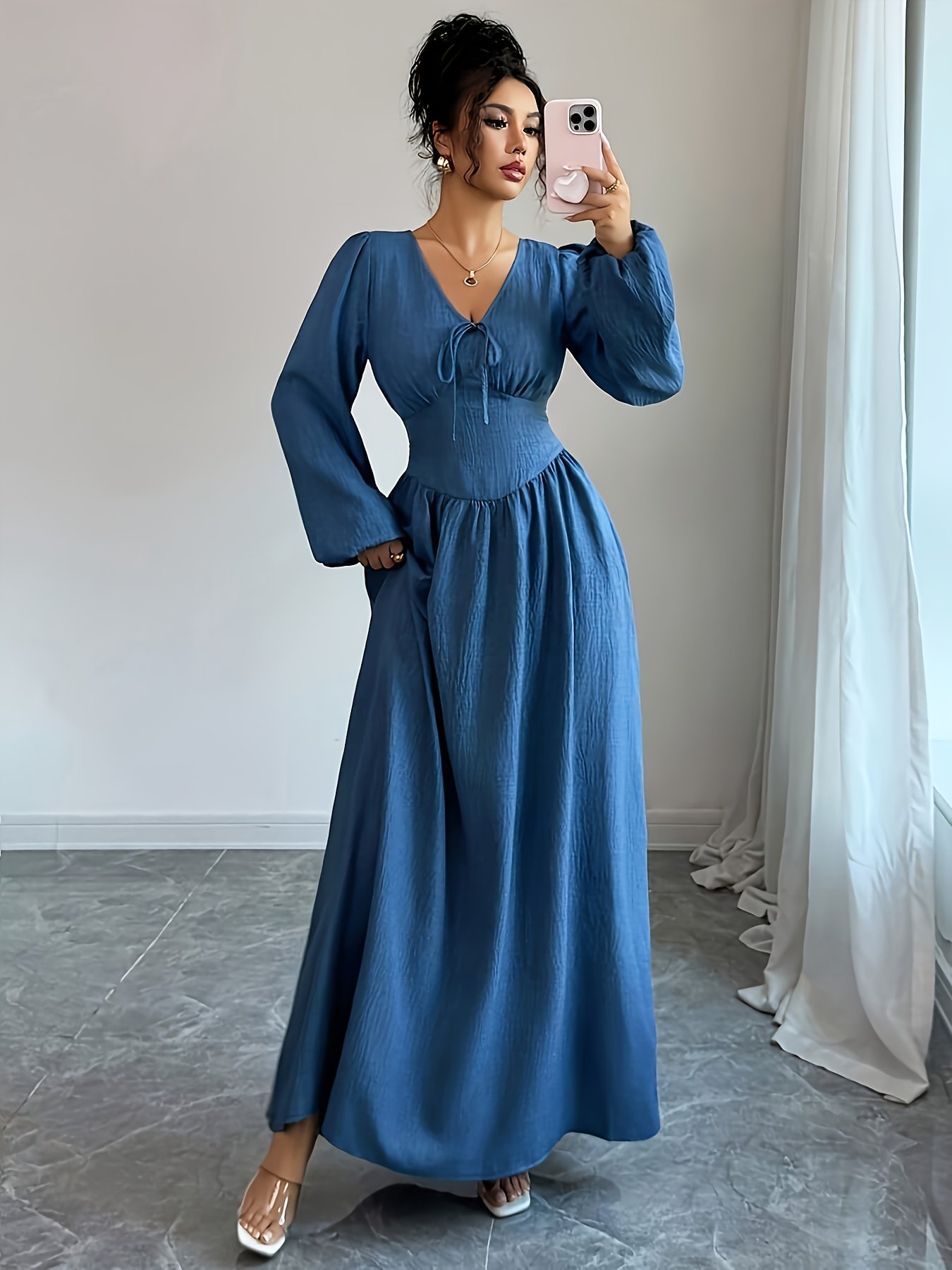 Shine with a touch of sophistication and comfort that every modern woman deserves. We present to you this long V-neck dress, designed to keep pace with your fast-paced life and accompany you through every moment, from important business meetings to peaceful holiday strolls. It’s the perfect piece that combines timeless elegance and practicality, giving you a complete and attractive look wherever you go.