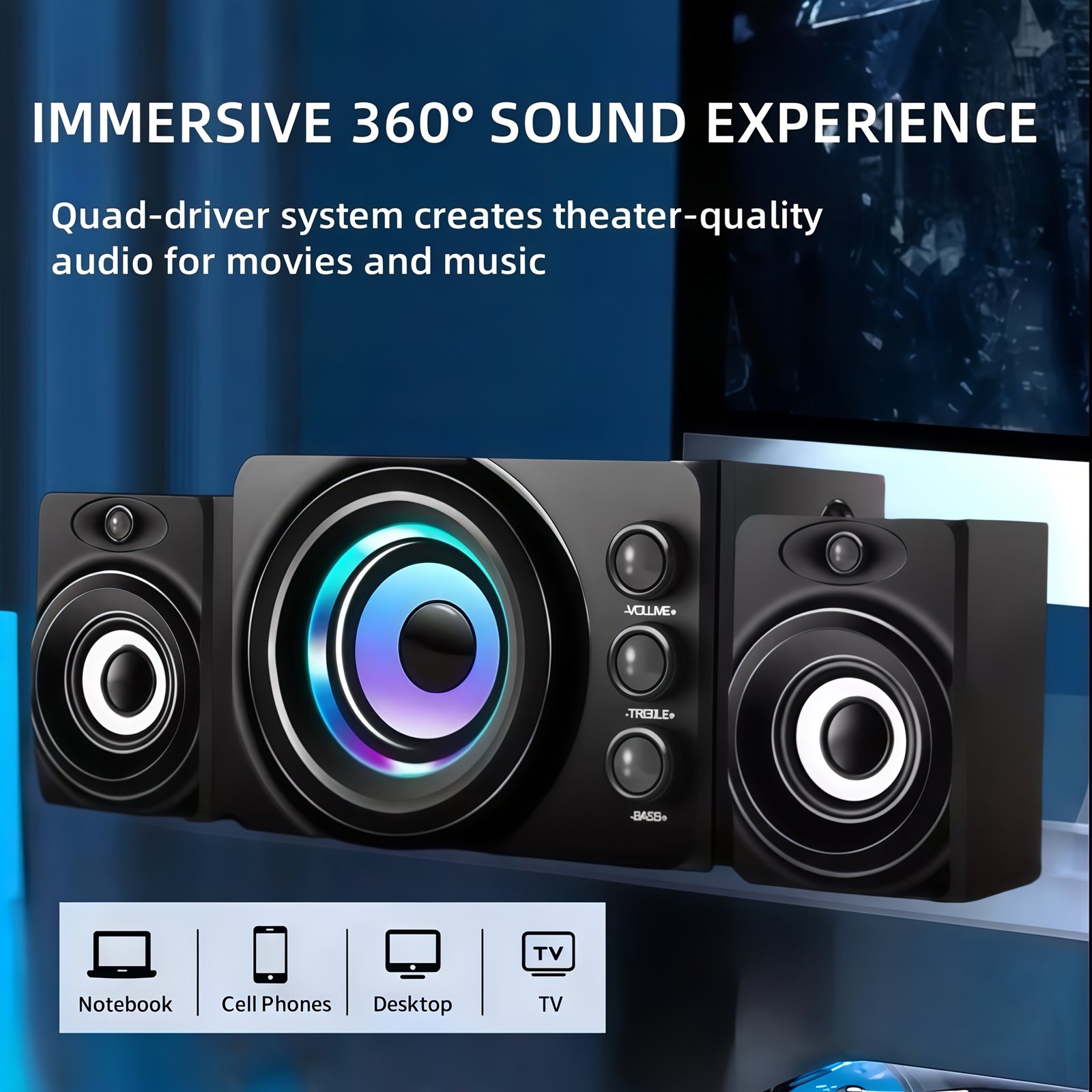 - 360-Degree Panoramic Surround Sound Experience: Enjoy immersive sound that envelops you from every direction, with a 2.1 channel system that puts you at the heart of the action. Every audio detail becomes clear and vibrant, just as if you were in a real cinema hall.