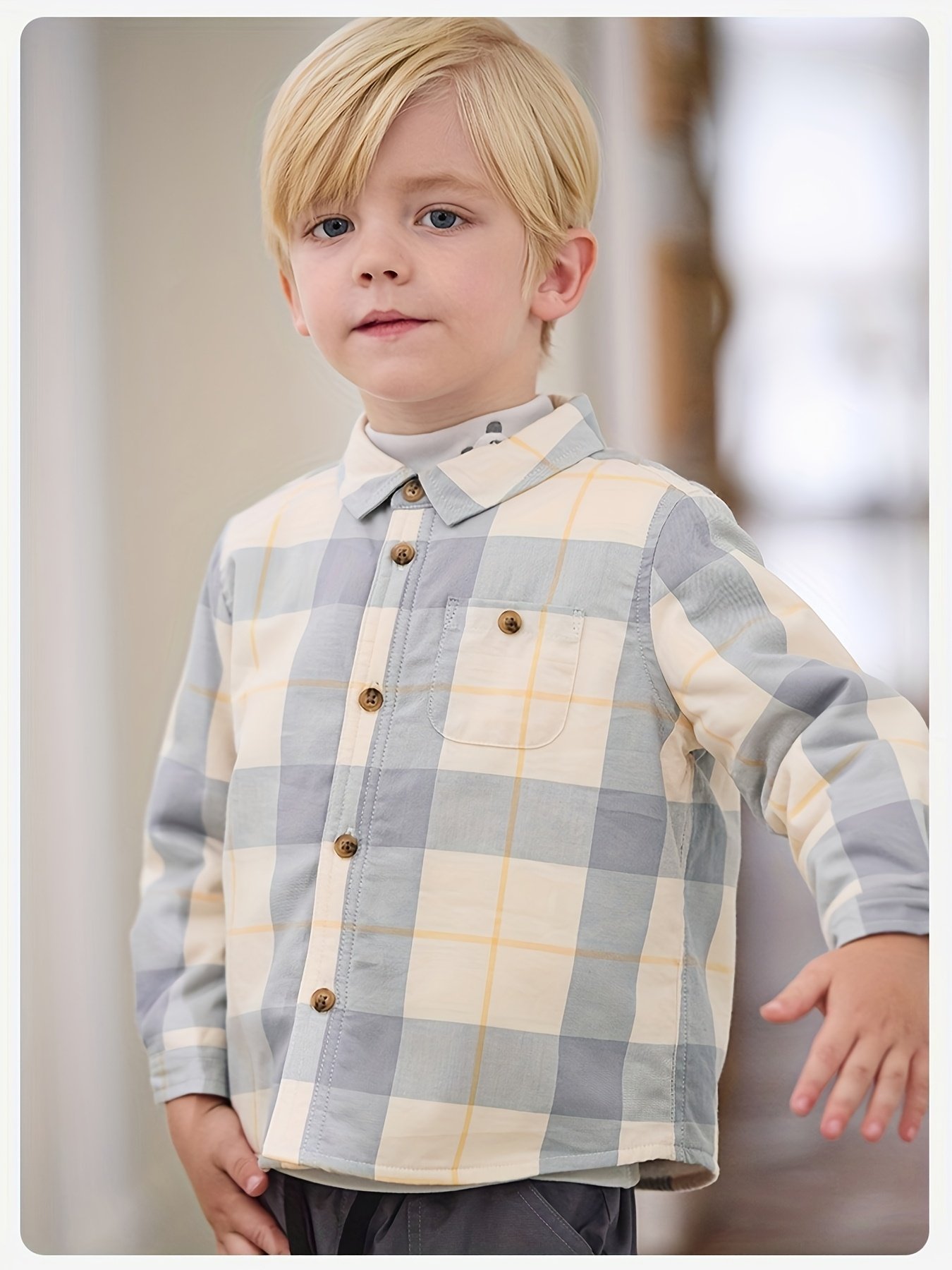 - Attractive Plaid Design: It features a classic blue and yellow plaid pattern that adds a modern and fun touch to your child’s look. The elegant shirt collar adds a touch of sophistication to his casual appearance.
