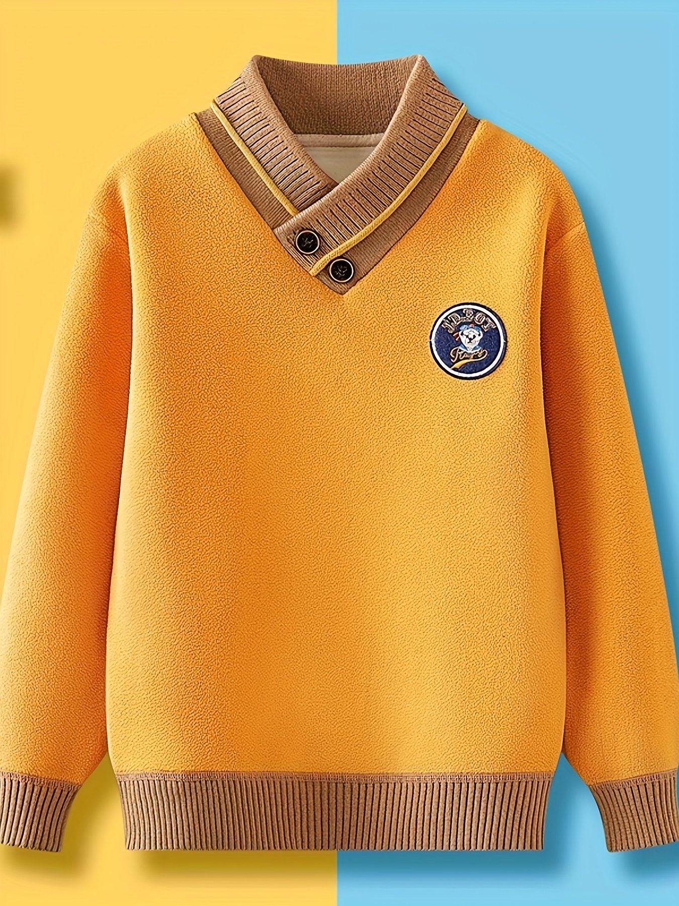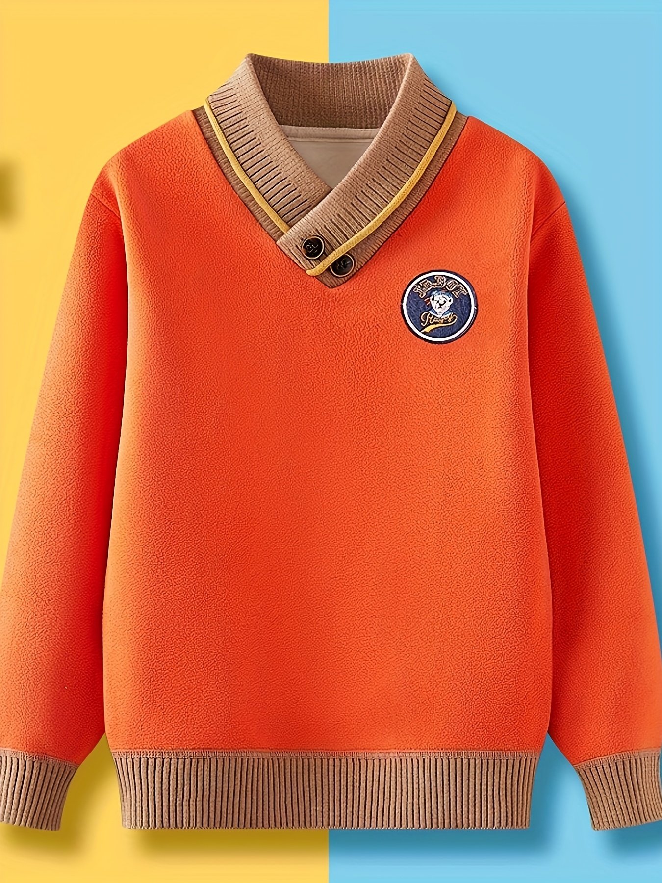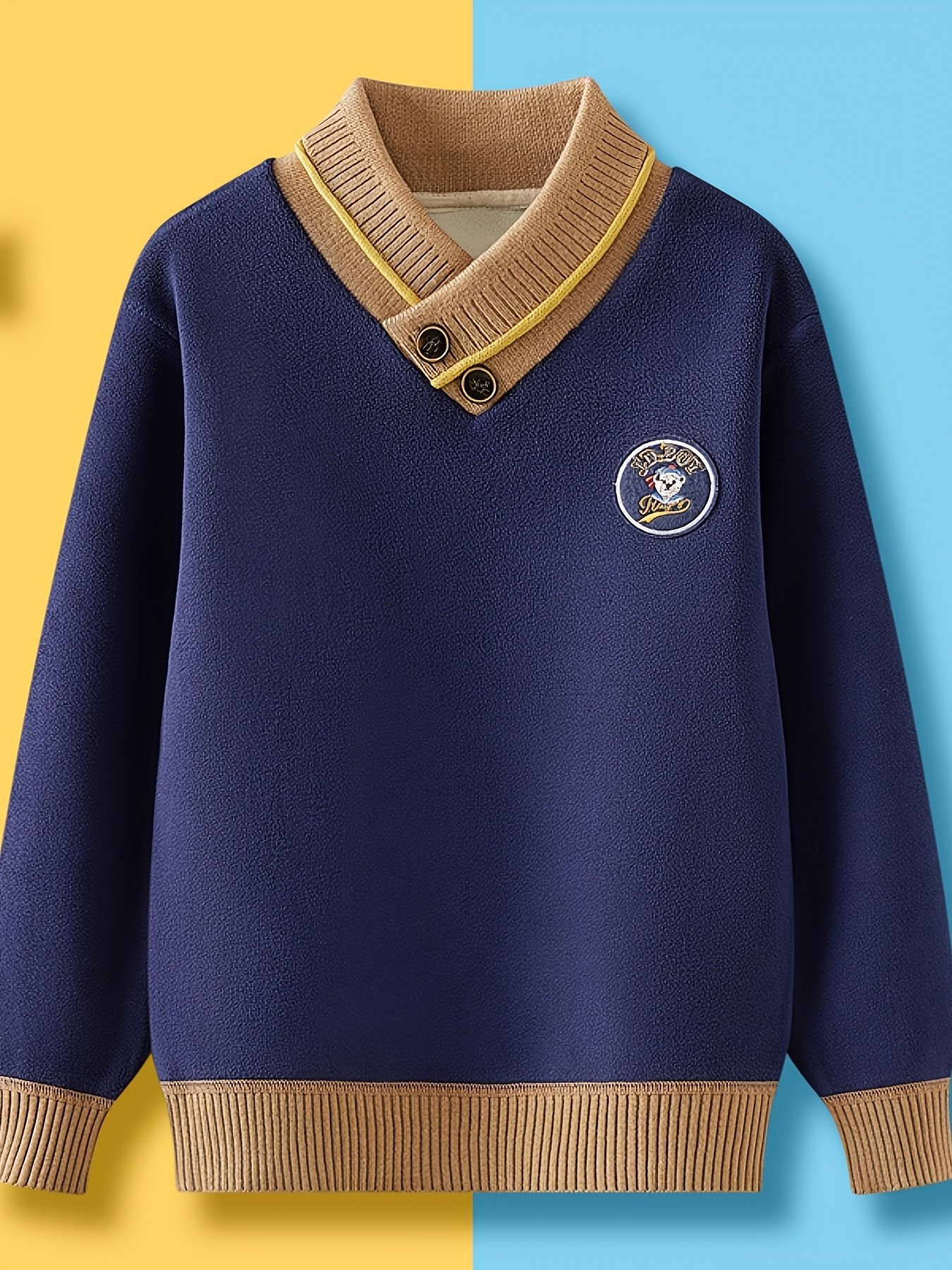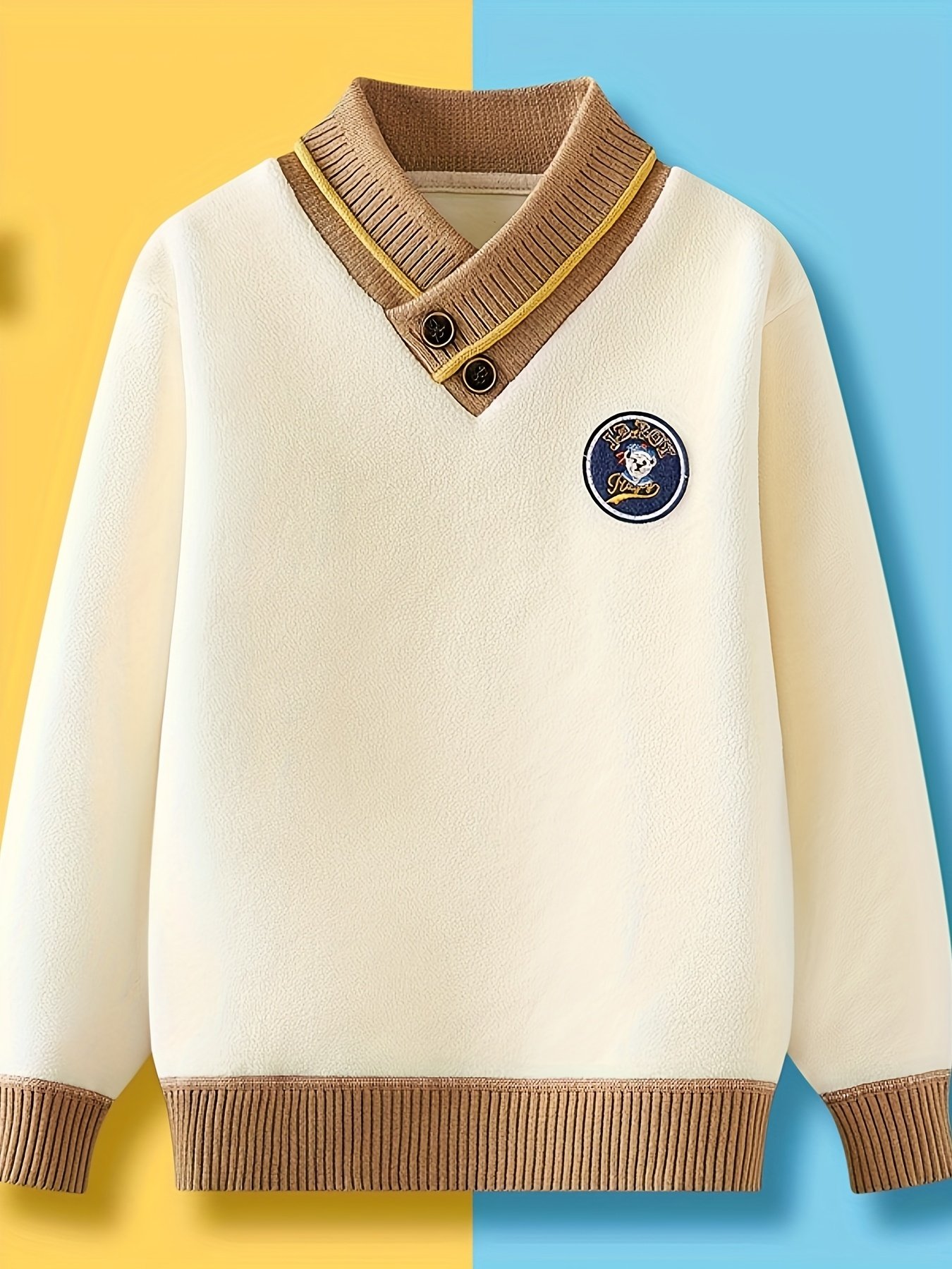 - Classic Elegance with a Modern Touch: The sweater features an elegant V-neck and a sophisticated classic design, with attractive details of intertwined colors and a cute bear badge that gives it a unique and playful character suitable for both boys and girls.