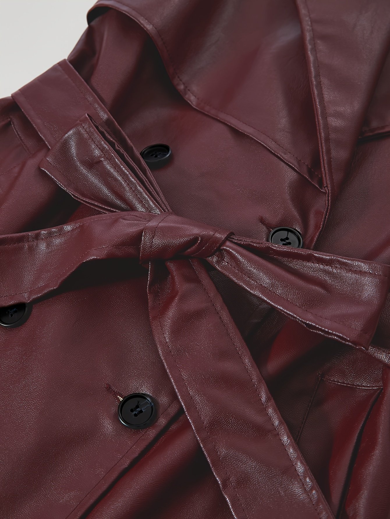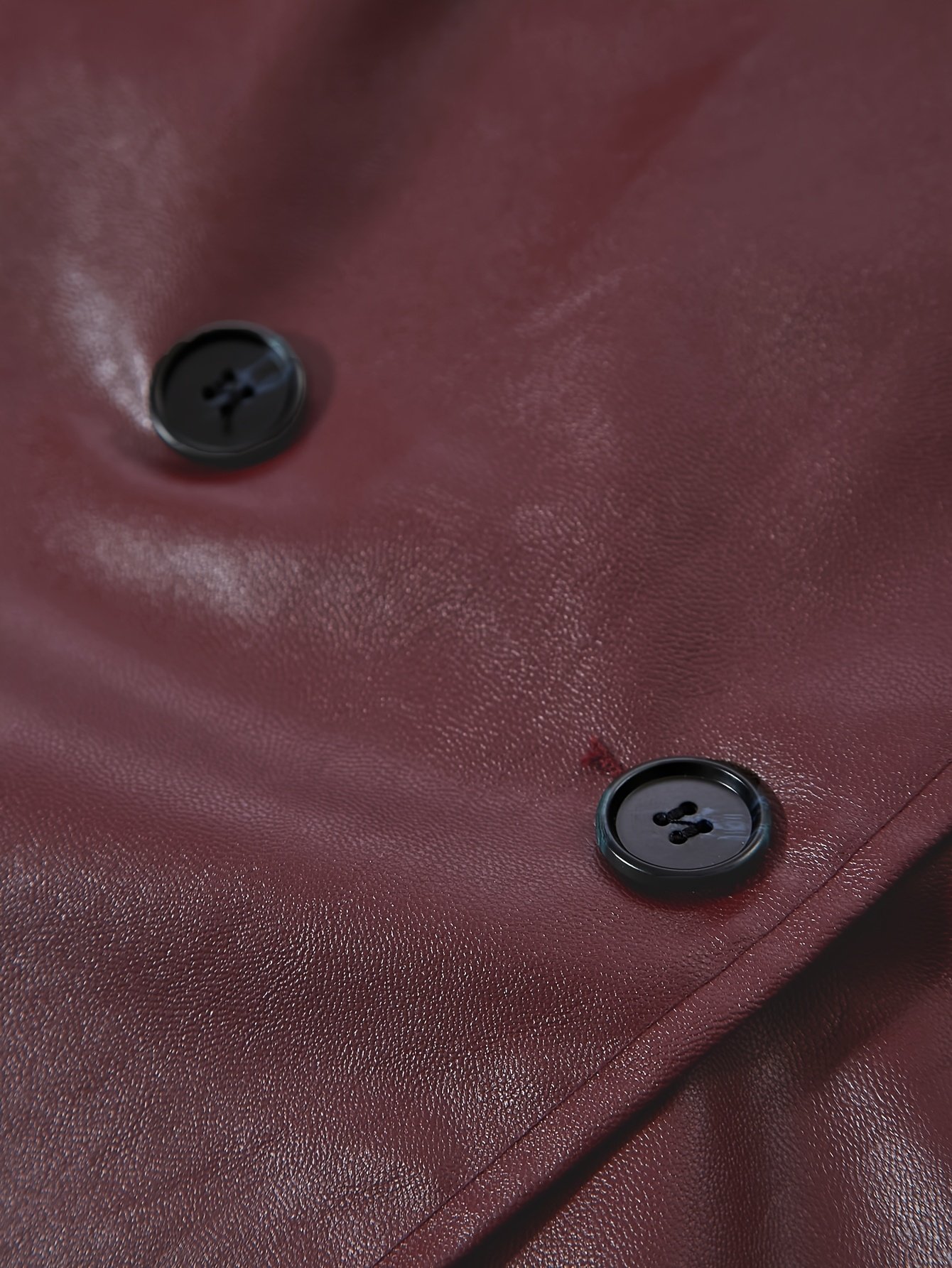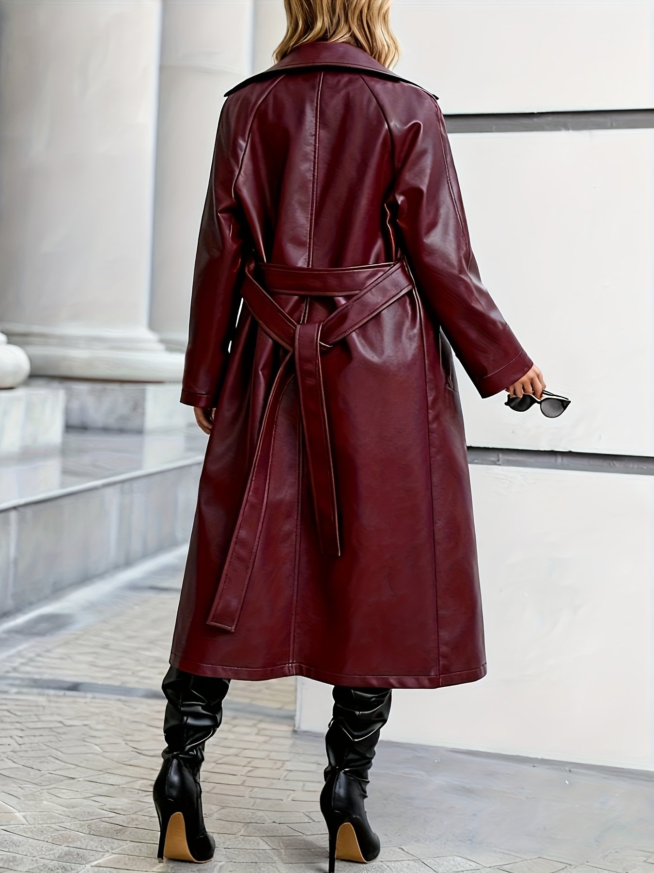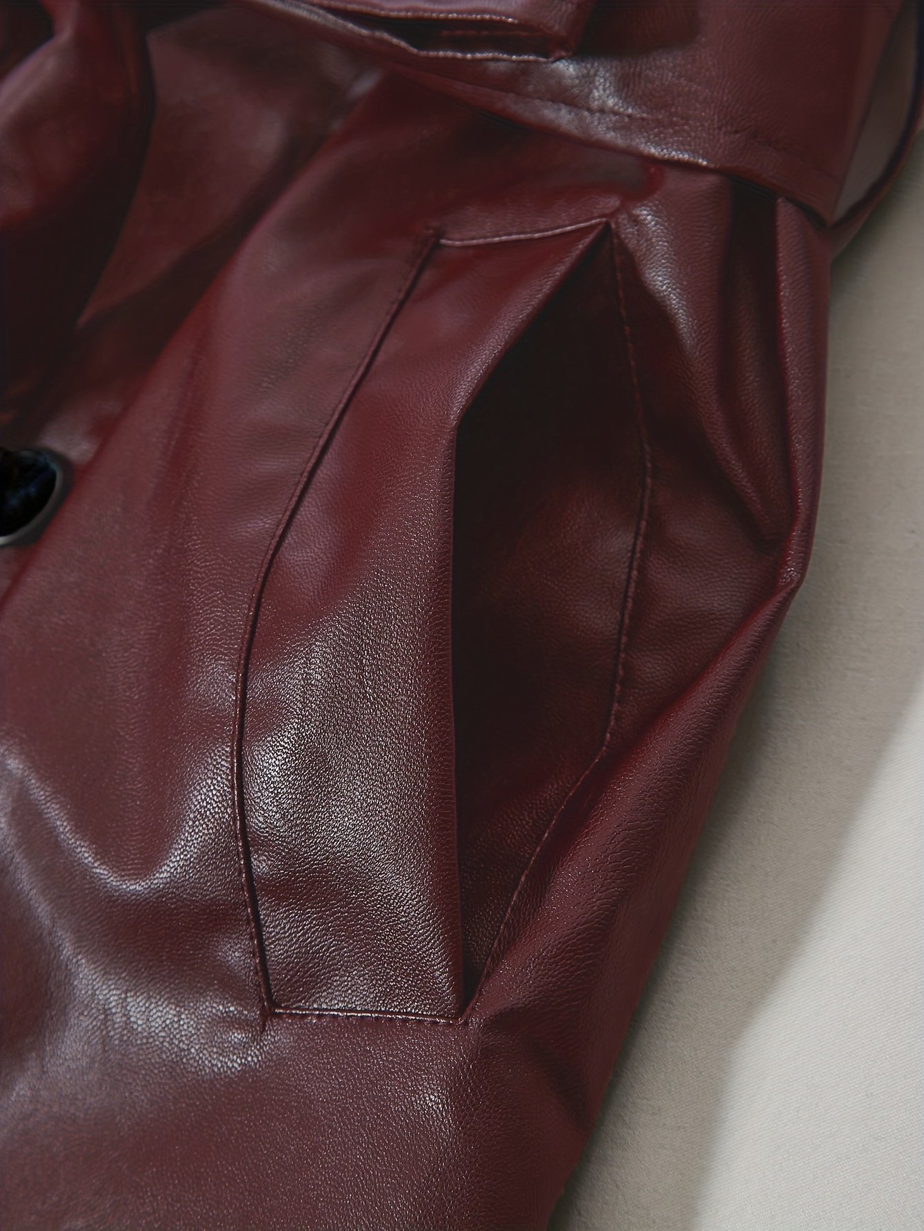 Get ready to experience ultimate elegance and luxurious warmth against the crisp autumn breezes and harsh winter cold. We present to you a masterpiece designed to highlight your beauty and give you an unforgettable look for every occasion. This long faux leather coat in a charming wine red is an essential piece for your sophisticated wardrobe this season.