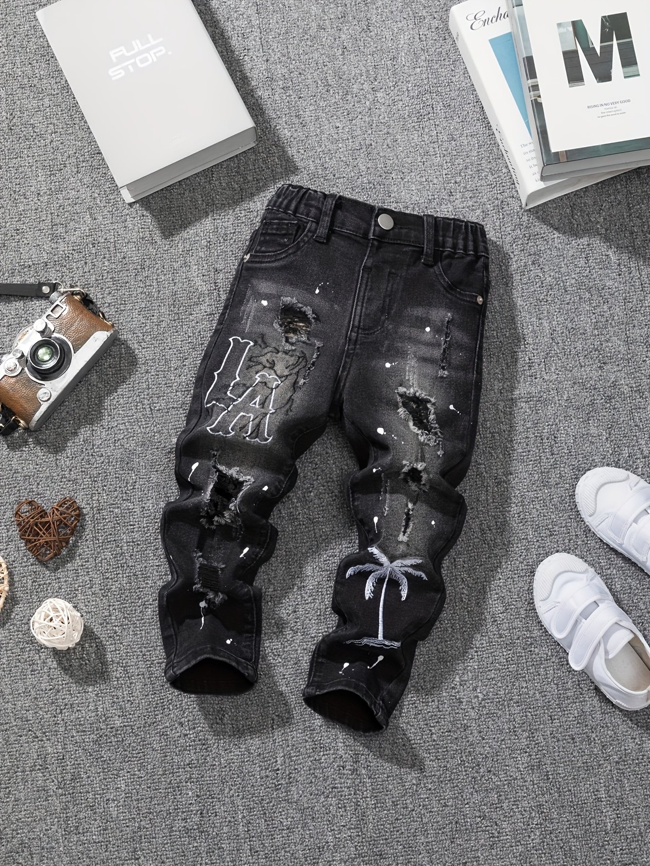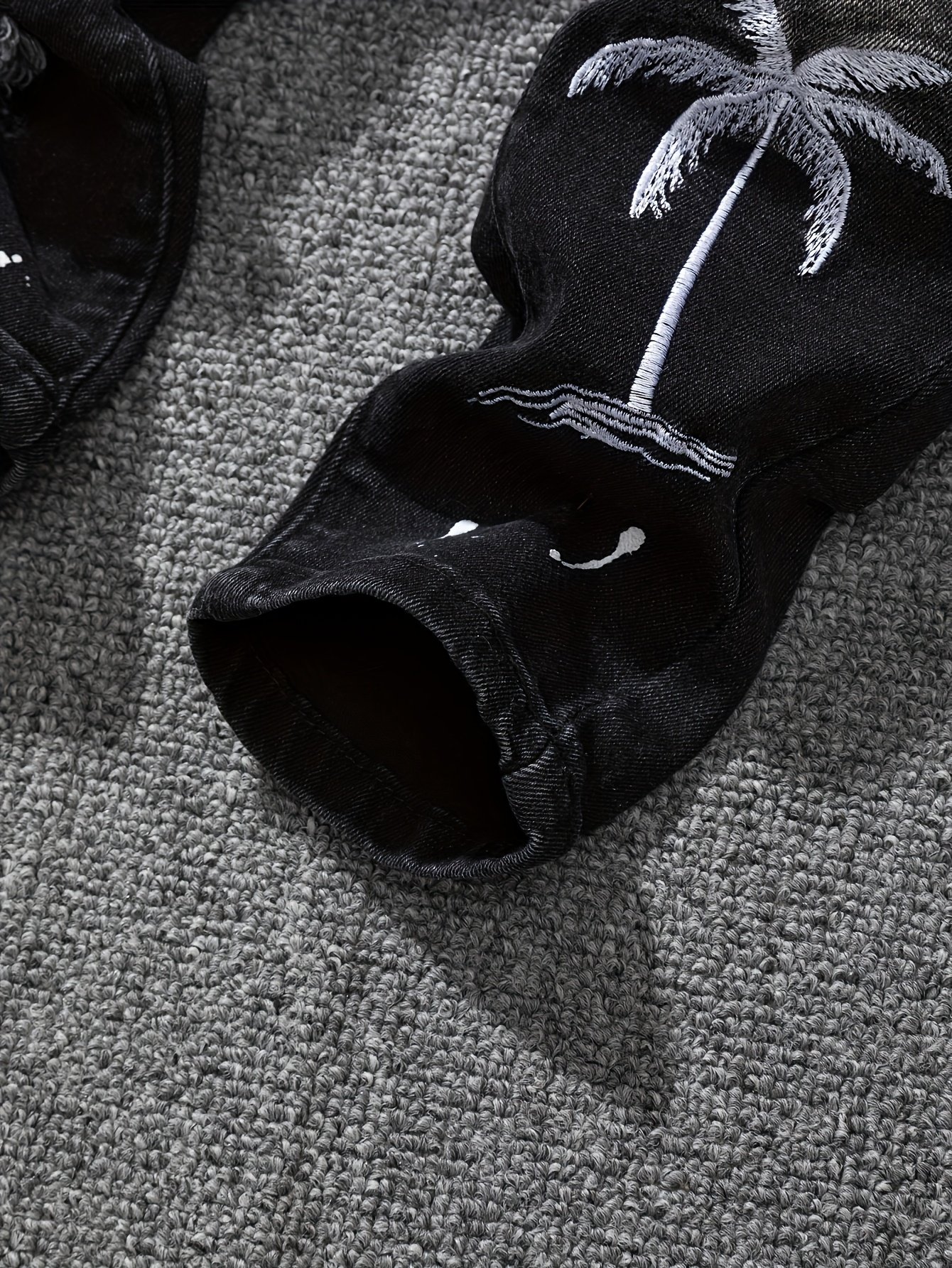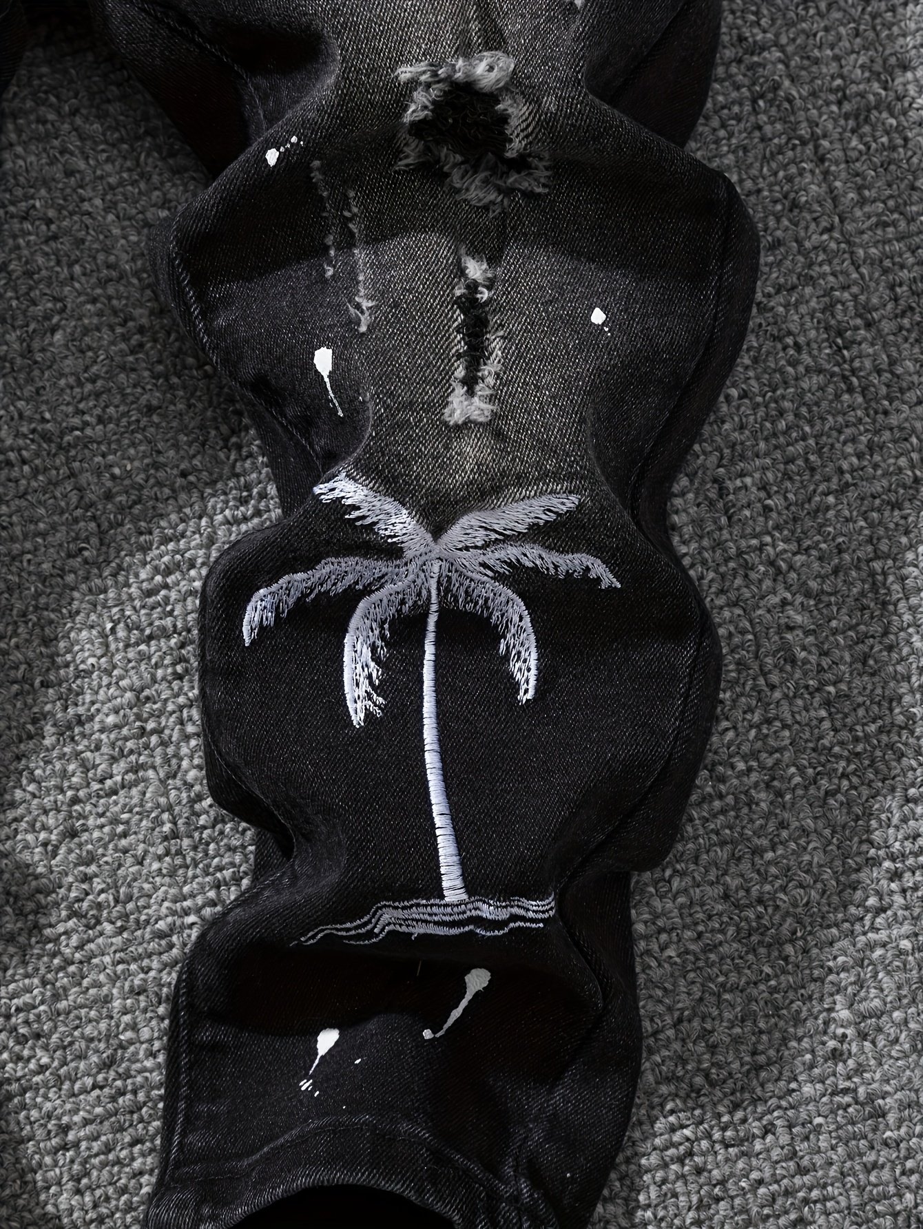 - Unique and Modern Design: Features a stylish Tie-Dye pattern with ripped and bold details, along with distinctive letter and palm tree embroidery that adds an artistic touch and a modern street vibe.
