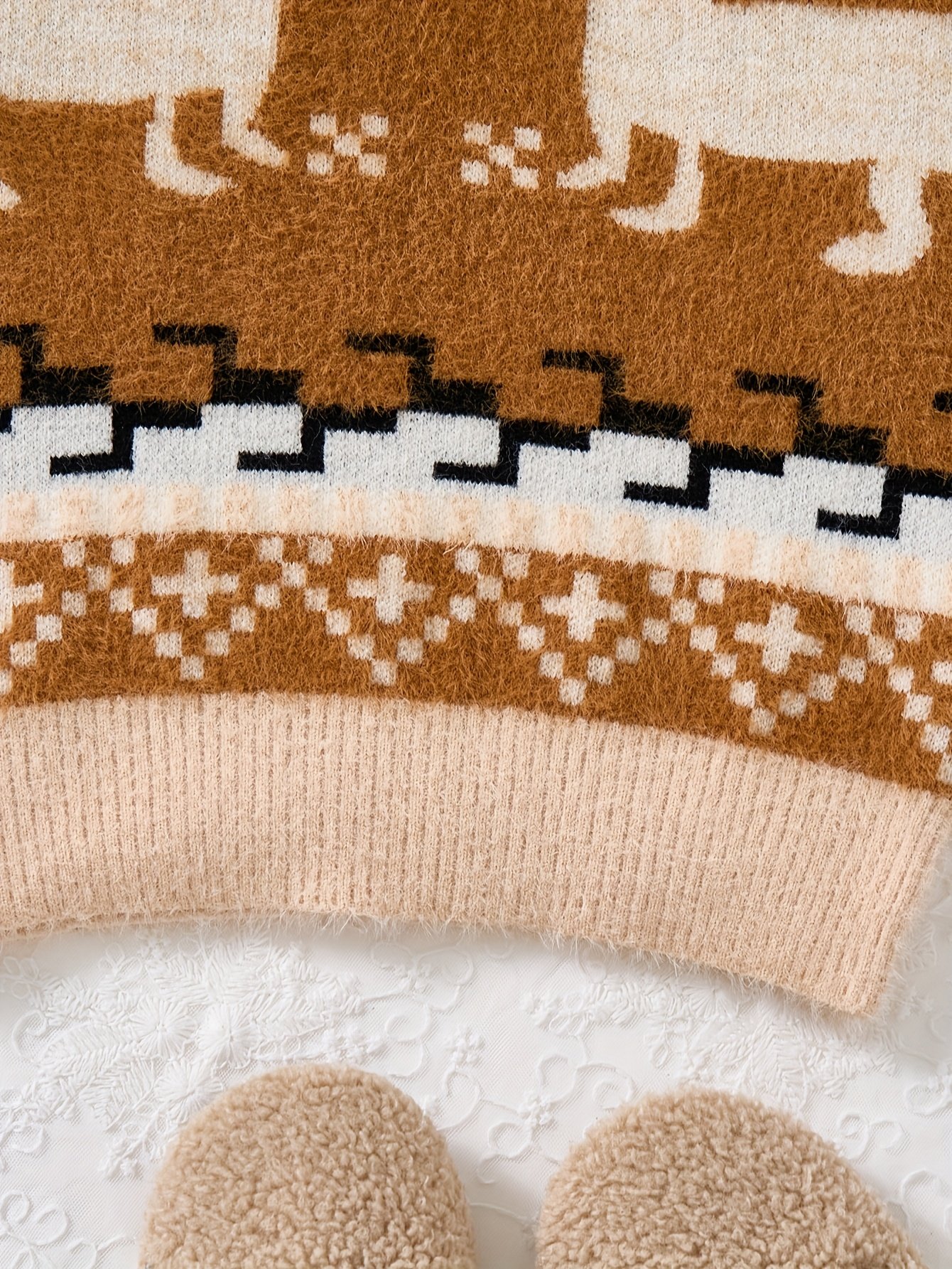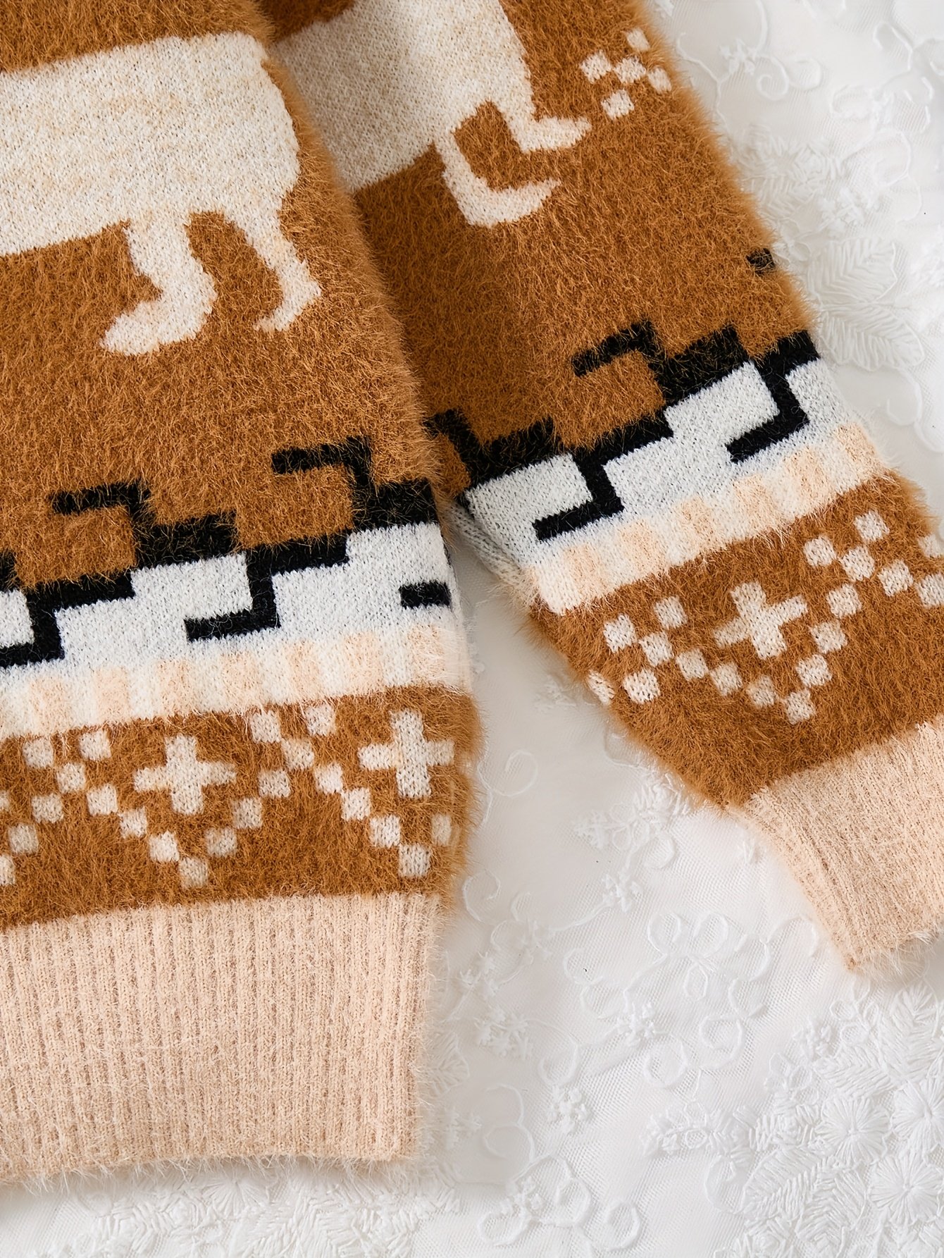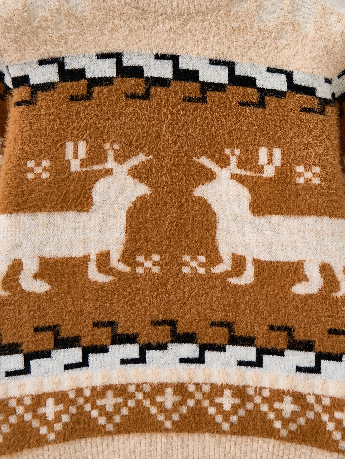 • Captivating Festive Design: The sweater features an elegant “Color Block” design that blends warm brown and serene beige tones, adorned with a charming reindeer print to add a touch of holiday magic and joy to your little one’s look.