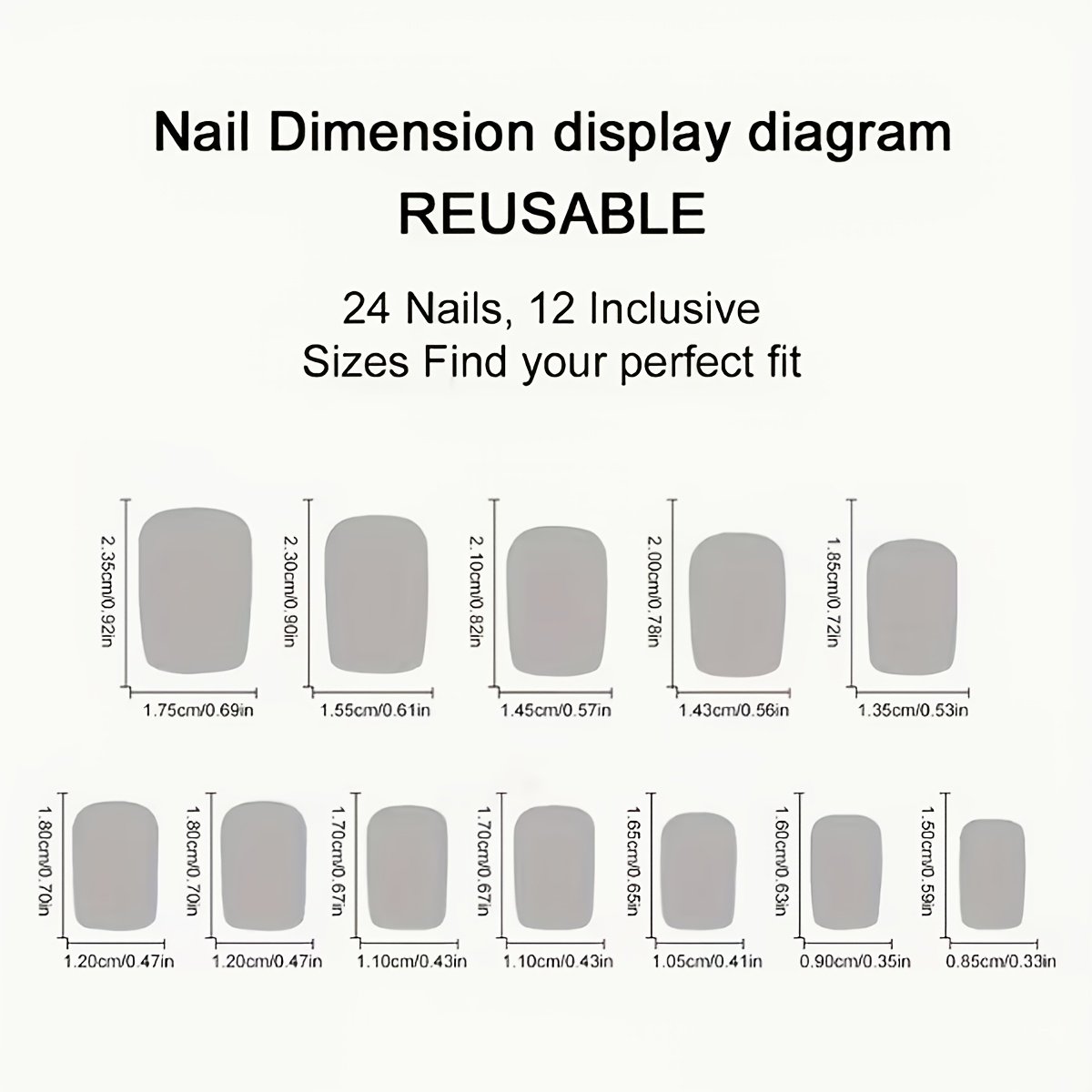 - Comprehensive Set for Every Hand: The set contains 24 pieces in various sizes, ensuring a perfect fit for all your nails. Ready to meet your beauty needs, whether for a quick daily look or for dazzling brilliance at the most splendid parties and special occasions.