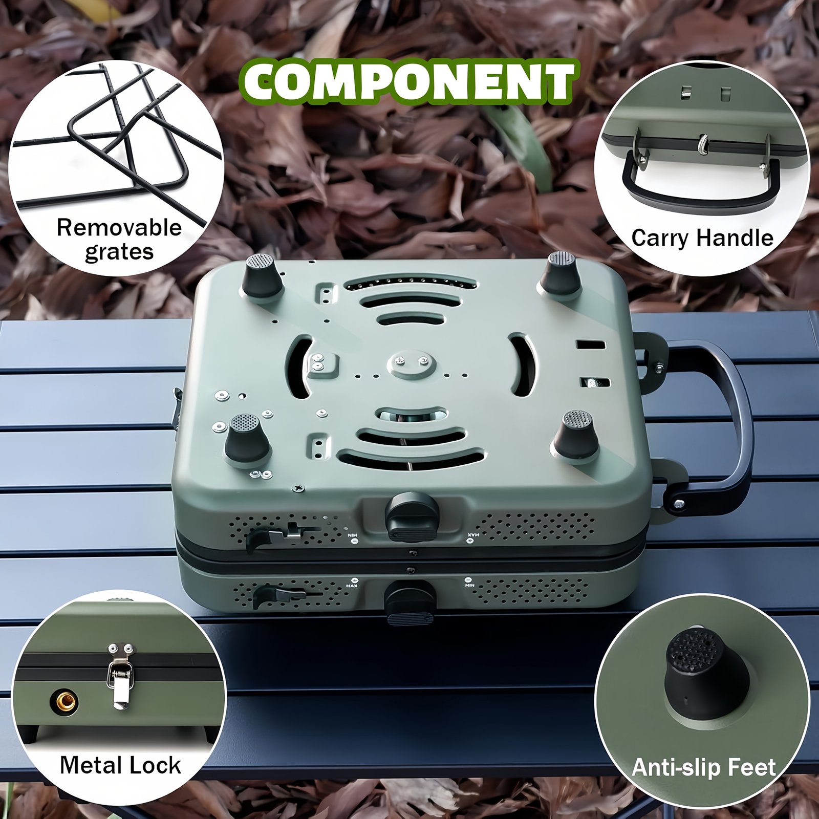 - تصميم ثنائي الشعلات: استمتع بمرونة طهي طبقين في نفس الوقت، مما يوفر لك الوقت والجهد لإعداد وليمة كاملة في قلب الطبيعة.