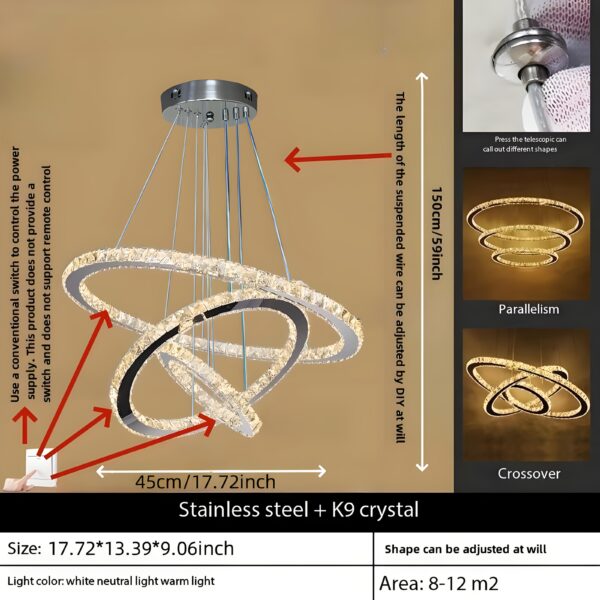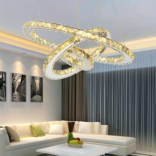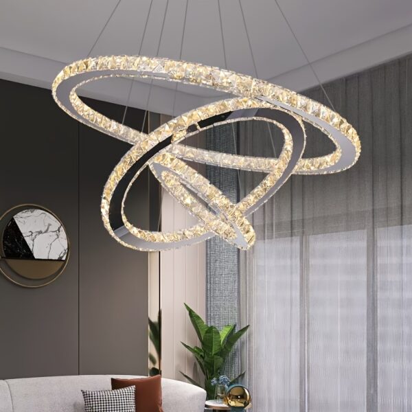 • تصميم فني ثلاثي الأبعاد: شاهد كيف تتحول غرفتك إلى معرض فني مع هذه الثريا ذات الدوائر الكريستالية الثلاث المتشابكة، تصميم عصري فاخر يلامس السماء ويُضيف عمقاً وجمالاً فريداً لديكور منزلك.