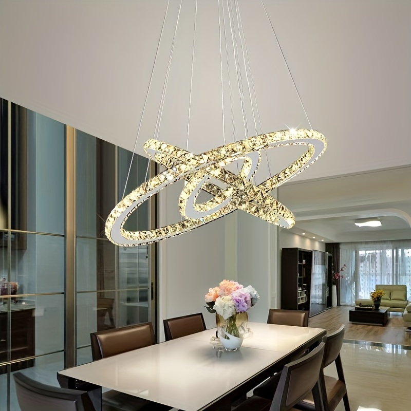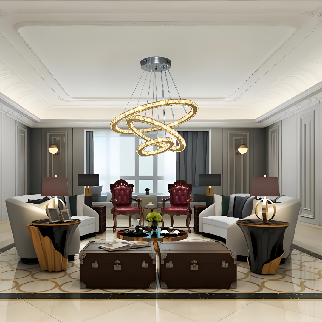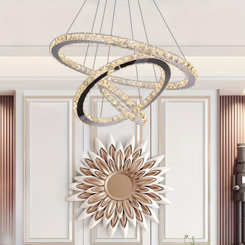 • تصميم فني ثلاثي الأبعاد: شاهد كيف تتحول غرفتك إلى معرض فني مع هذه الثريا ذات الدوائر الكريستالية الثلاث المتشابكة، تصميم عصري فاخر يلامس السماء ويُضيف عمقاً وجمالاً فريداً لديكور منزلك.