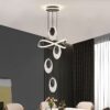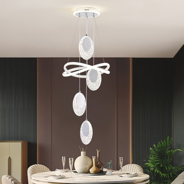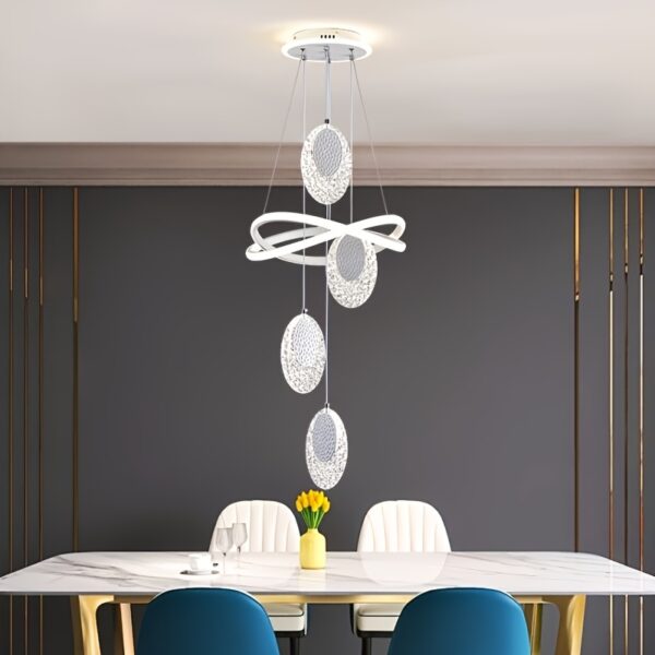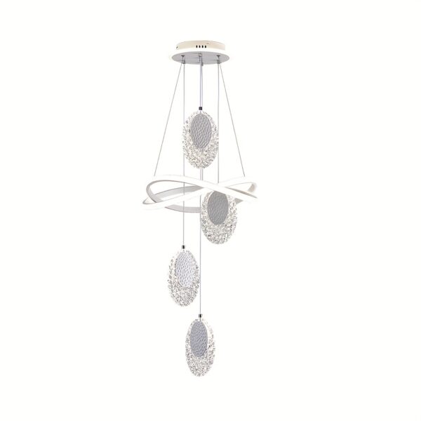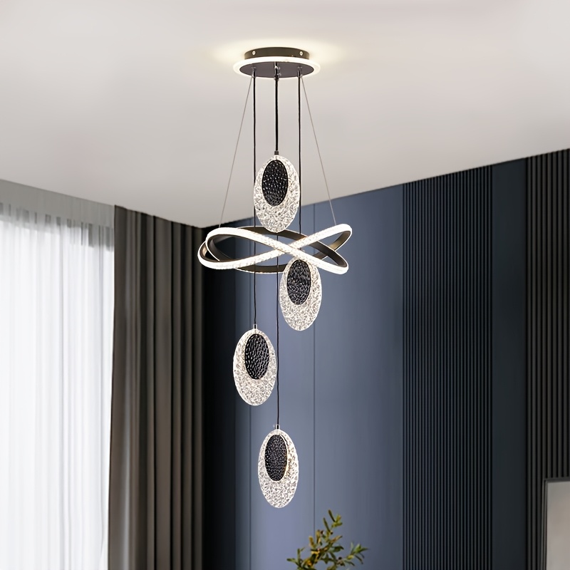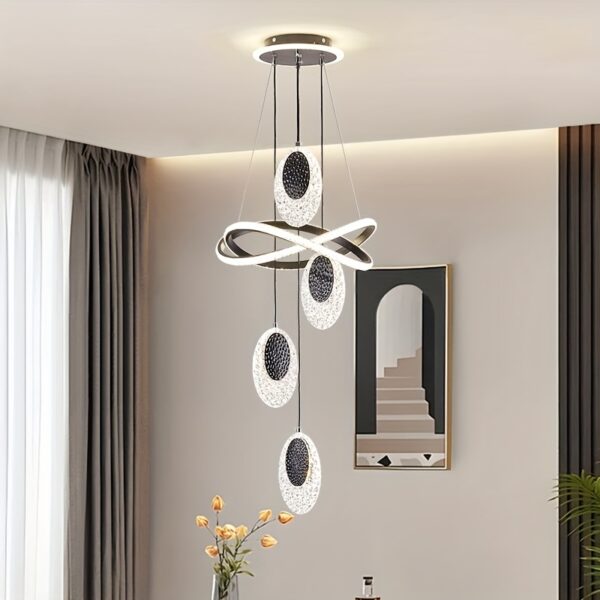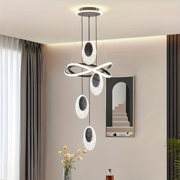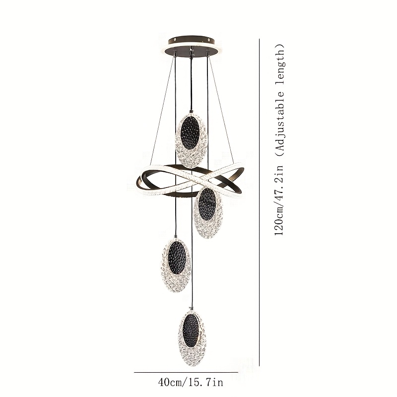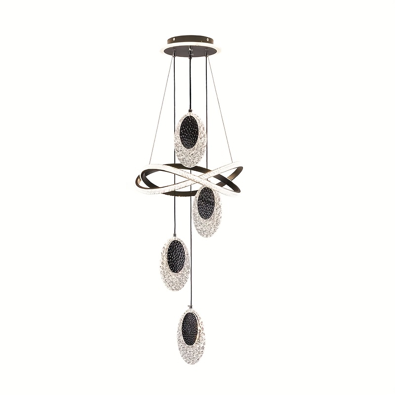 • تصميم فني آسر: تتميز هذه الثريا بتصميمها المعماري المذهل الذي يجمع بين أربعة رؤوس إضاءة بيضاوية الشكل متناسقة وحلقة ضوئية محيطية أنيقة، مما يخلق تحفة بصرية عصرية تُثري جمال أي مساحة وتضفي عليها لمسة فريدة من الأناقة والتطور.
