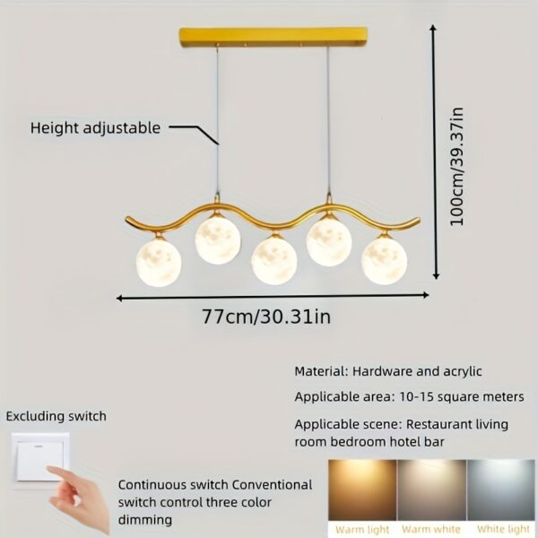 - تصميم مستوحى من القمر ثلاثي الأبعاد: استمتع بجمال فريد ينبعث من تصميم كروي أنيق يحاكي سحر القمر، معززاً بلمسة ذهبية فاخرة لإطار معدني يضفي رقيًا لا مثيل له على مساحتك.