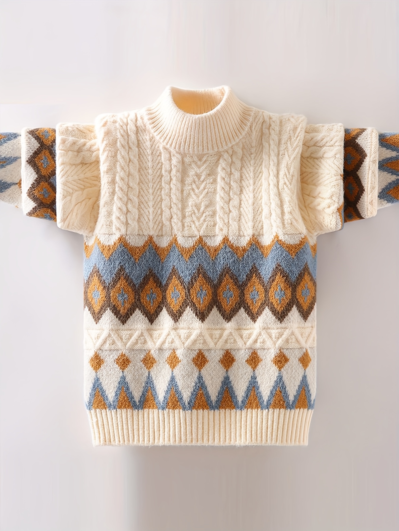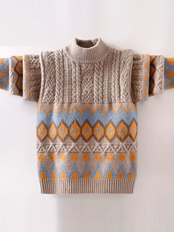 - تصميم عصري وجذاب: تتميز بنقوش هندسية أنيقة وتدرجات لونية متناغمة من البيج والبني والأزرق والأبيض، لتمنح ابنك إطلالة عصرية ومتميزة في كل مناسبة.