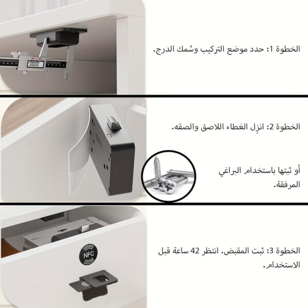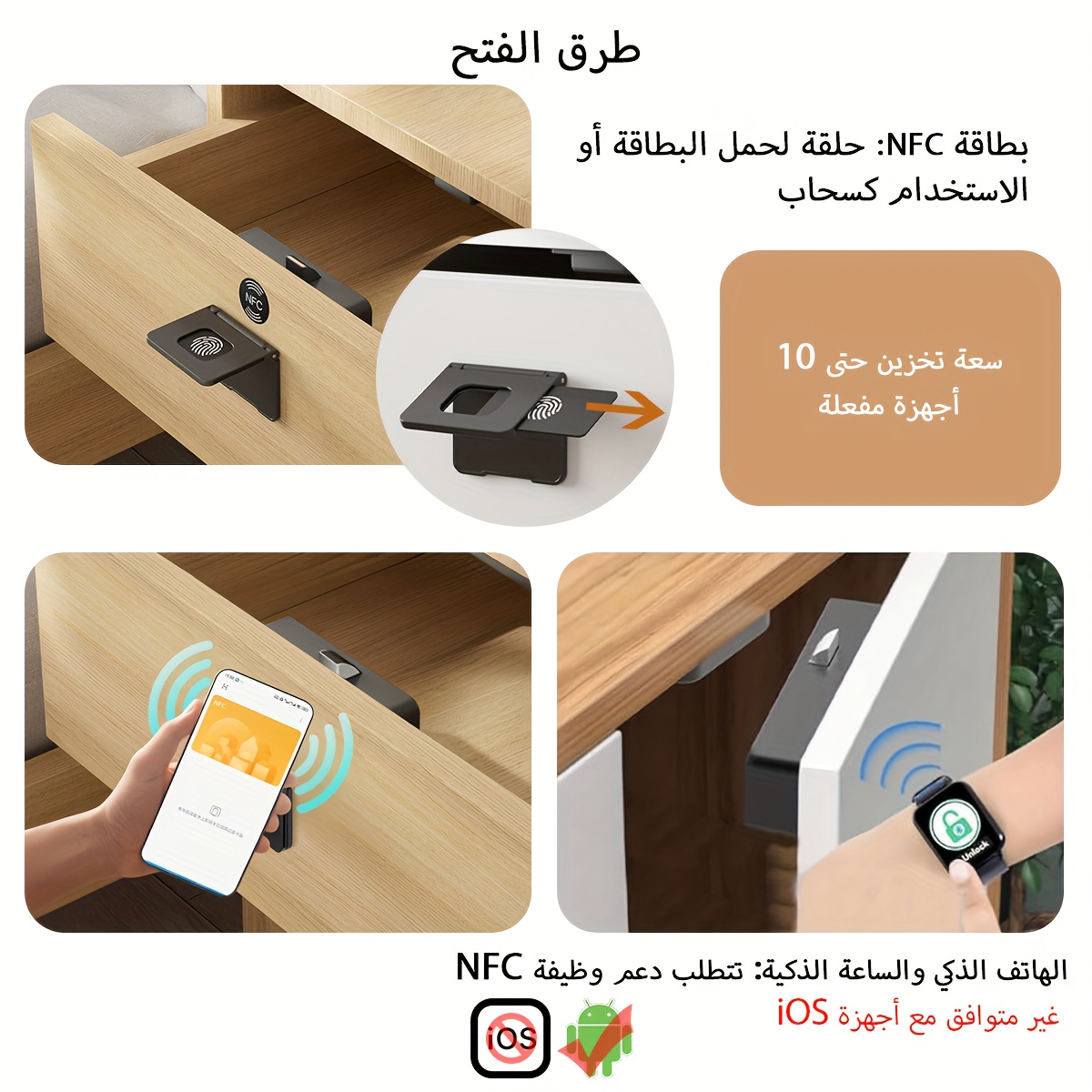 • فتح ذكي ببطاقة NFC: انسَ عناء البحث عن المفاتيح! قم بفتح درجك أو خزانتك بلمسة بسيطة ببطاقة NFC المرفقة، لتجربة وصول سلسة وسريعة لا مثيل لها.