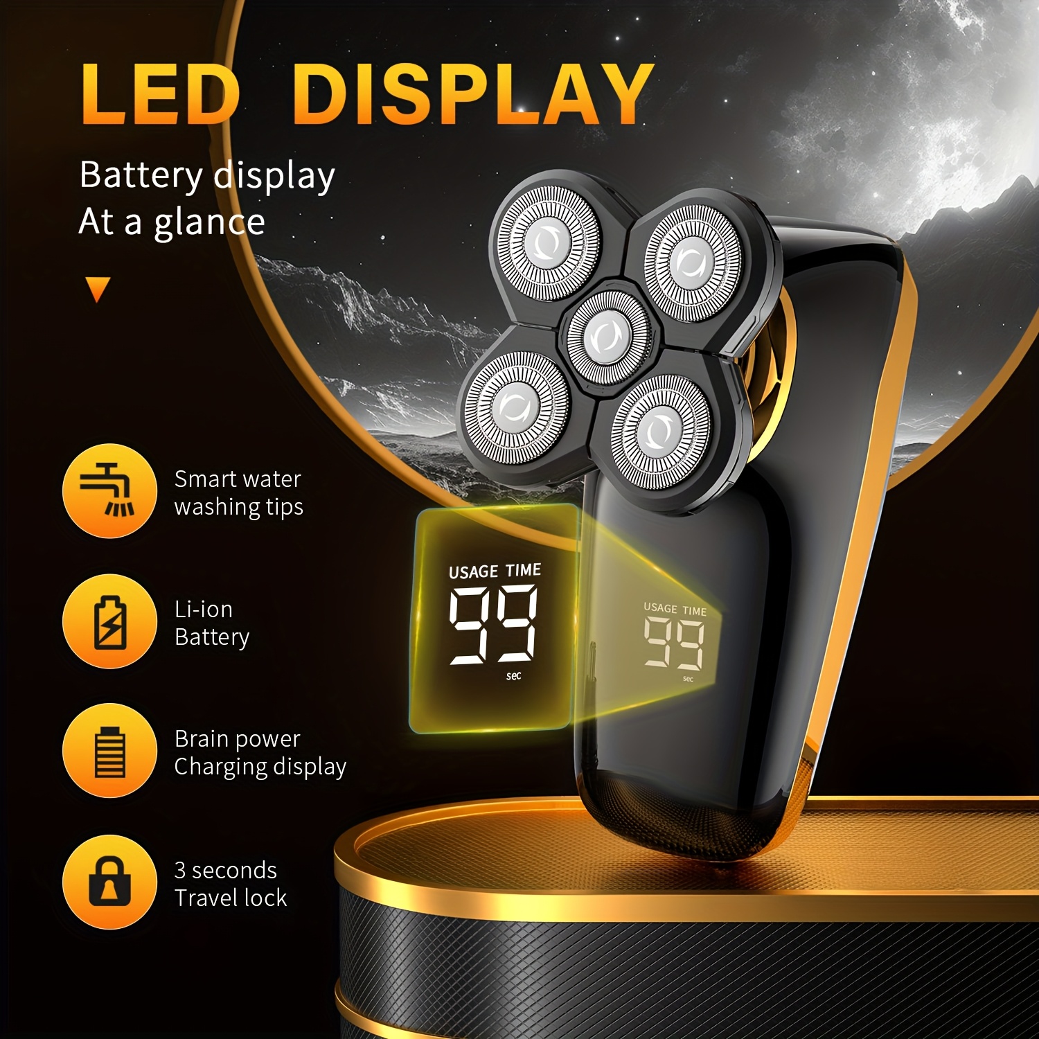 • شفرات دوارة فائقة الدقة: مزودة بخمس شفرات حادة ومتينة من الفولاذ المقاوم للصدأ، تضمن لك حلاقة دقيقة وناعمة للغاية دون تهيج للبشرة، وتتكيف بمرونة مع منحنيات الوجه والرقبة.