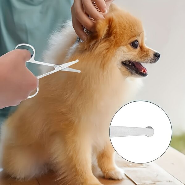 - مقص منحني بتصميم احترافي: مصمم خصيصاً ليمنحك دقة متناهية في المناطق الدقيقة والحساسة مثل الذيل، البطن، وحول العينين والأذنين، مما يضمن قصاً آمناً ويمنع الجروح أو التهيج، ويحافظ على راحة حيوانك الأليف القصوى.