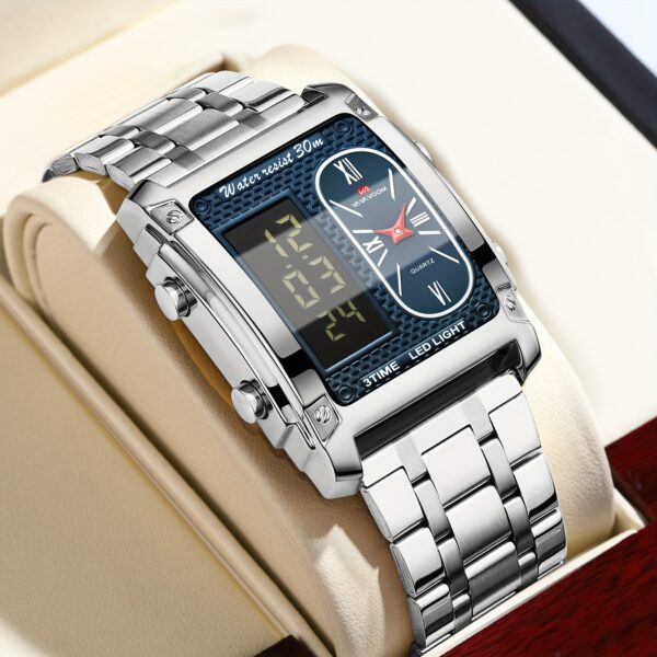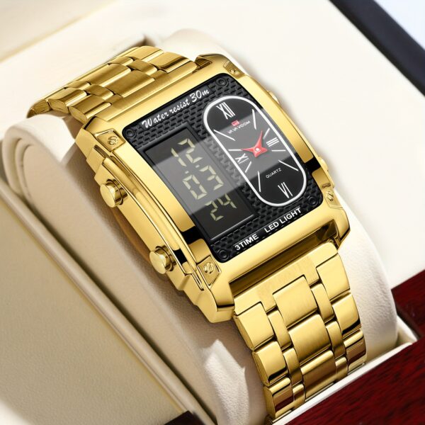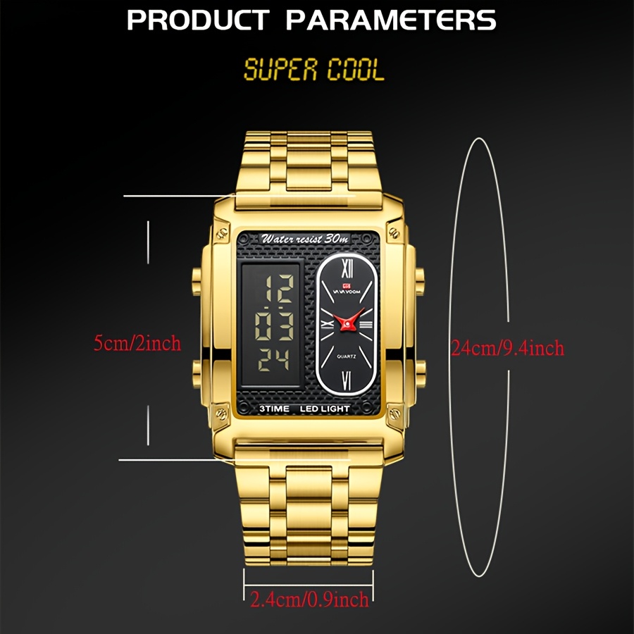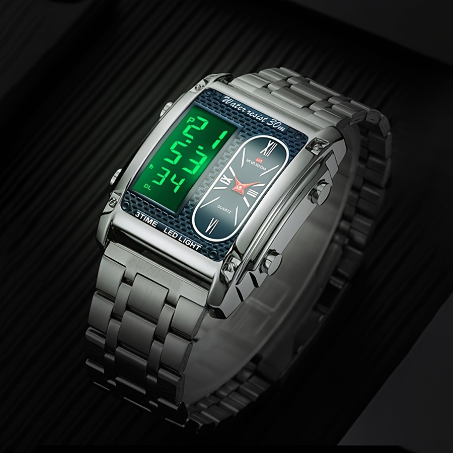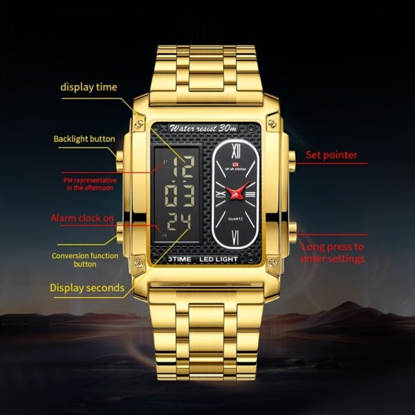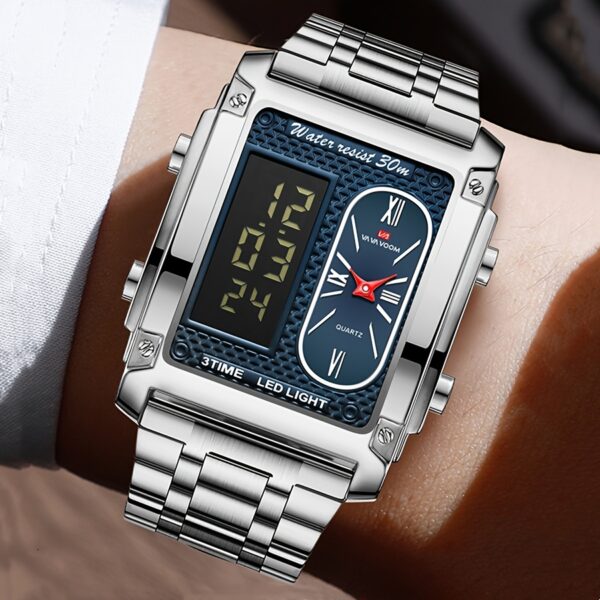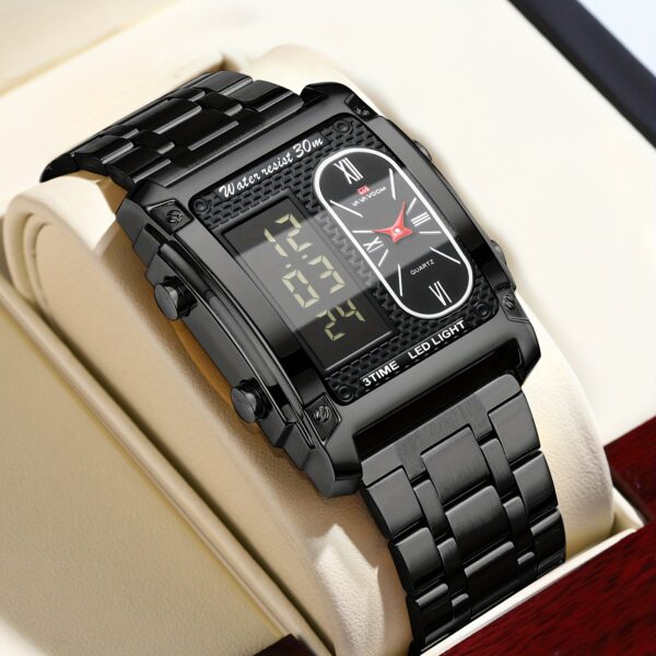 - هيكل قوي وشاشة مربعة فريدة: تتميز علبة الساعة المصنوعة من سبائك الزنك بقوة استثنائية، بينما يضفي القرص المربع لمسة عصرية وجريئة تميزك عن الآخرين.