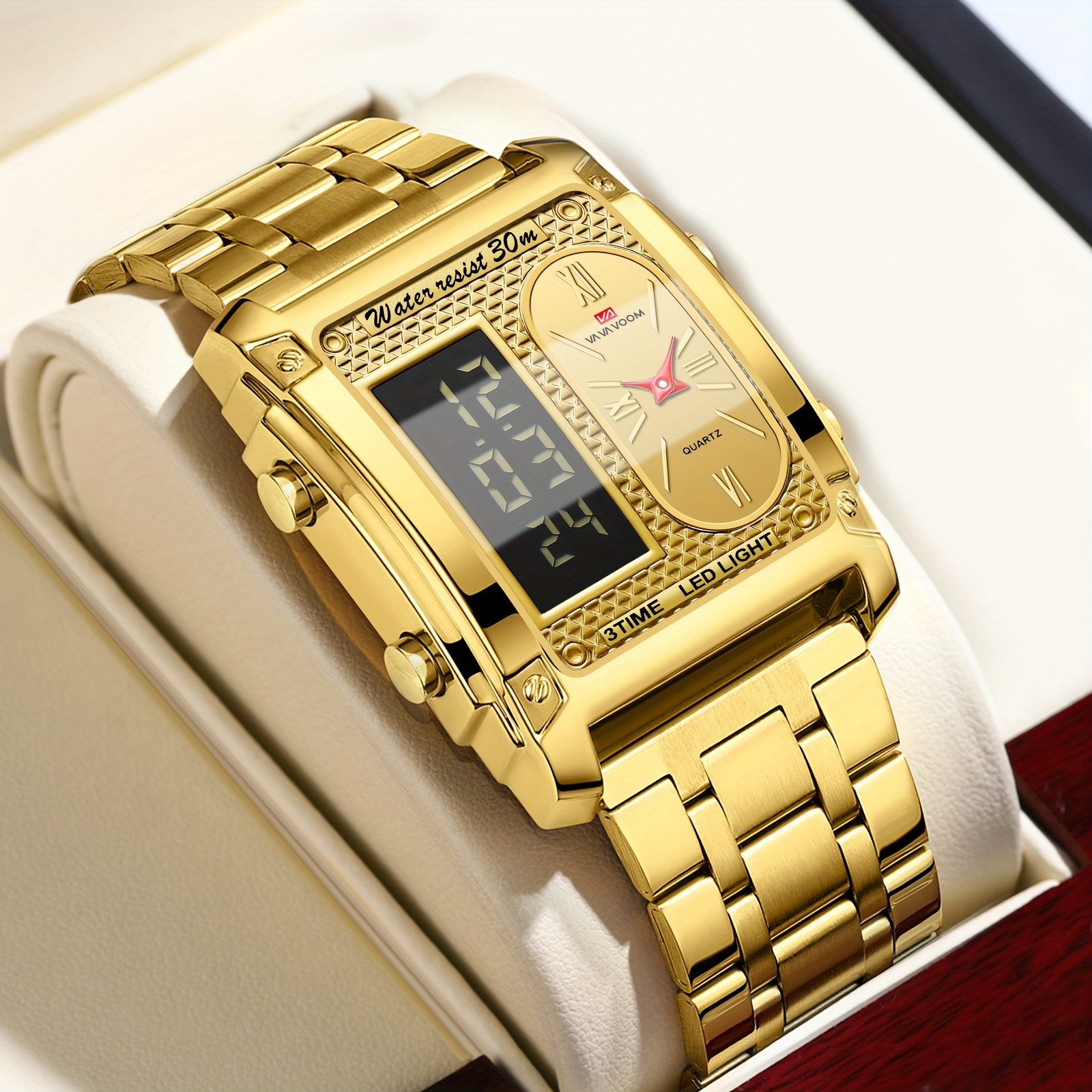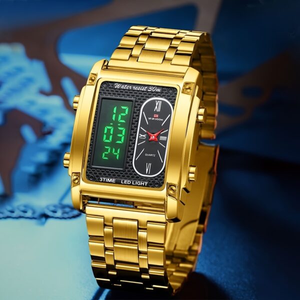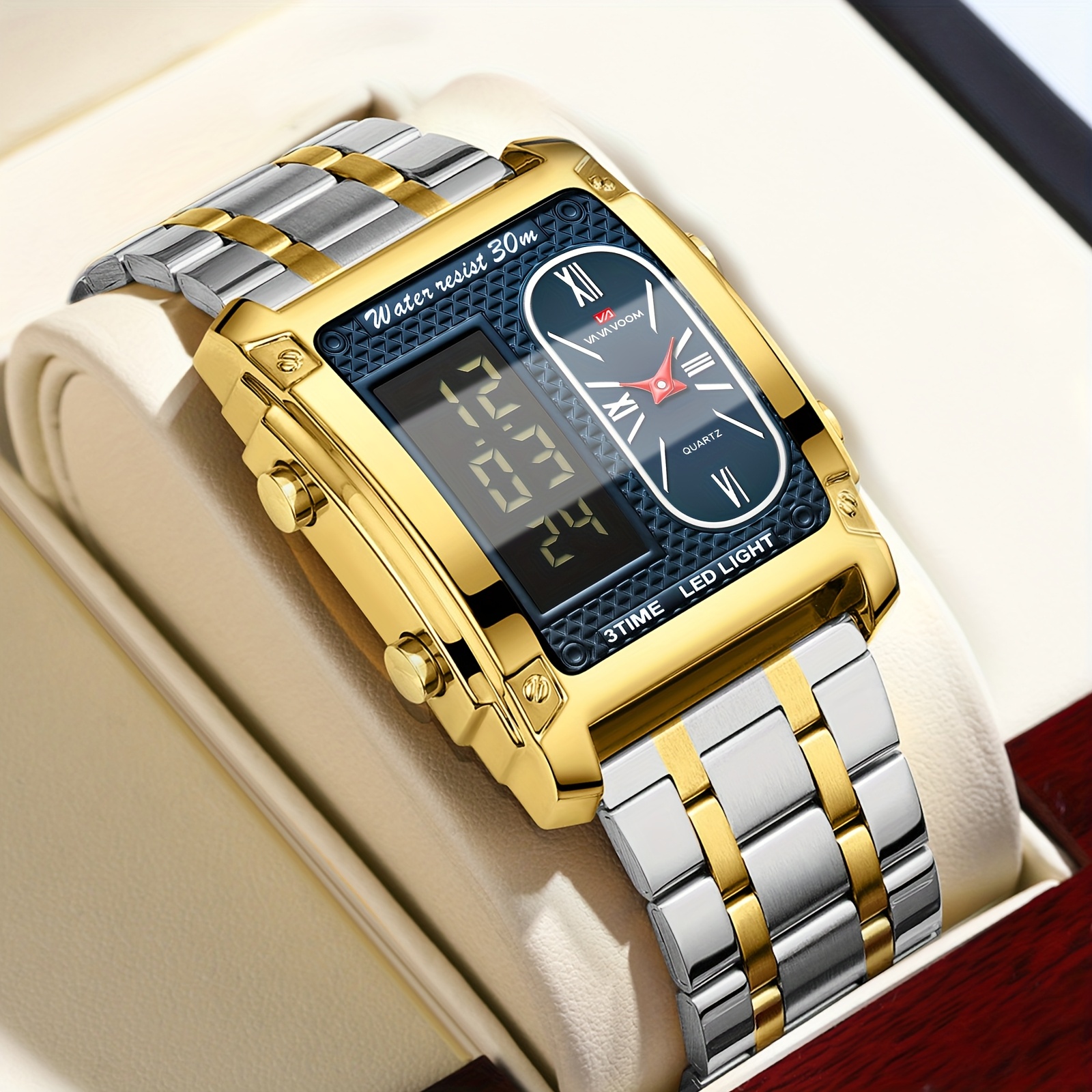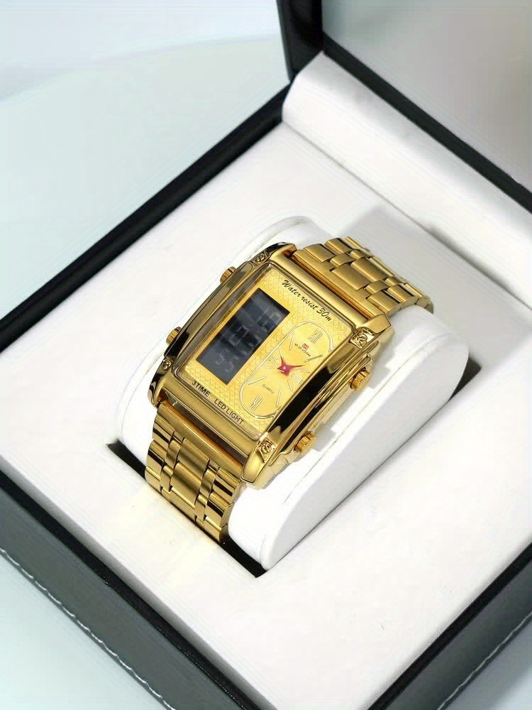 - هيكل قوي وشاشة مربعة فريدة: تتميز علبة الساعة المصنوعة من سبائك الزنك بقوة استثنائية، بينما يضفي القرص المربع لمسة عصرية وجريئة تميزك عن الآخرين.
