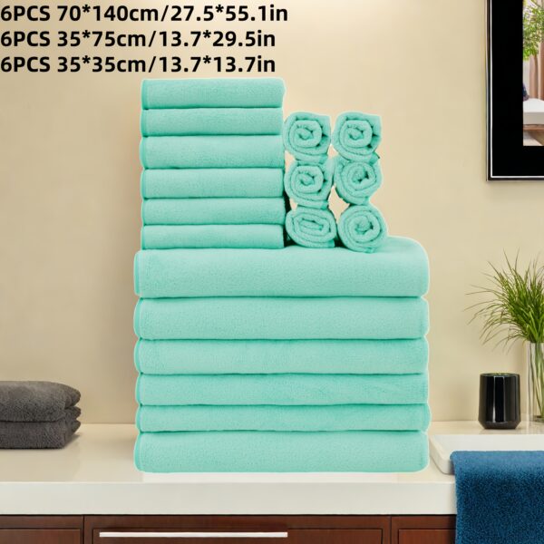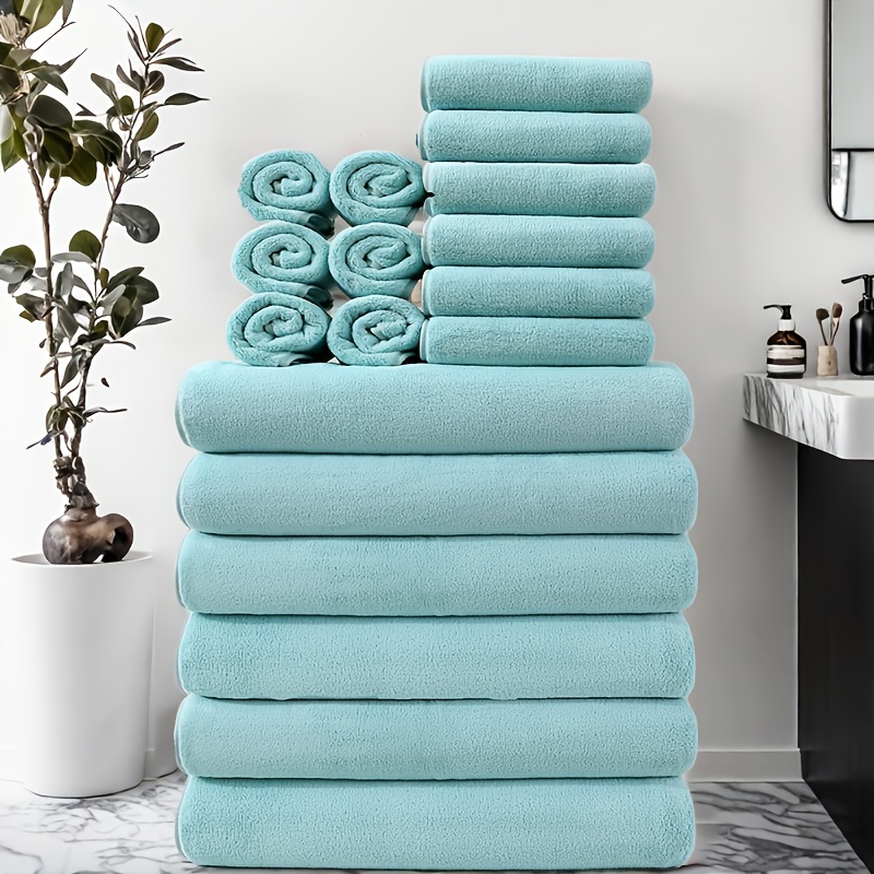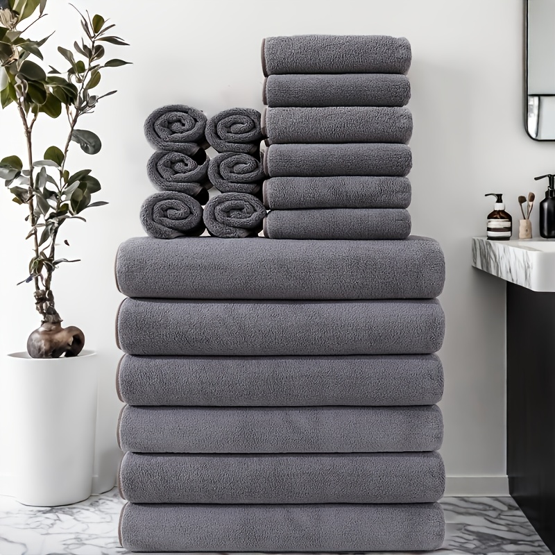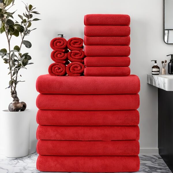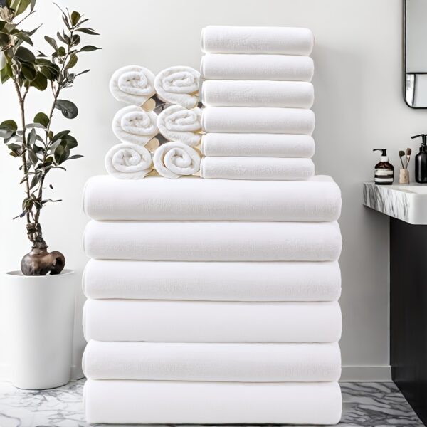 - طقم فاخر وشامل: استمتع بالراحة المطلقة مع هذا الطقم المكون من 18 قطعة، المصمم لتلبية جميع احتياجاتك المنزلية والاستخدامات المتنوعة، من مناشف استحمام إلى مناشف يد ووجه.