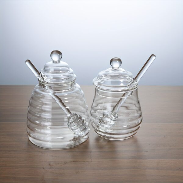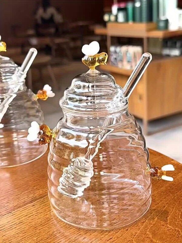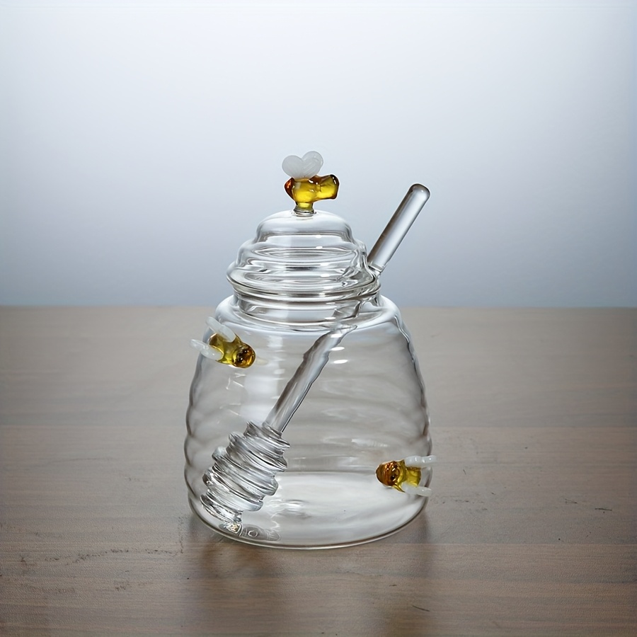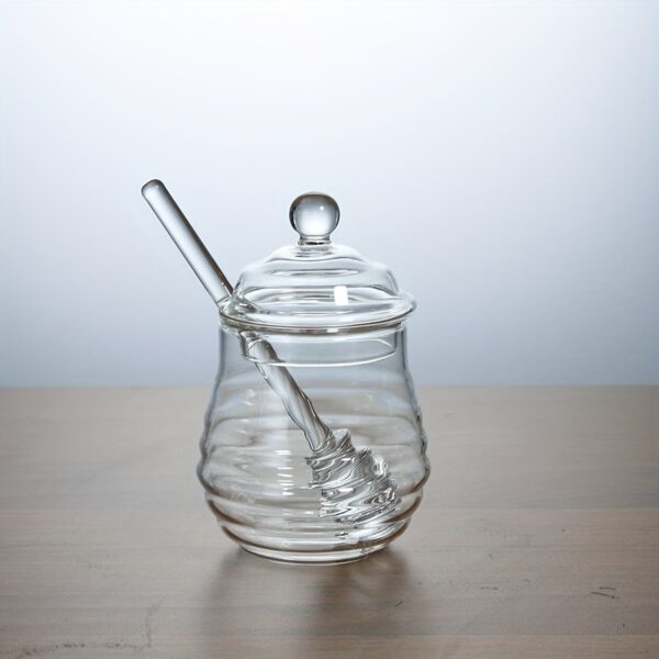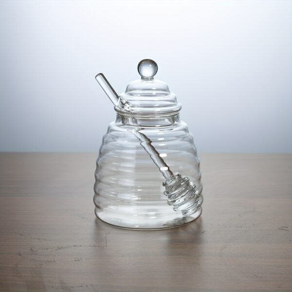 • ملعقة غمس مدمجة: وداعاً للفوضى! استمتع بملعقة عسل عملية ومدمجة تضمن لك سهولة الغرف والتقديم دون أي قطرات مزعجة، مما يحافظ على نظافة مائدتك ومطبخك دائماً.