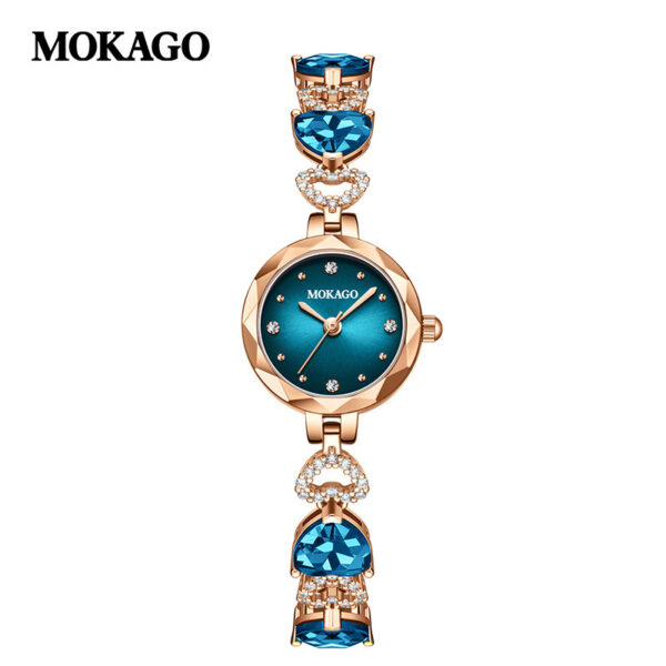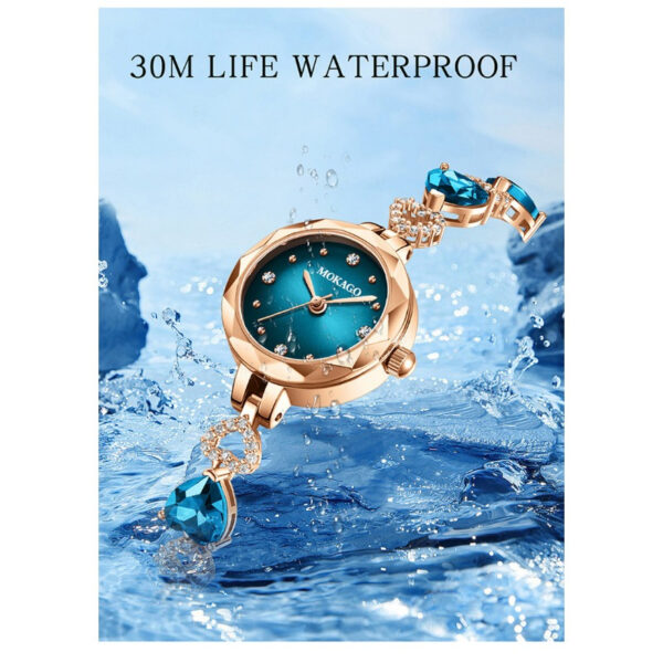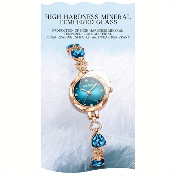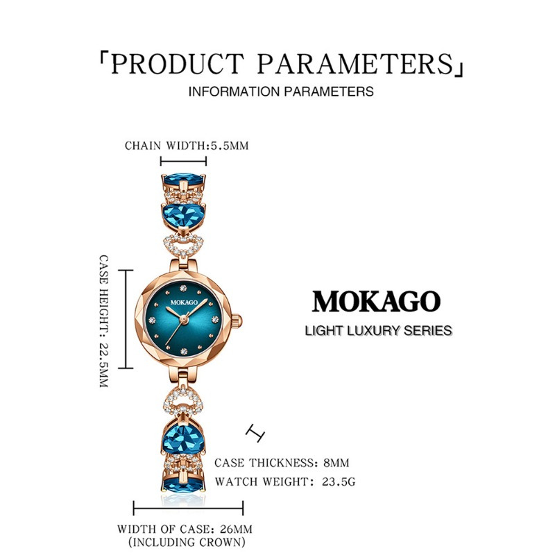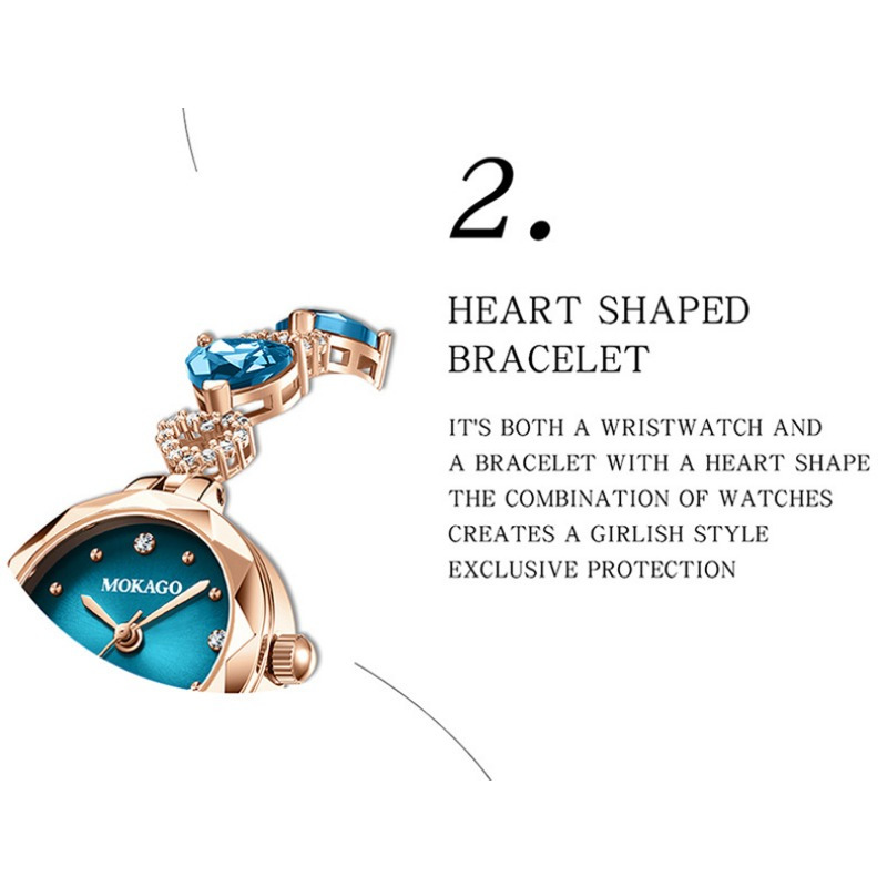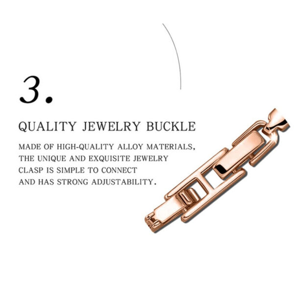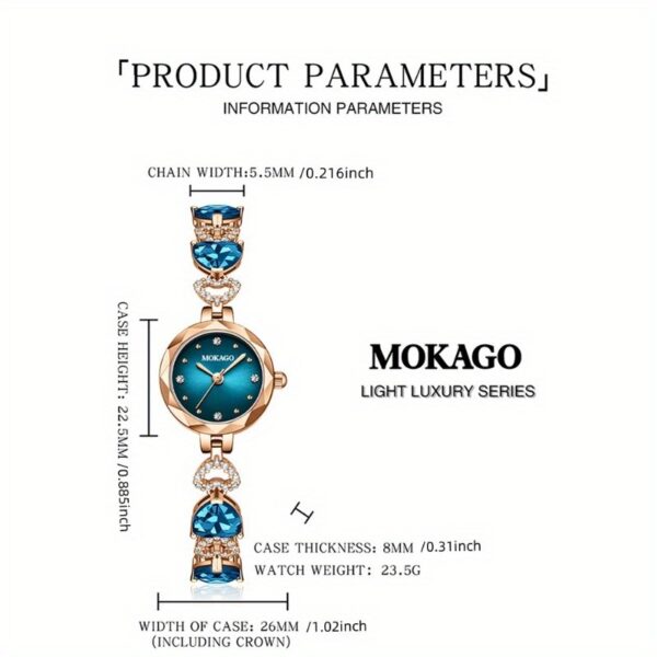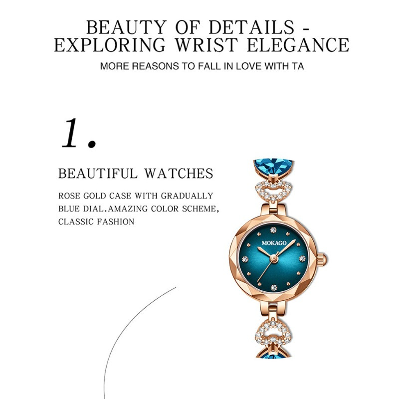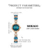 • خامات عالية الجودة: هيكل الساعة مصنوع من سبائك الزنك المتينة، مع سوار نحاسي يضمن لكِ المتانة والأناقة التي تدوم طويلاً.
