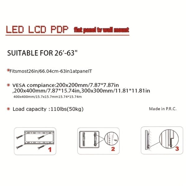 - توافق عالمي: يدعم مجموعة واسعة من الشاشات المسطحة بحجم 26 إلى 65 بوصة، بما في ذلك أنواع LCD، LED، OLED، و Plasma، ليناسب كل احتياجاتك.