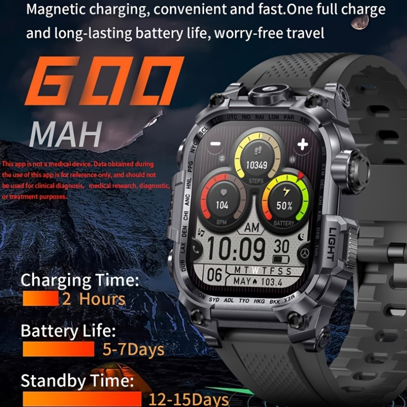 • بطارية جبارة تدوم طويلاً: بفضل بطارية الليثيوم بوليمر الضخمة بسعة 600 مللي أمبير، ستبقى ساعتك مشحونة وجاهزة لمواكبة أنشطتك لأيام طويلة، مع سهولة الشحن عبر USB.